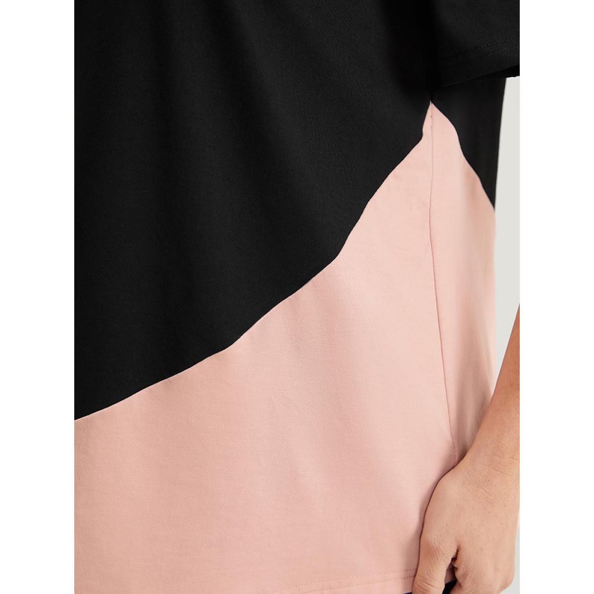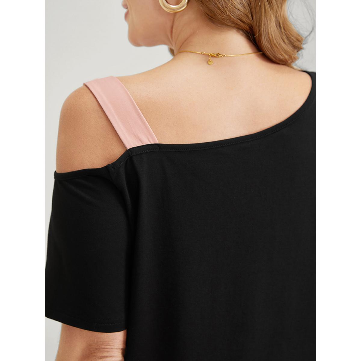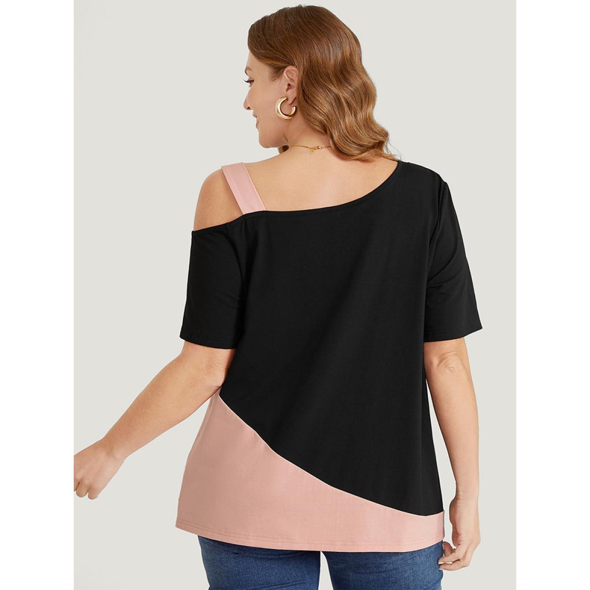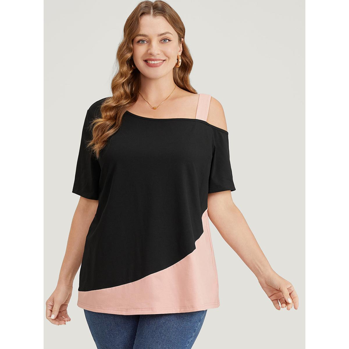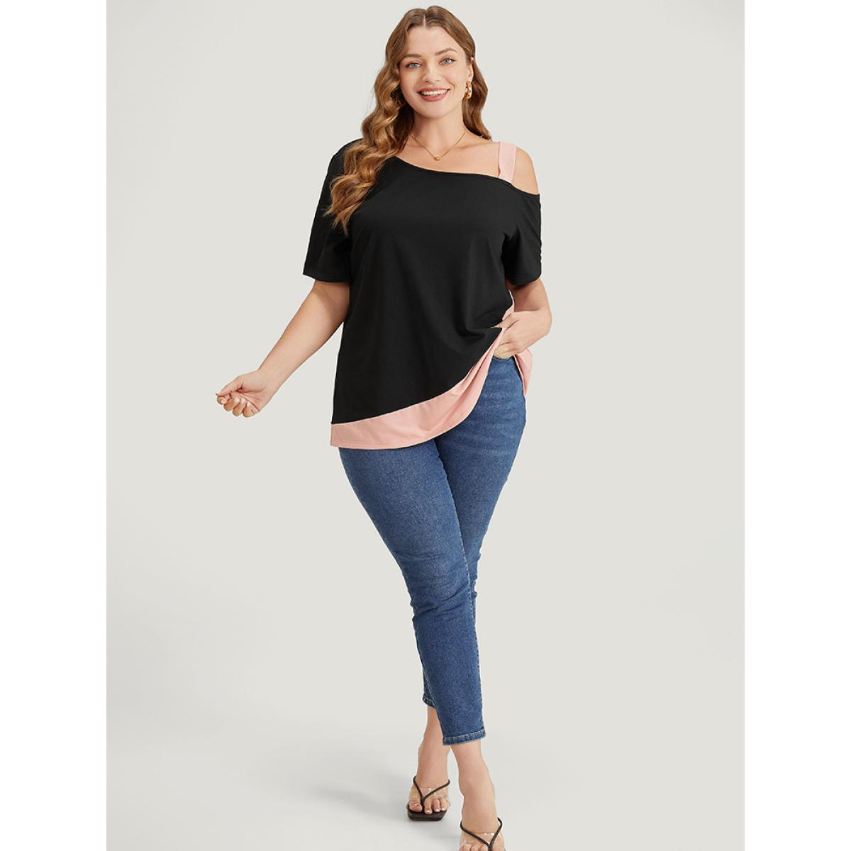 Plus Size Two Tone Asymmetrical Neck T-shirt Black Women Elegant Contrast Colorblock Asymmetrical Neck Dailywear T-shirts BloomChic 22-24/3X