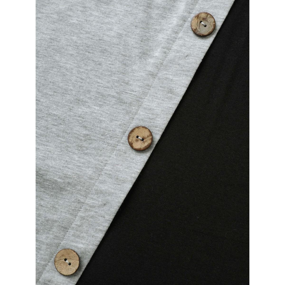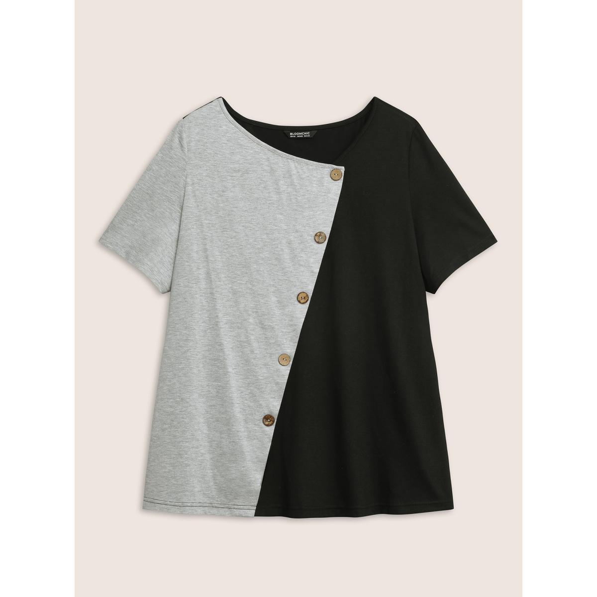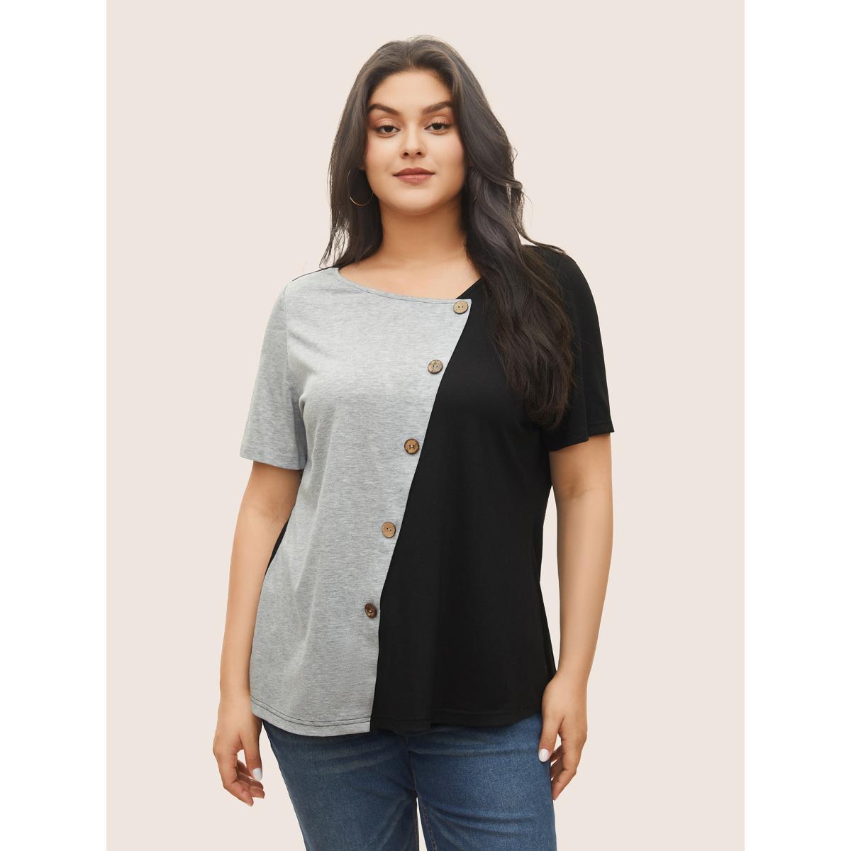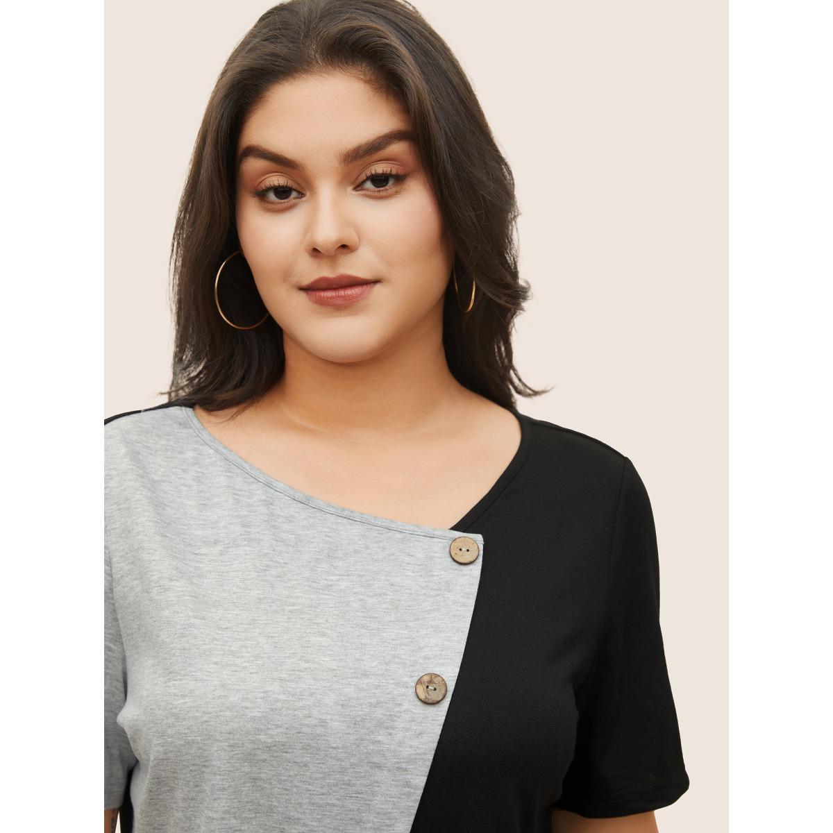 Plus Size Two Tone Button Detail Asymmetrical Neck T-shirt Black Women Casual Contrast Plain Asymmetrical Neck Everyday T-shirts BloomChic 14-16/1X