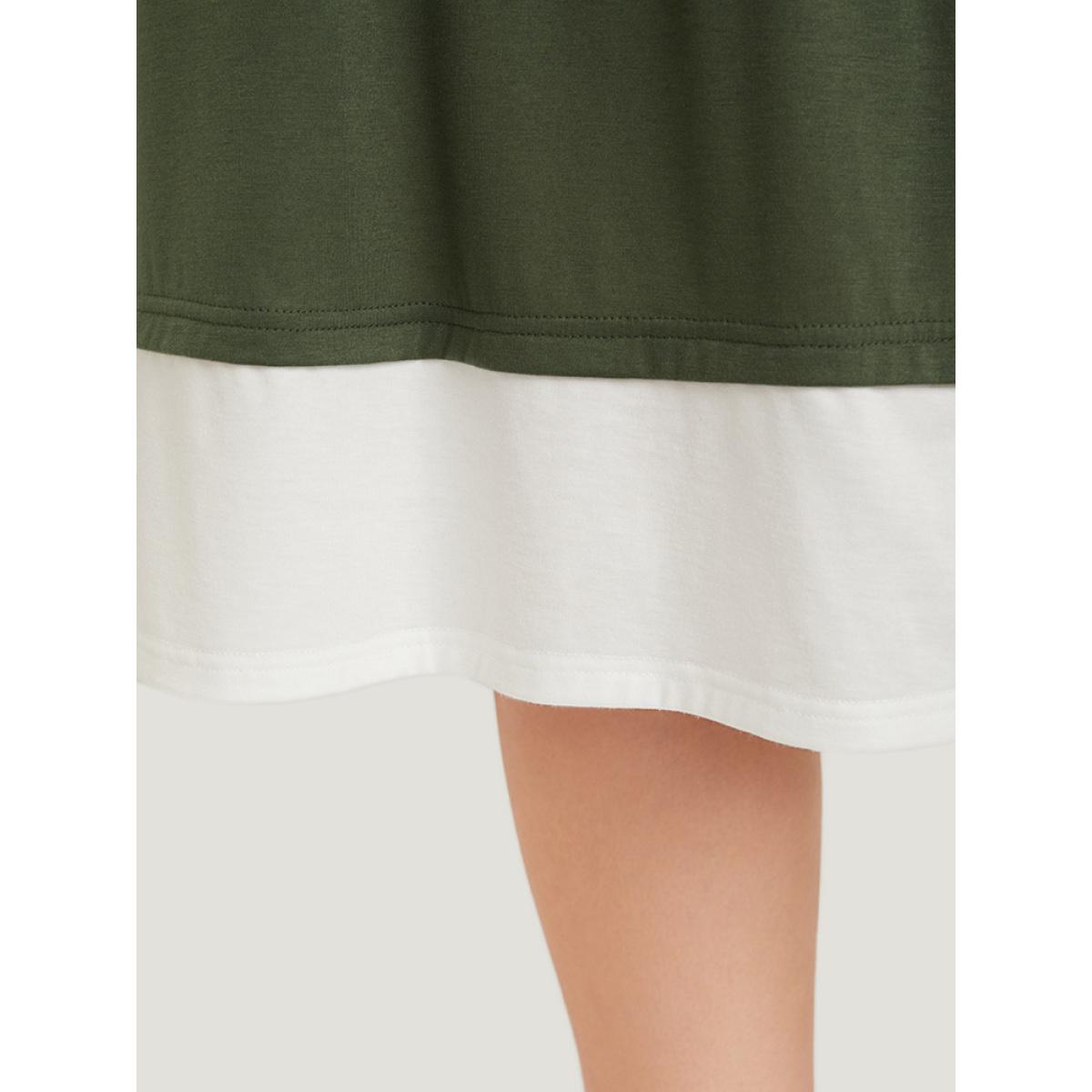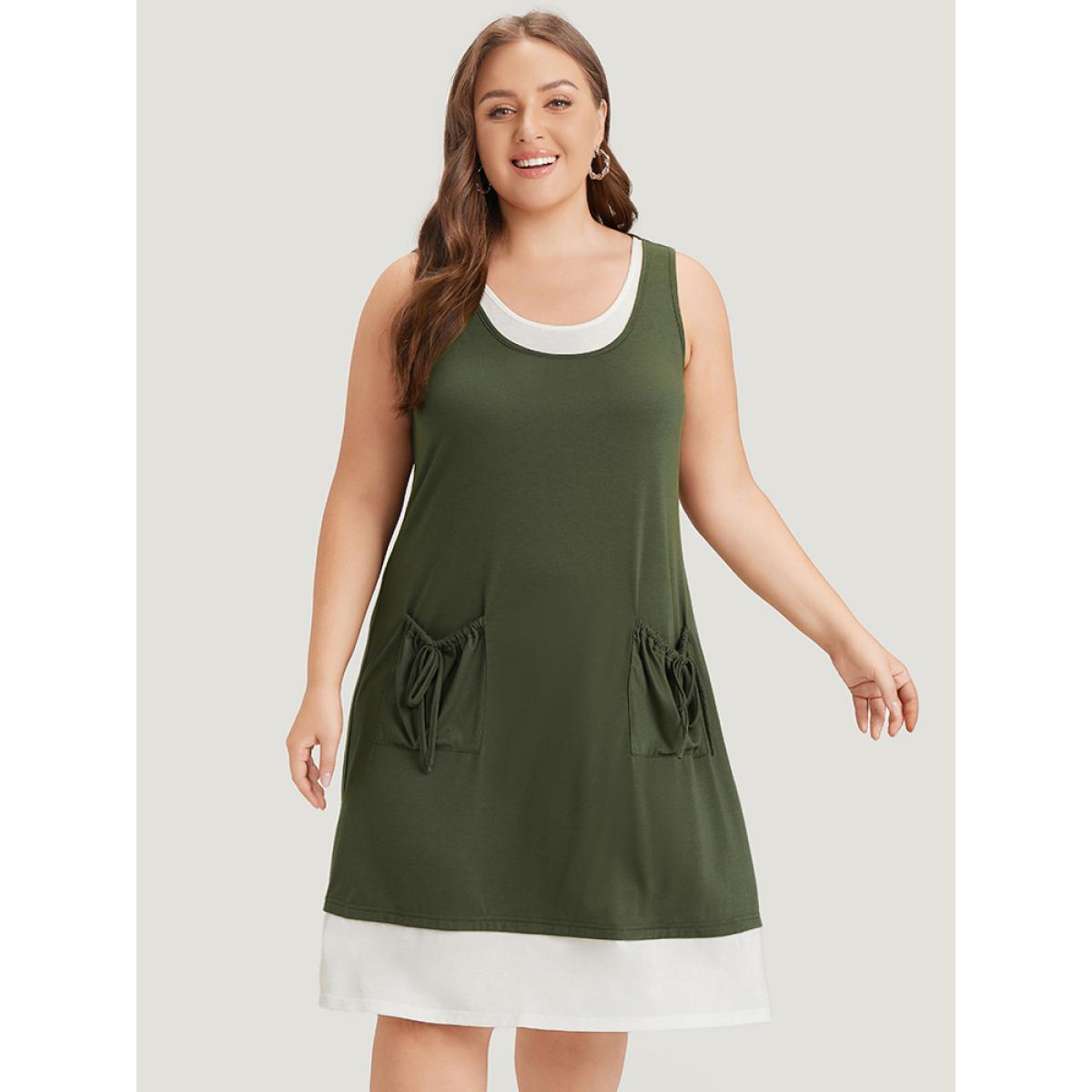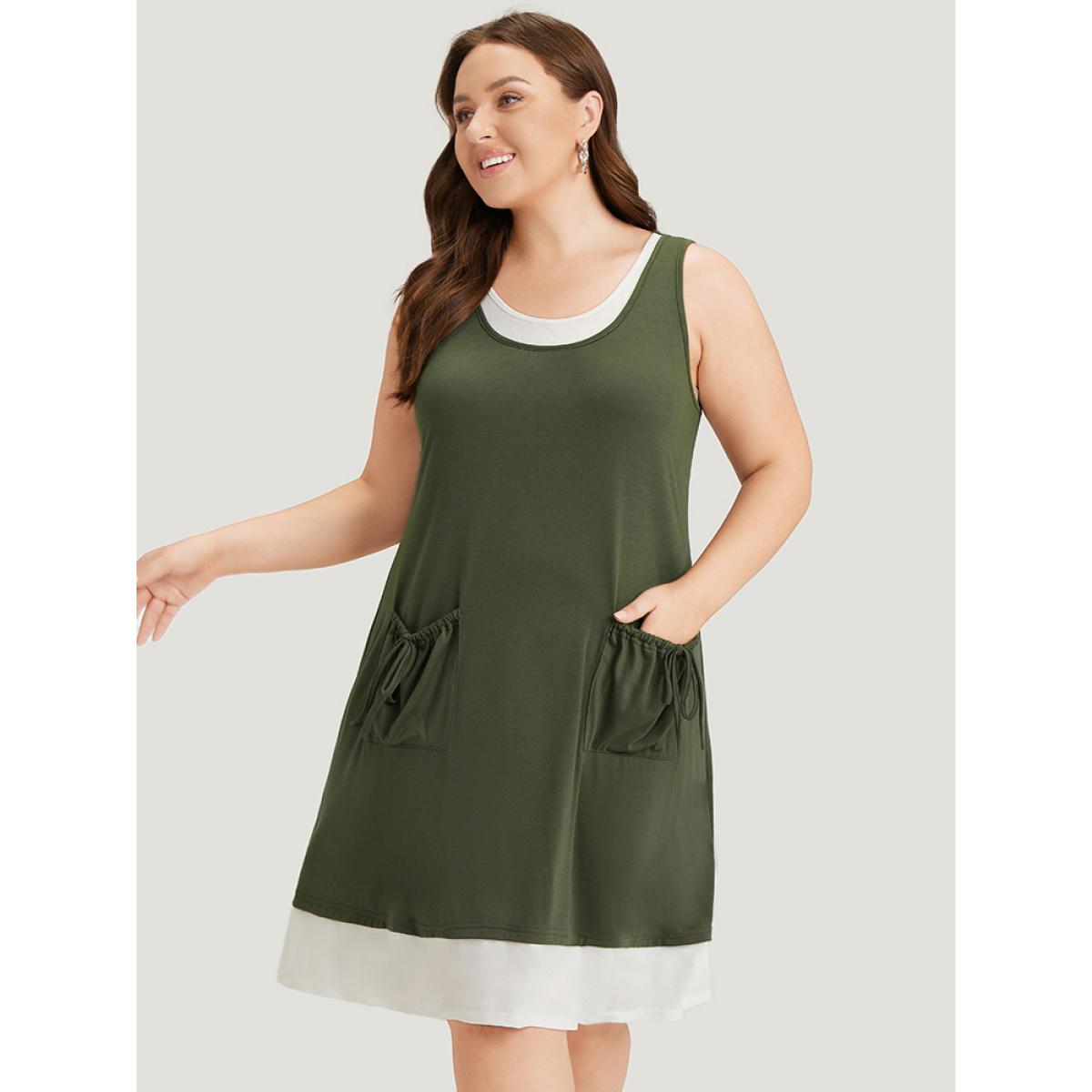 Plus Size Two Tone Knot Pocket Patchwork Dress ArmyGreen Women Casual Contrast Round Neck Sleeveless Curvy Knee Dress BloomChic 26/4X