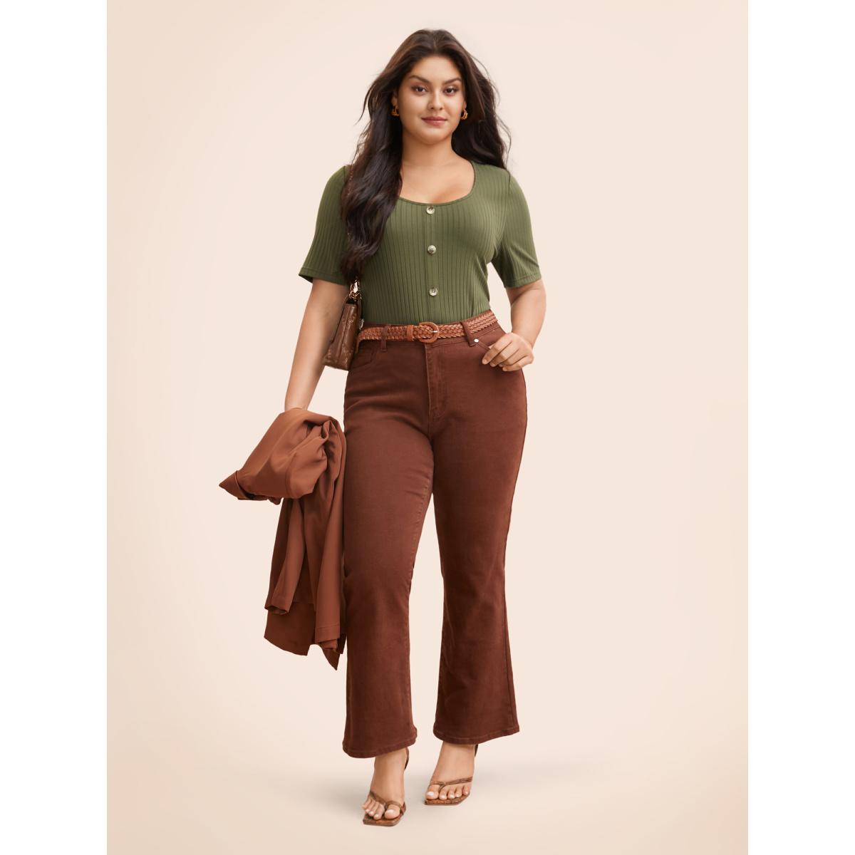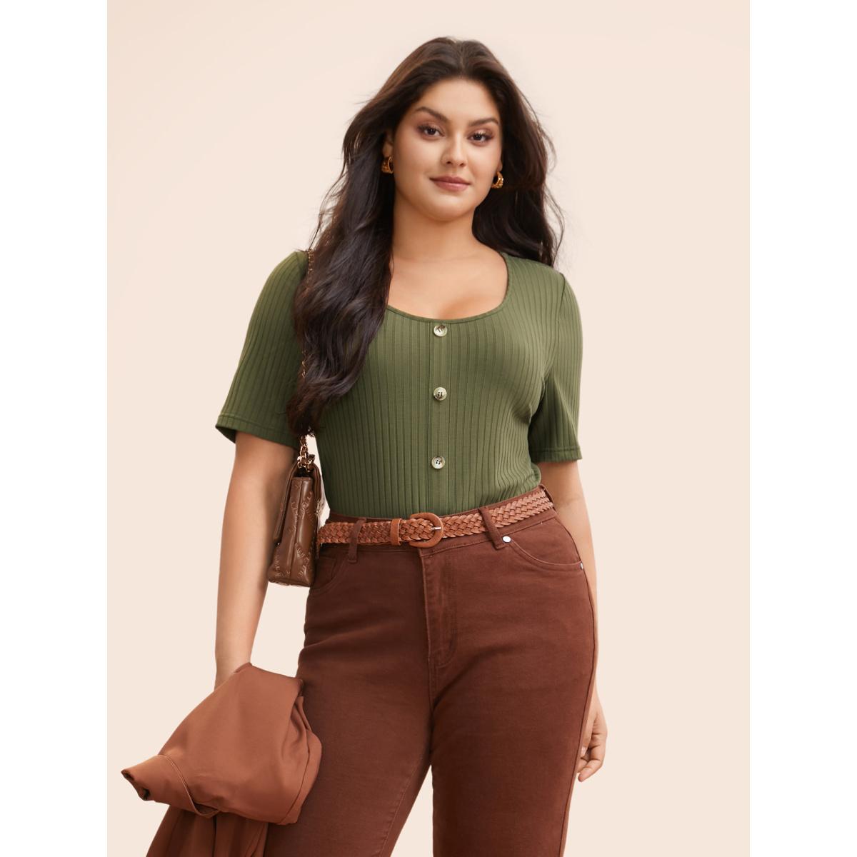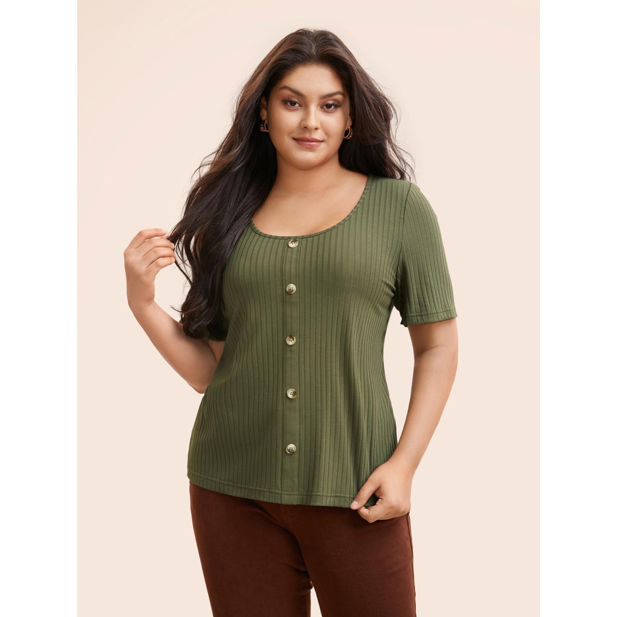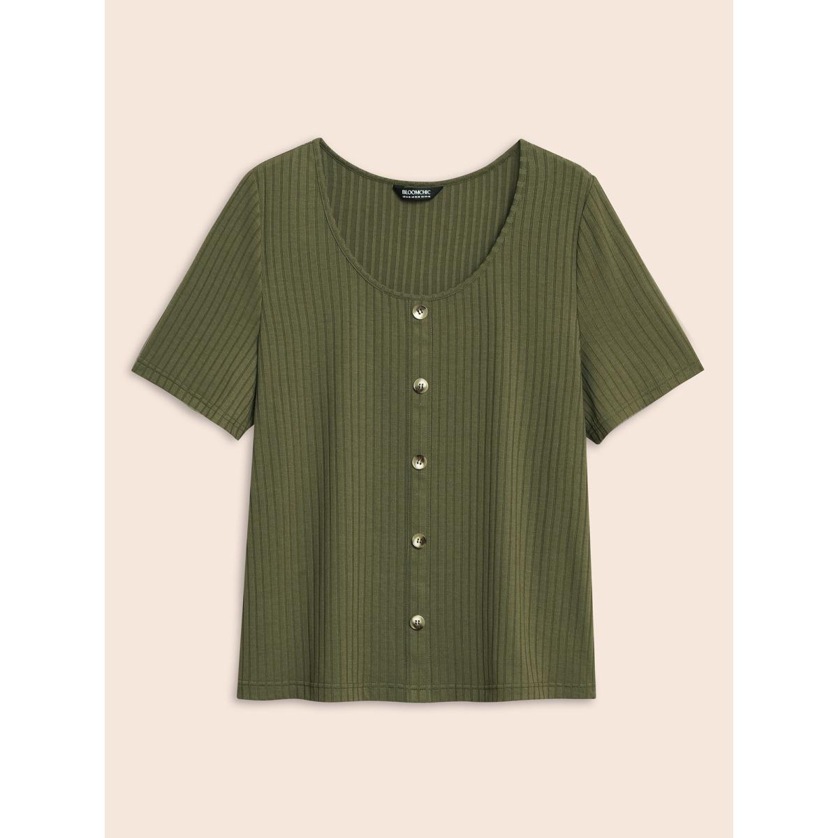 Plus Size U Neck Pit Strip Button Detail T-shirt ArmyGreen Women Elegant Texture U-neck Bodycon Everyday T-shirts BloomChic 10/M