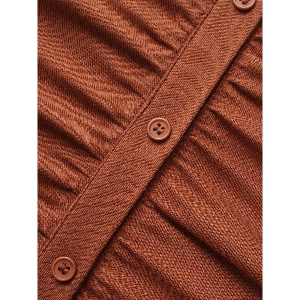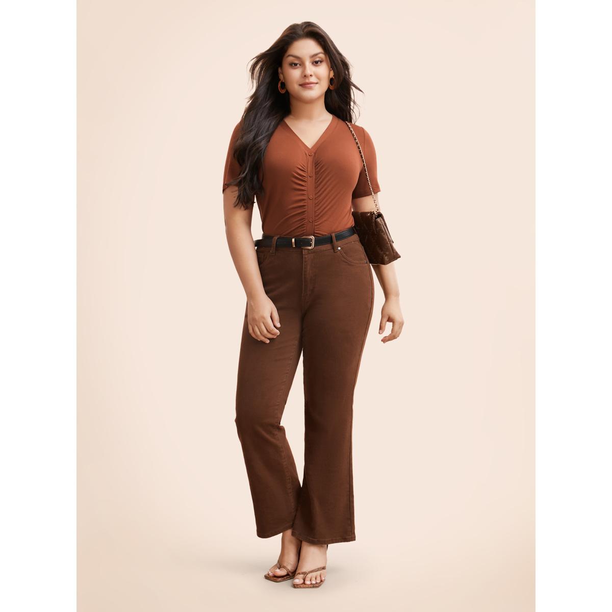 Plus Size V Neck Button Detail Ruched T-shirt Maroon Women Elegant Gathered V-neck Bodycon Everyday T-shirts BloomChic 14-16/1X