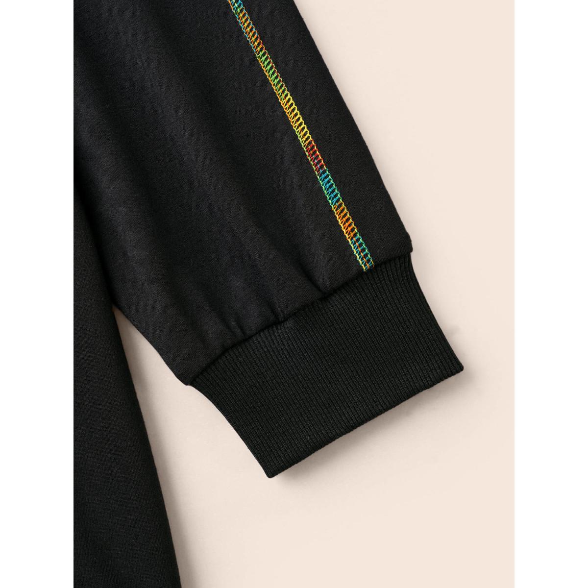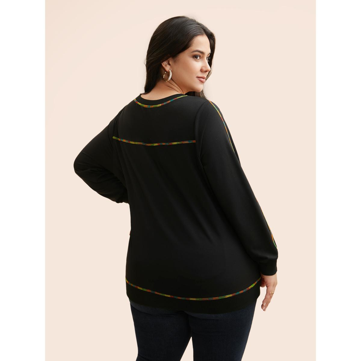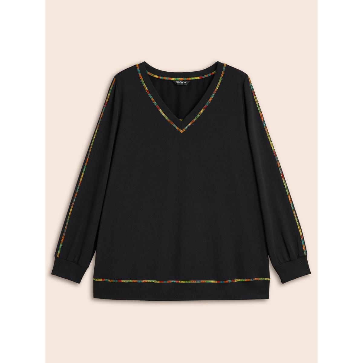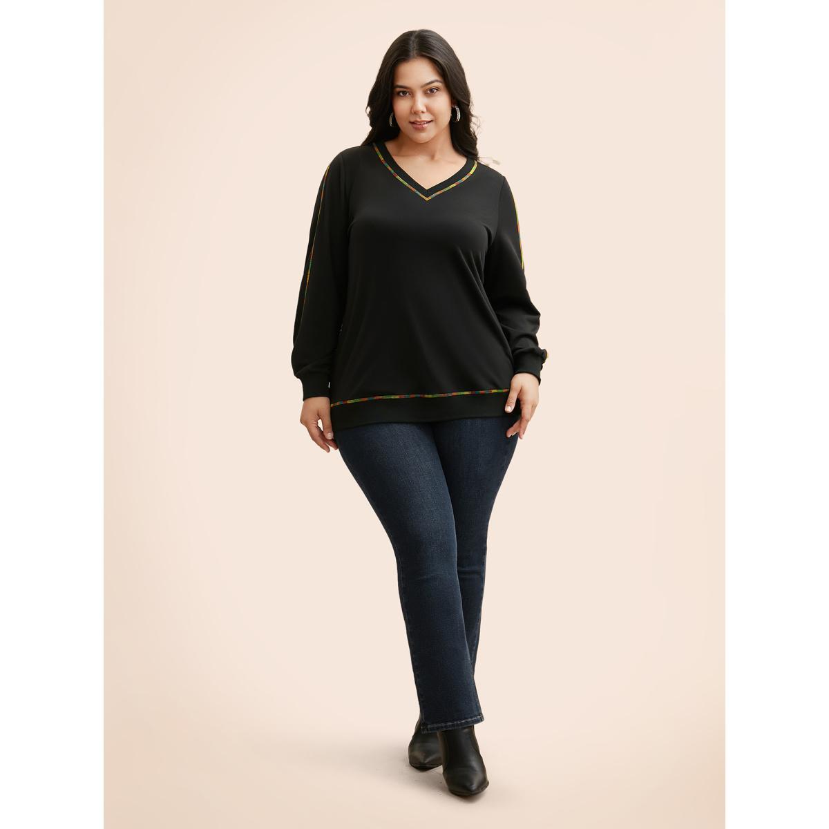 Plus Size V Neck Contrast Rainbow Trim Sweatshirt Women Black Casual Topstitching V-neck Everyday Sweatshirts BloomChic 26/4X