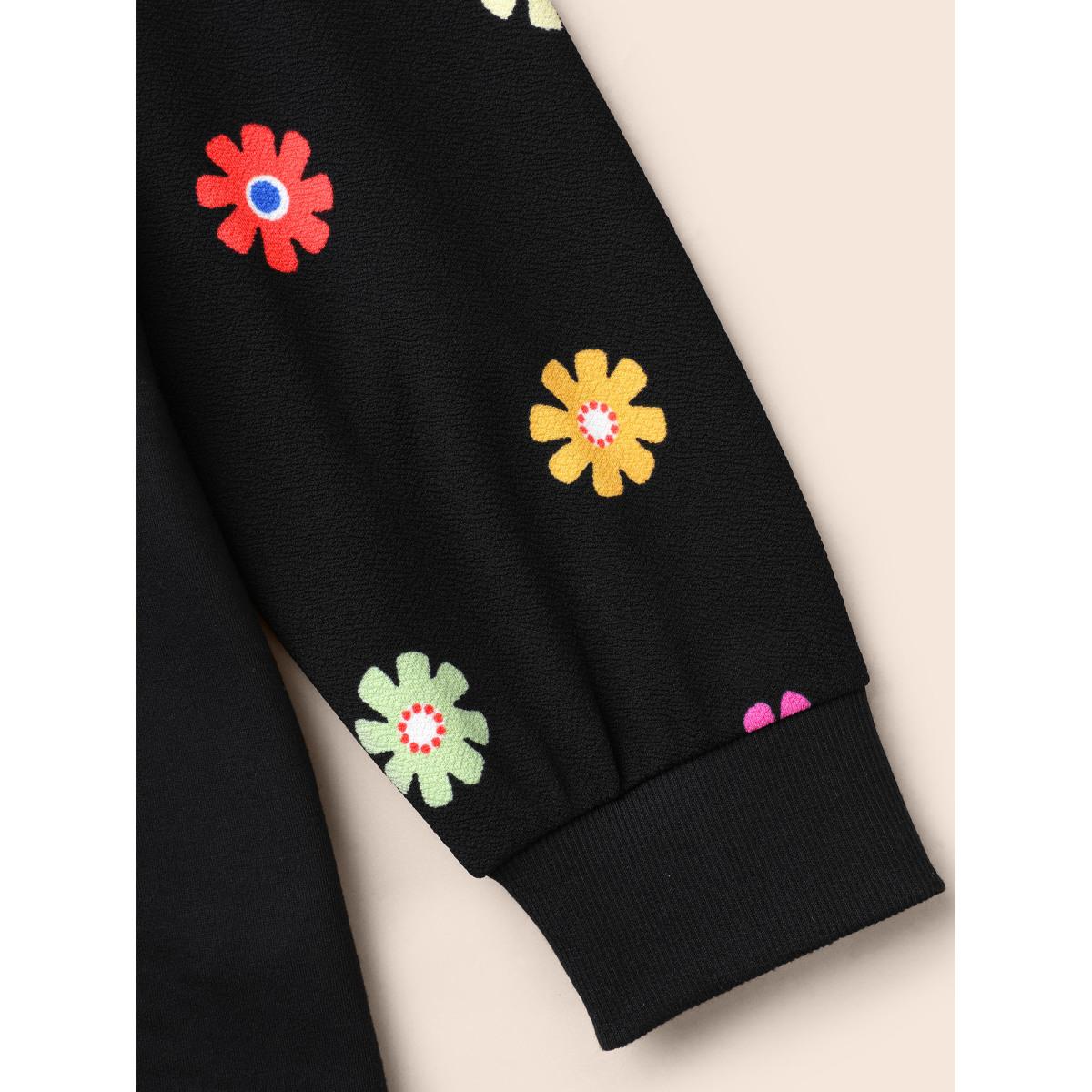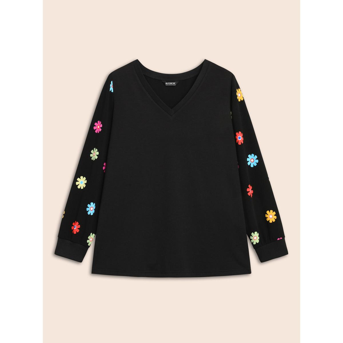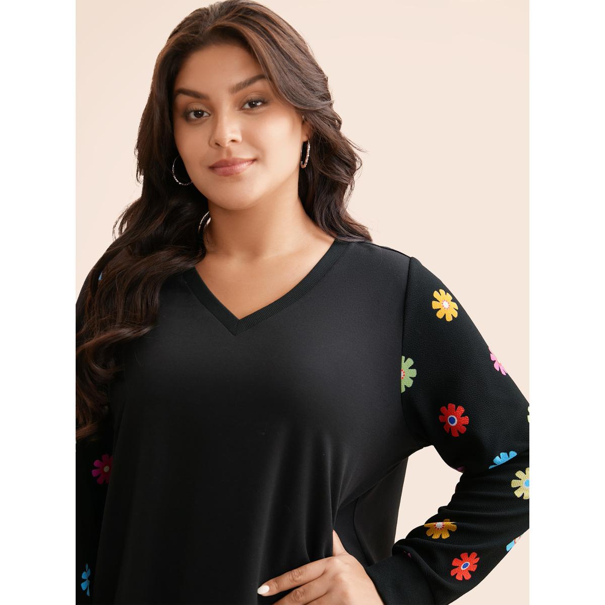 Plus Size V Neck Floral Slightly Stretchy Sweatshirt Women Black Elegant Contrast Non Everyday Sweatshirts BloomChic 28/5X