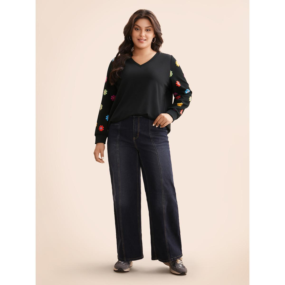 Plus Size Boho Embroidered V Neck Sweatshirt Women Black Elegant Elastic cuffs V-neck Dailywear Sweatshirts BloomChic 18-20/2X