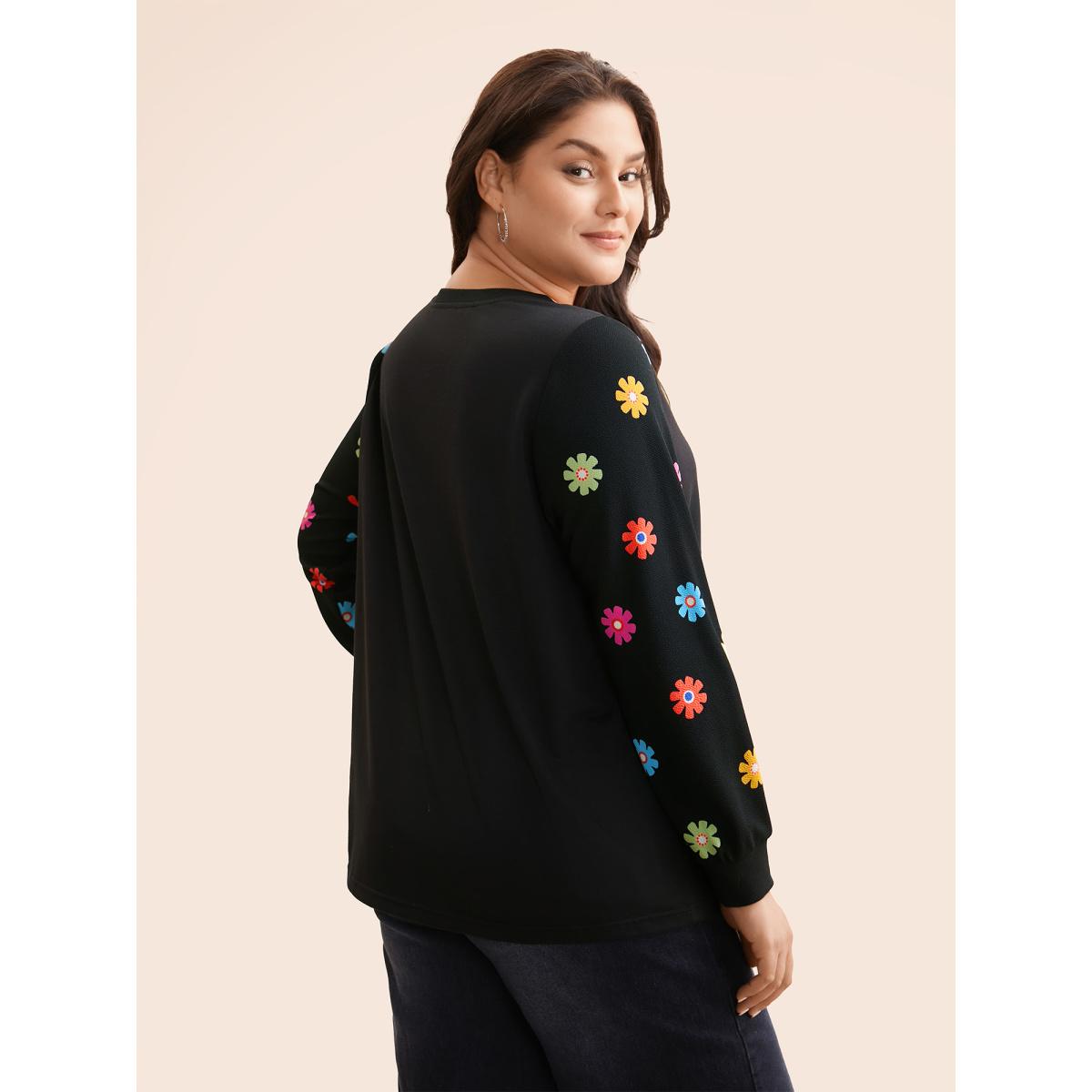 Plus Size Floral Embroidered Pocket Elastic Cuffs Sweatshirt Women Black Elegant Rib Knit Round Neck Dailywear Sweatshirts BloomChic 12/L