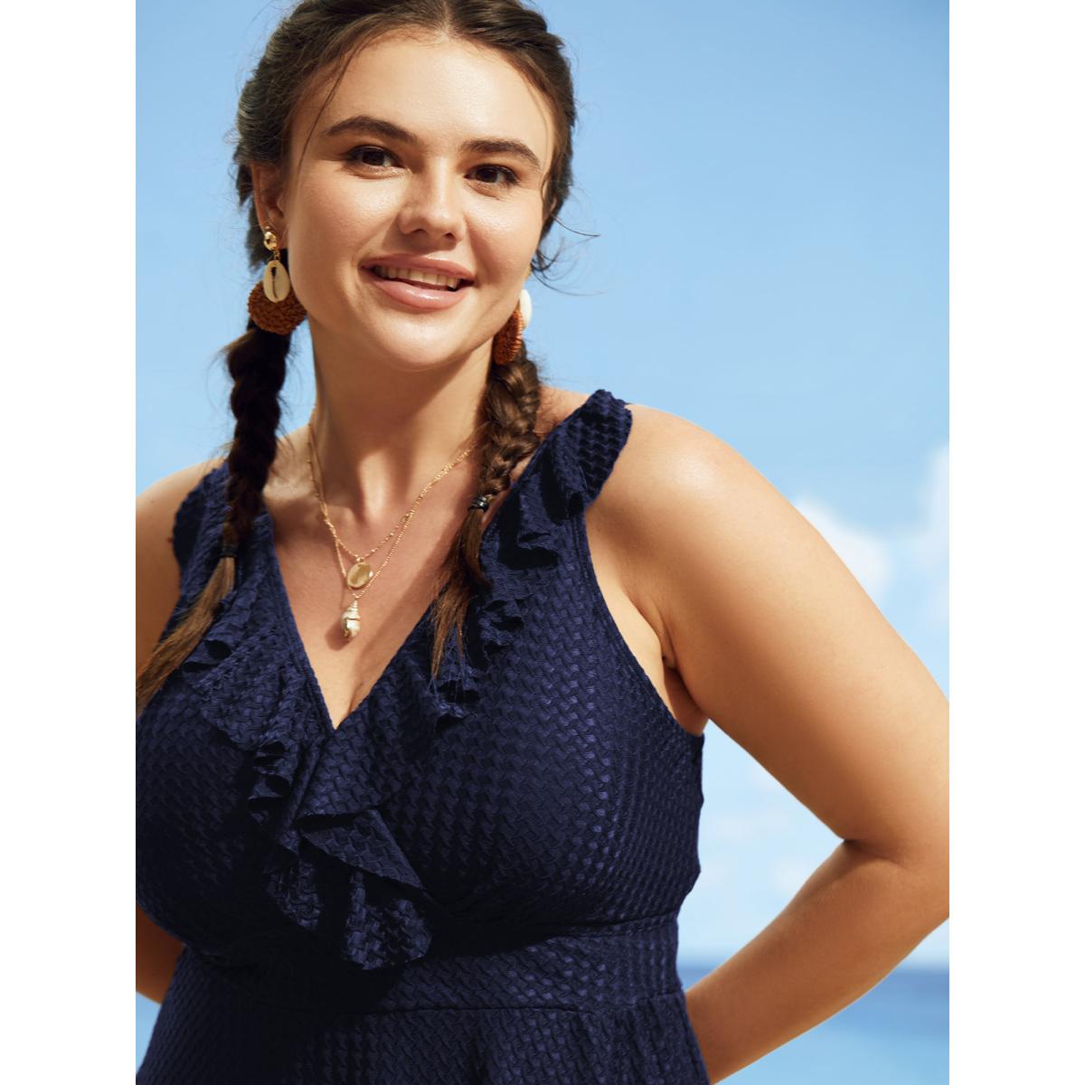 Plus Size V Neck Solid Textured Ruffle Trim Swim Dress Women's Swimwear DarkBlue Beach Bodycon V-neck High stretch Curve Swim Dresses BloomChic 22-24/3X