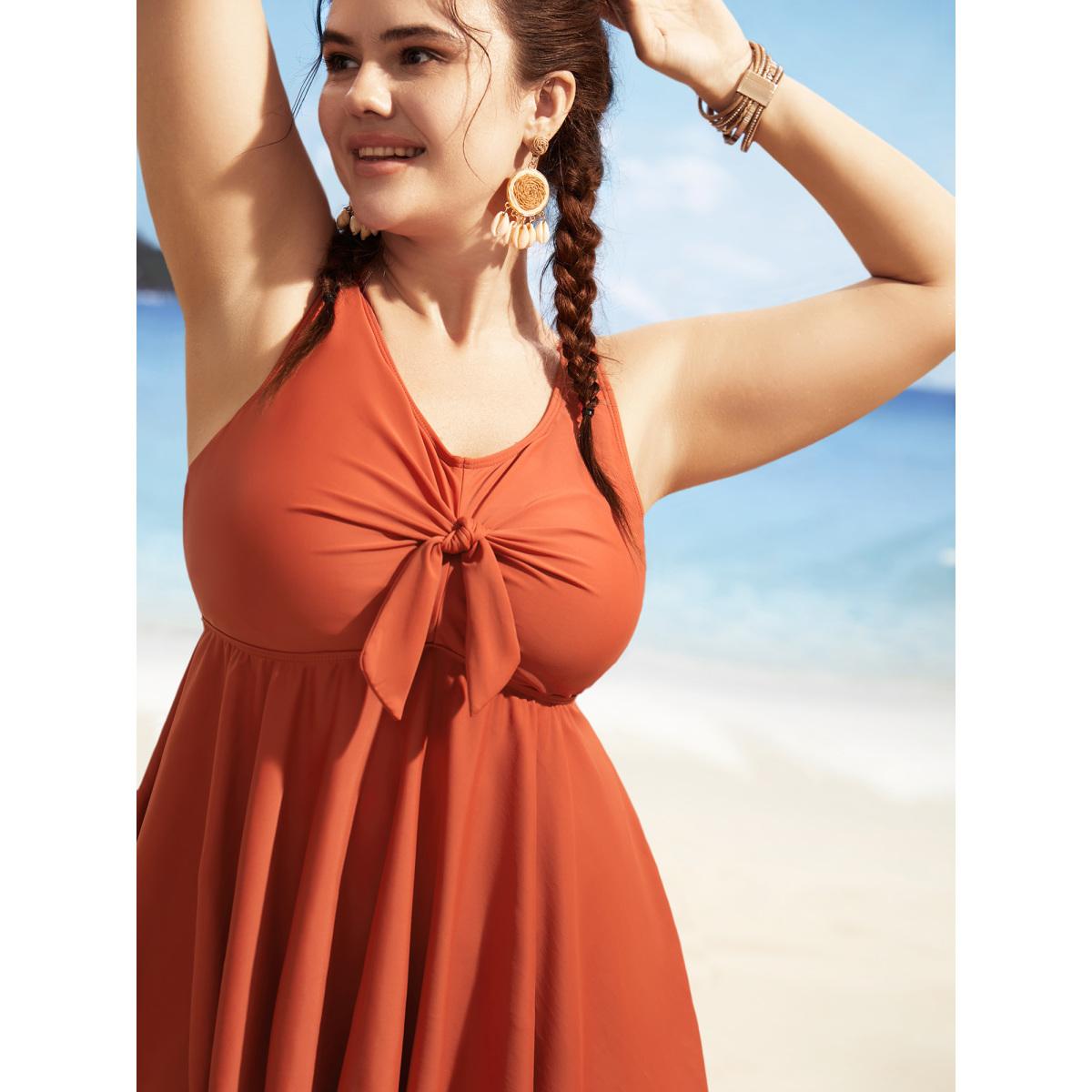 Plus Size V Neck Solid Tie knot Gathered Swim Top Women's Swimwear OrangeRed Beach Tie knot High stretch Bodycon V-neck Curve Swim Tops BloomChic 12/L