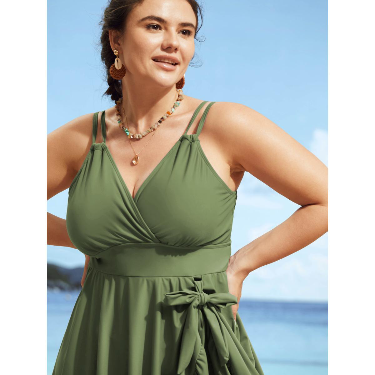 Plus Size V Neck Solid Tie Knot Ruffles Swim Dress Women's Swimwear Sage Beach Bodycon Overlap Collar High stretch Curve Swim Dresses BloomChic 14-16/1X