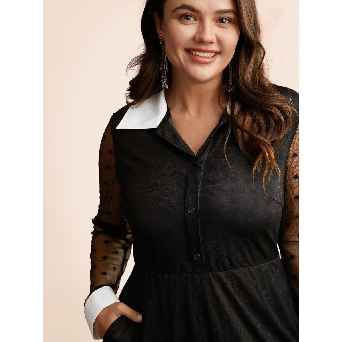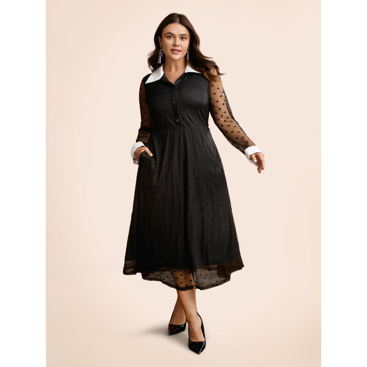 Plus Size Polka Dot Mesh Pocket Square Neck Dress Black Women Elegant Texture Square Neck Long Sleeve Curvy Midi Dress BloomChic 22-24/3X