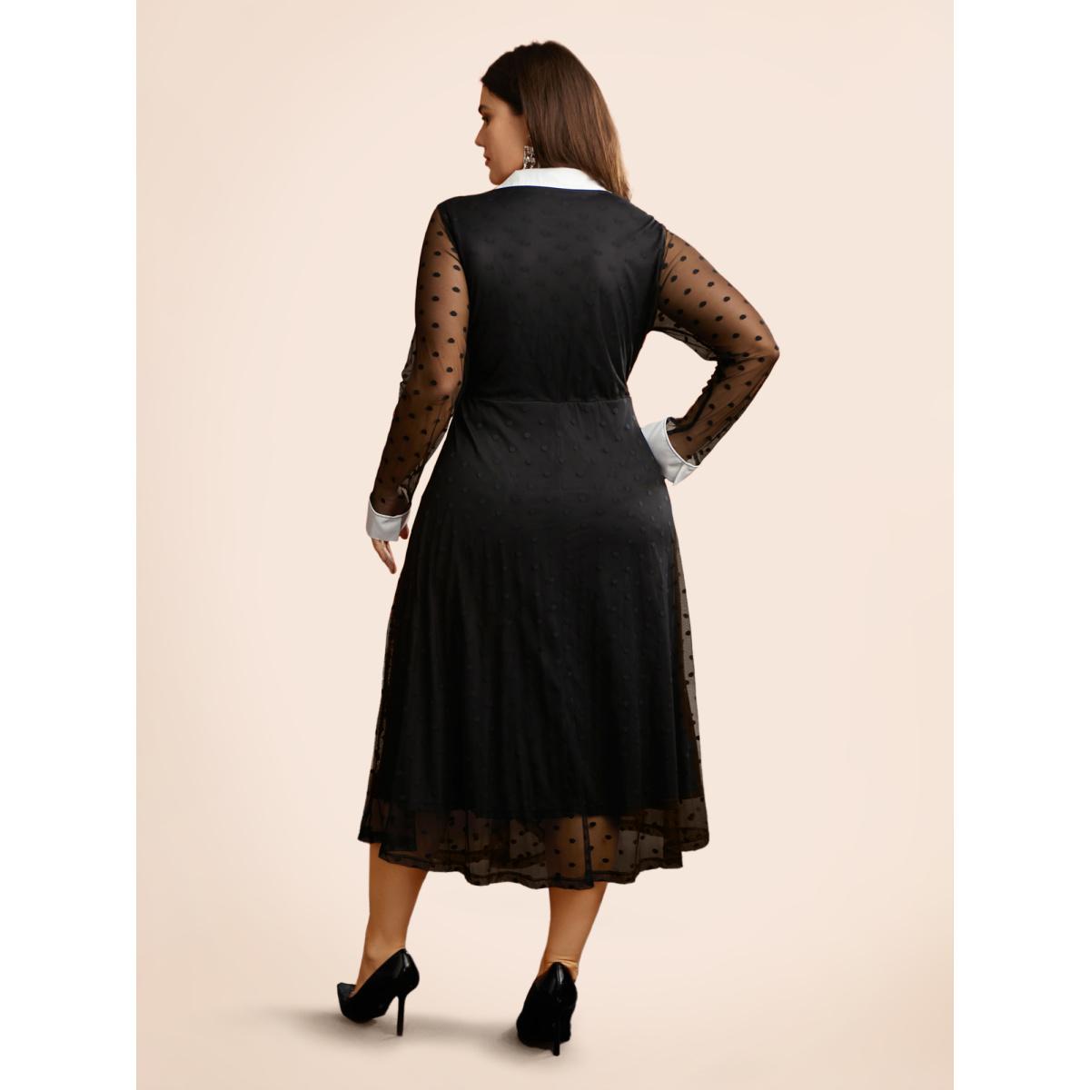 Plus Size Polka Dot Sleeve Waist-Cinched Lace Dress Black Women Elegant Woven ribbon&lace trim Heart neckline Long Sleeve Curvy BloomChic 28/5X