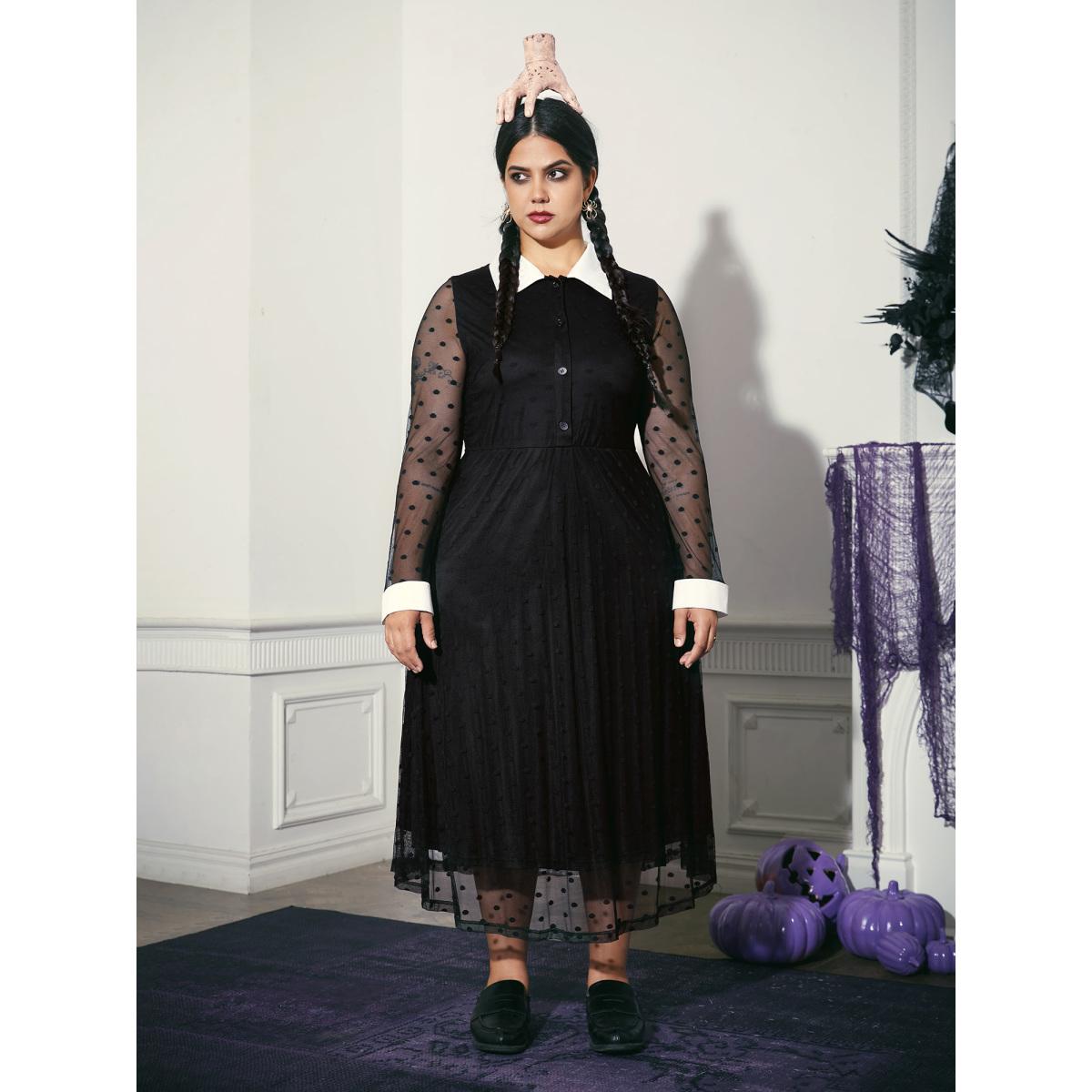 Plus Size Halloween Polka Dot Shirt Collar Button Up Belted Dress Black Women Office Belted Shirt collar Long Sleeve Curvy Midi Dress BloomChic 26/4X