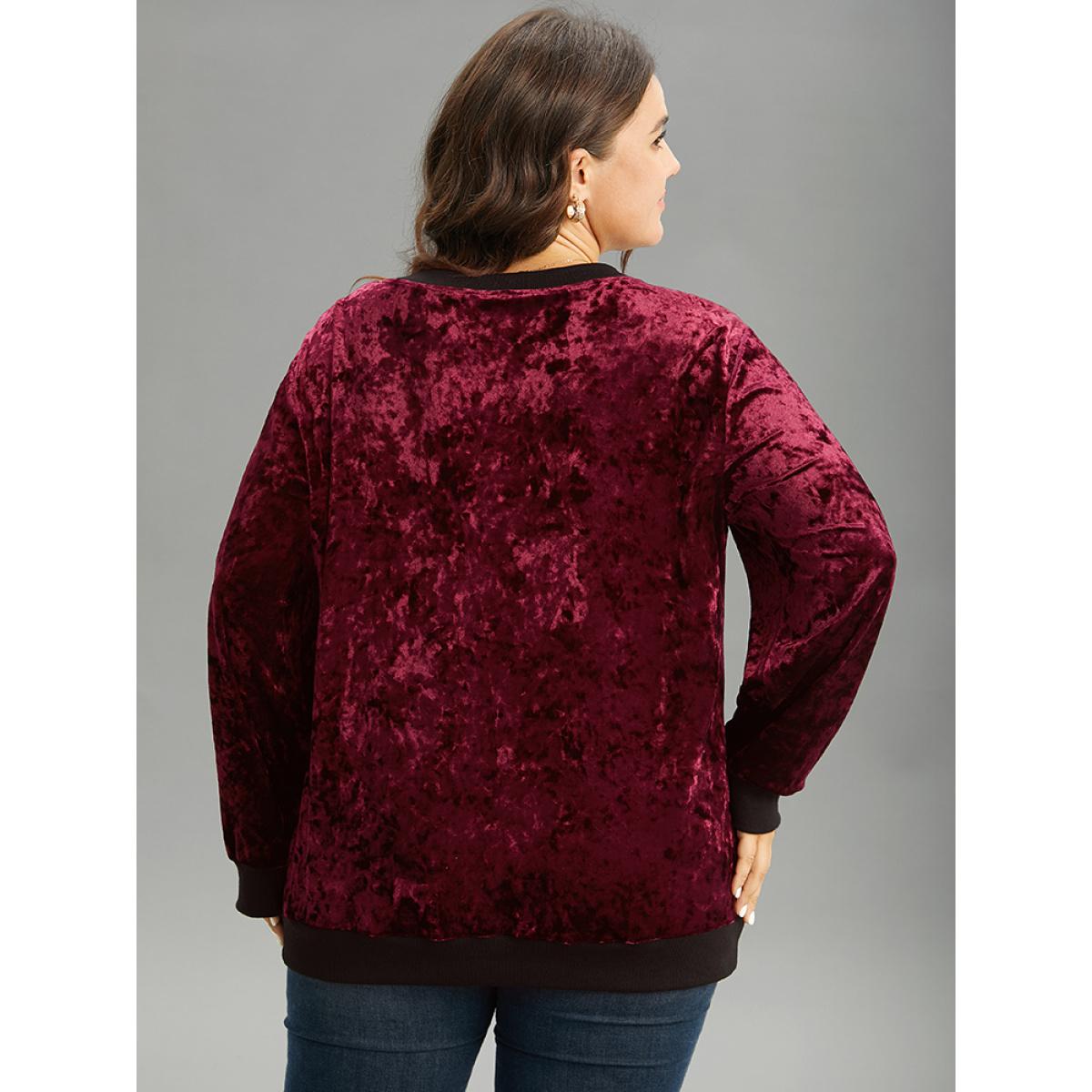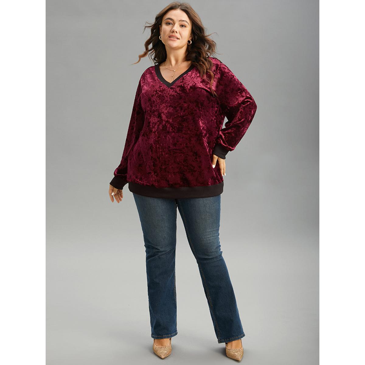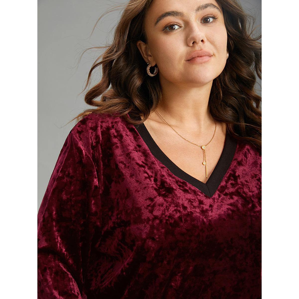 Plus Size Velvet Contrast V Neck Rib Knit Sweatshirt Women Raspberry Casual Velvet V-neck Festival-Christmas Sweatshirts BloomChic 12/L
