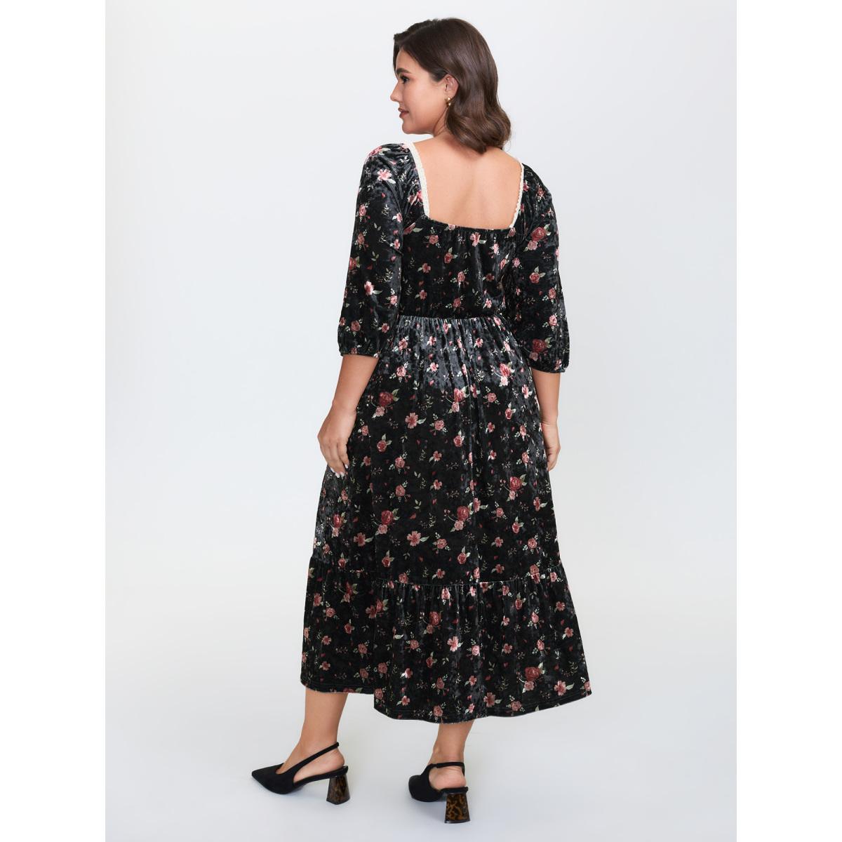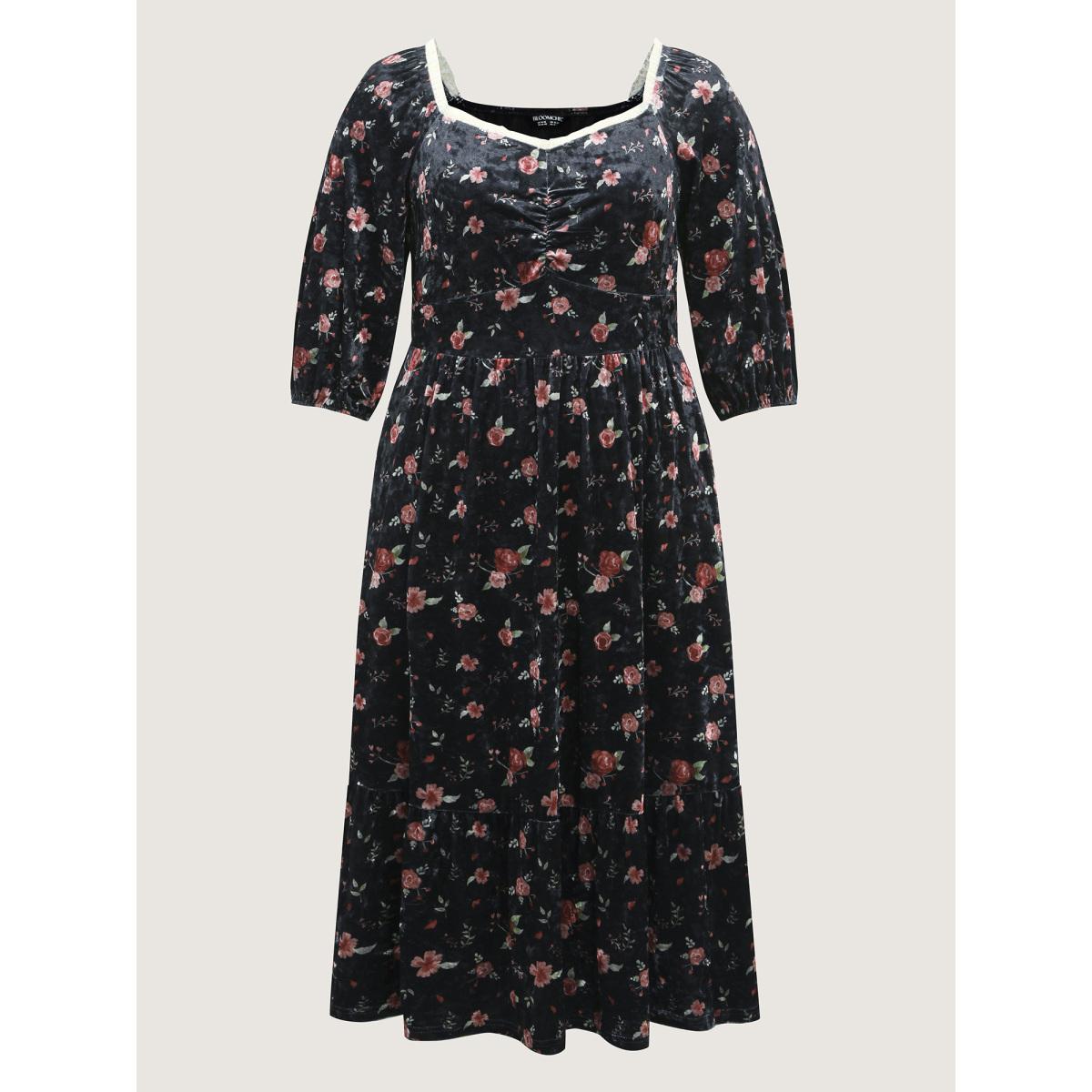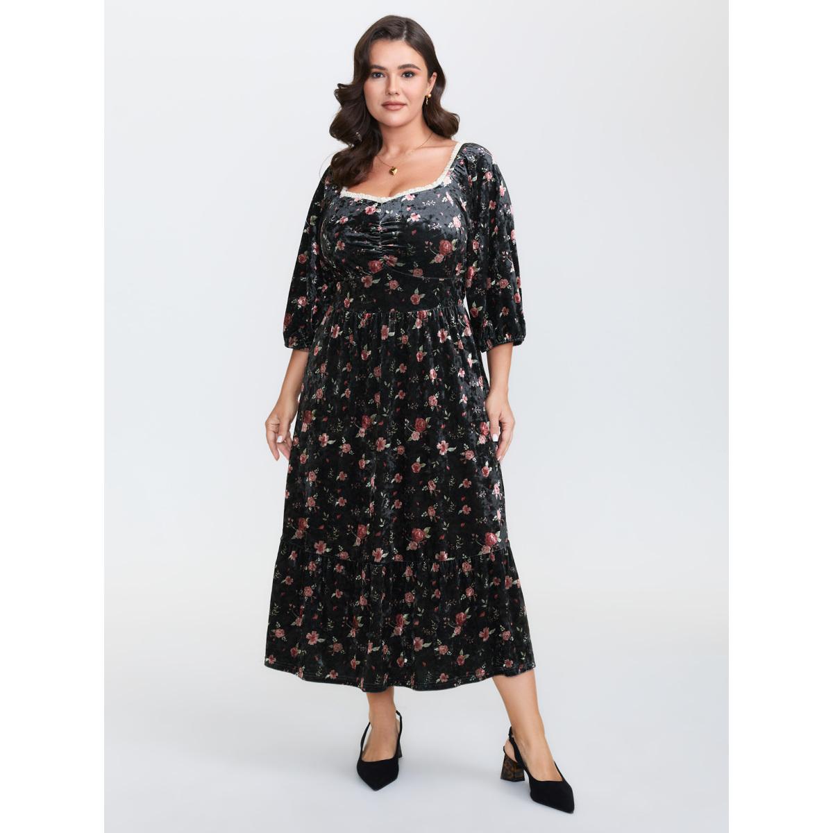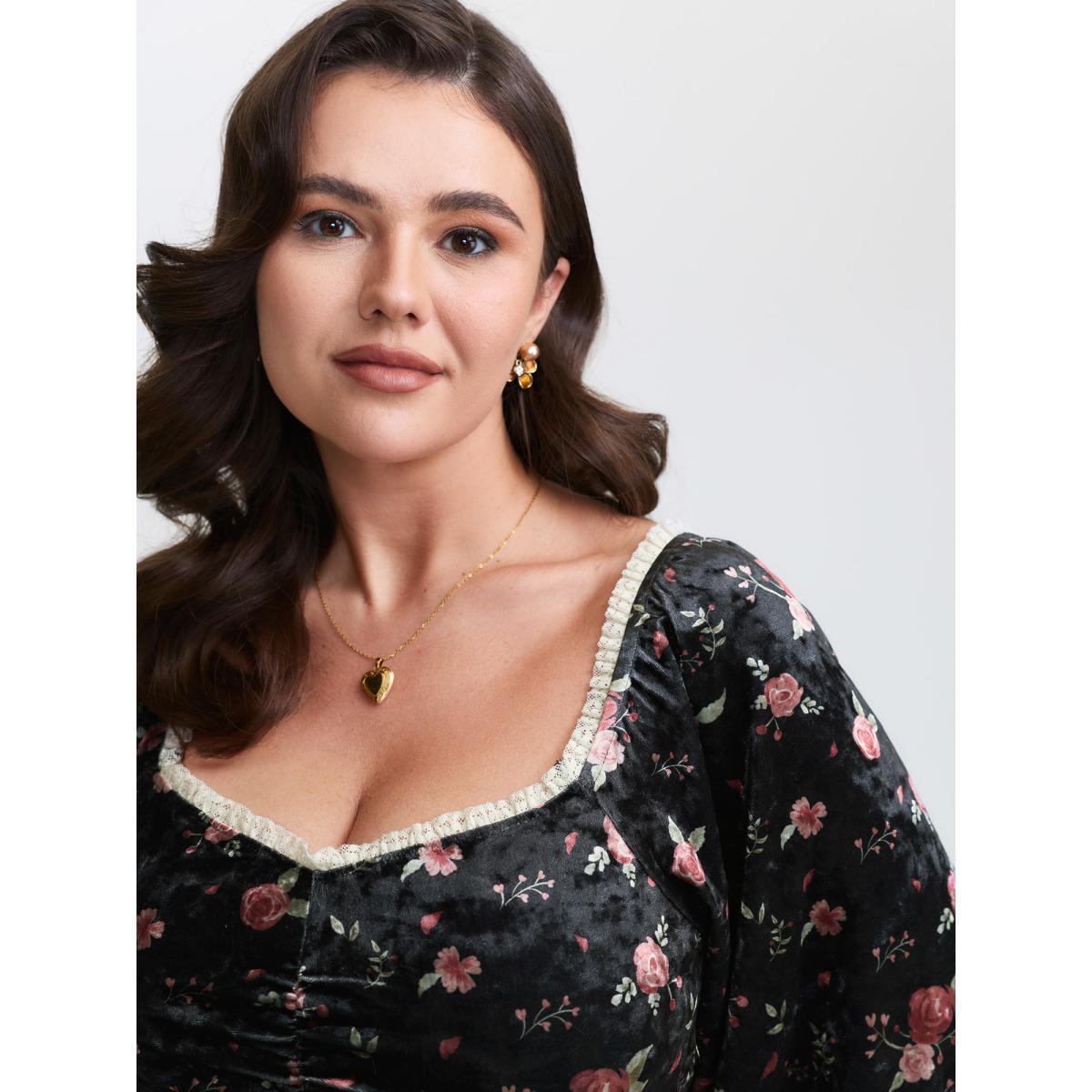 Plus Size Velvet Floral Lace Ruched Midi Dress Black Women Retro Heart neckline Long Sleeve Curvy BloomChic 12/L
