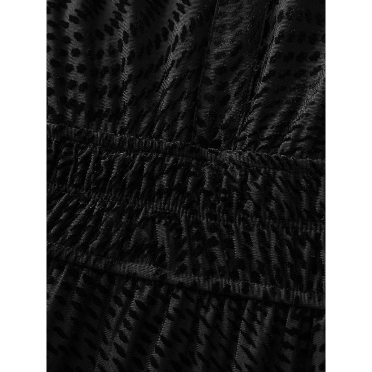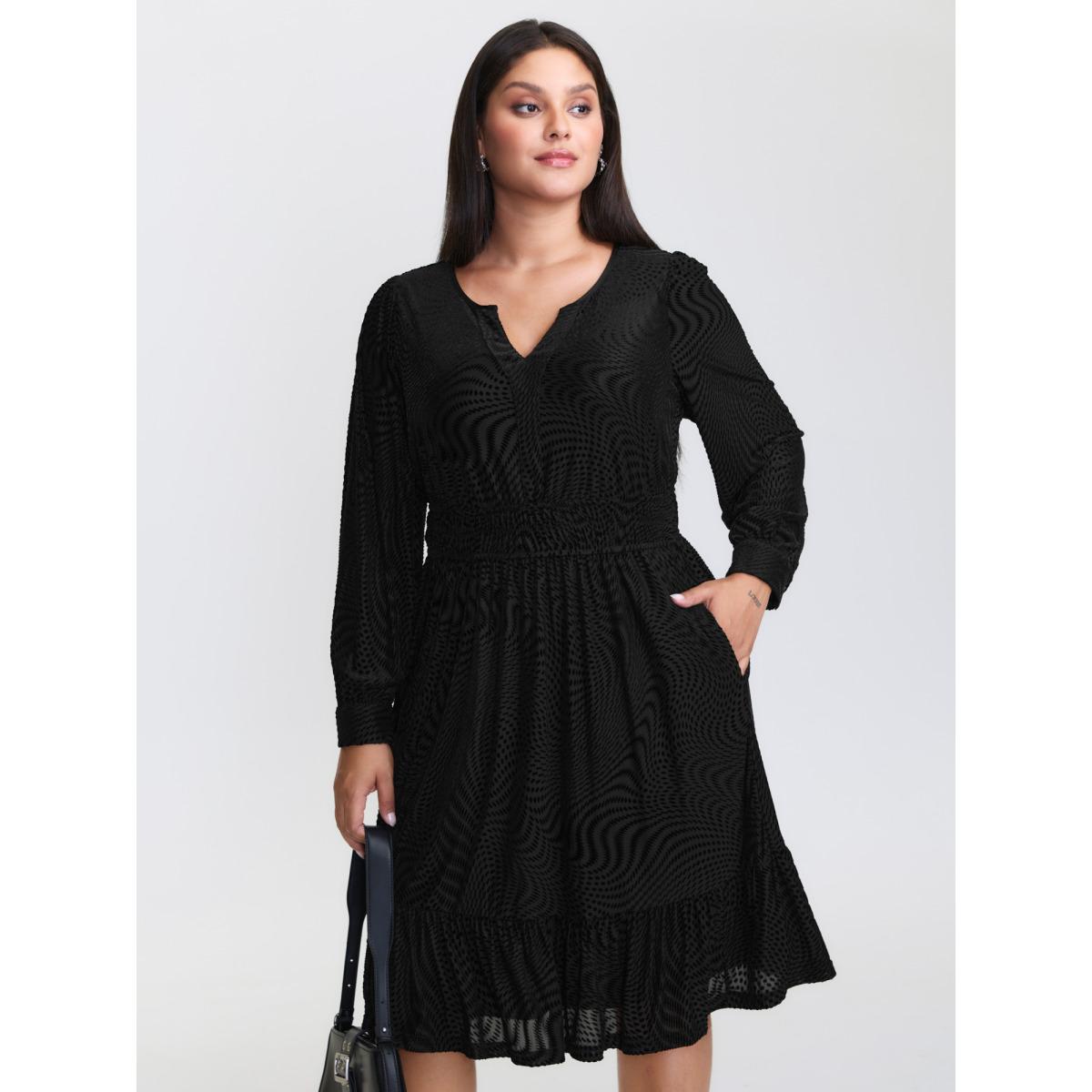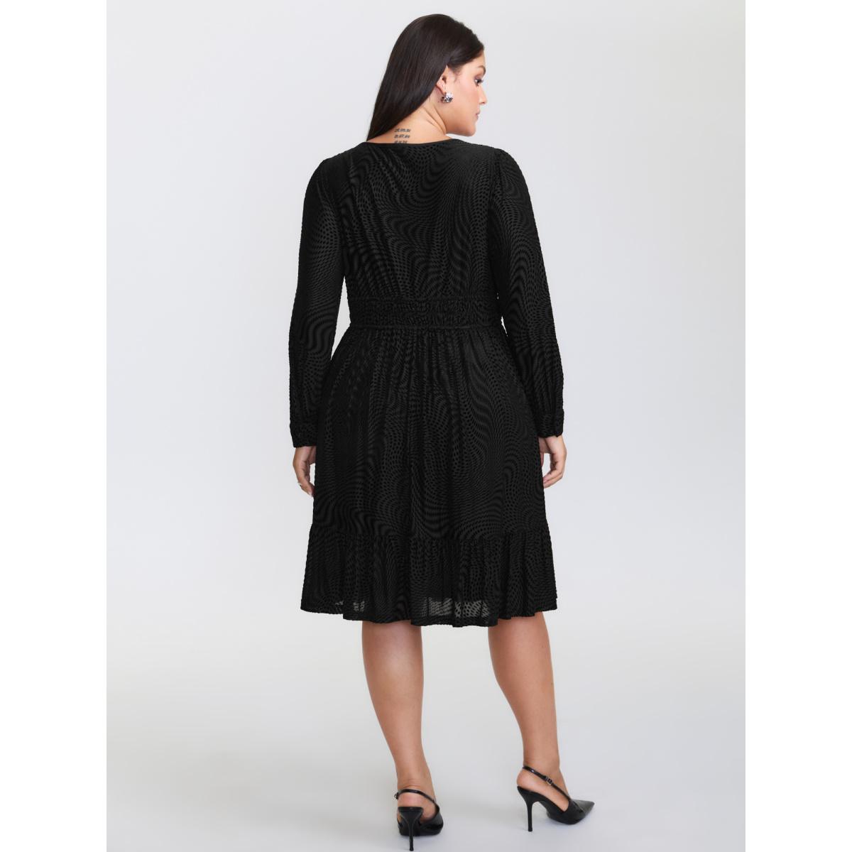 Plus Size Velvet Laser Cut Ruffled Hem Midi Dress Black Women Office Texture Flat collar with V-notch Long Sleeve Curvy BloomChic 14-16/1X