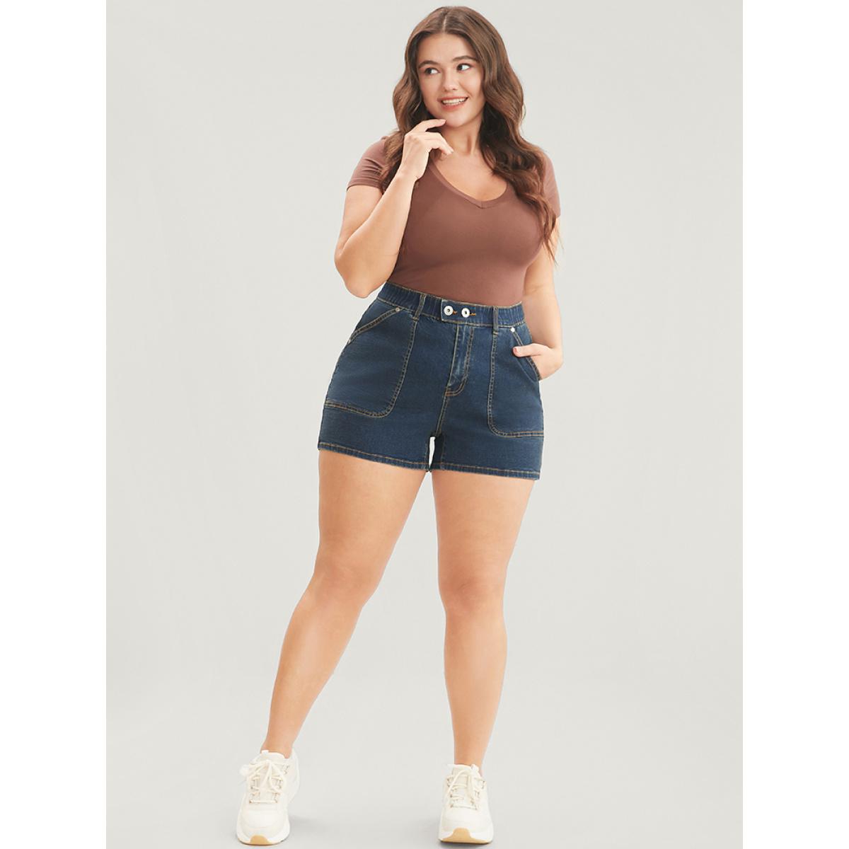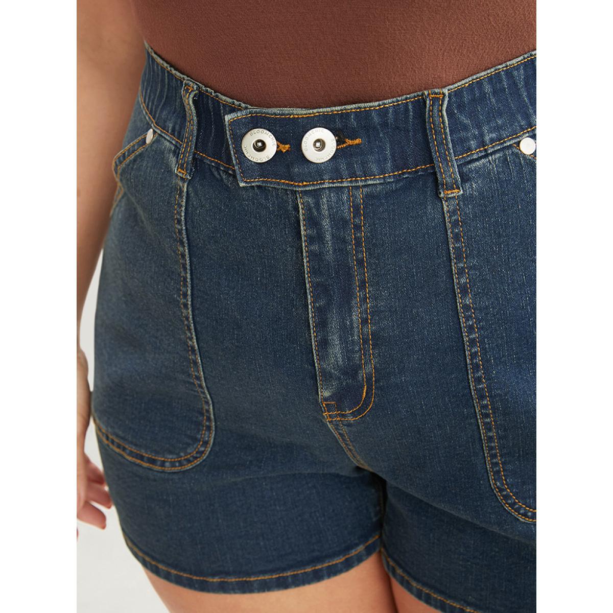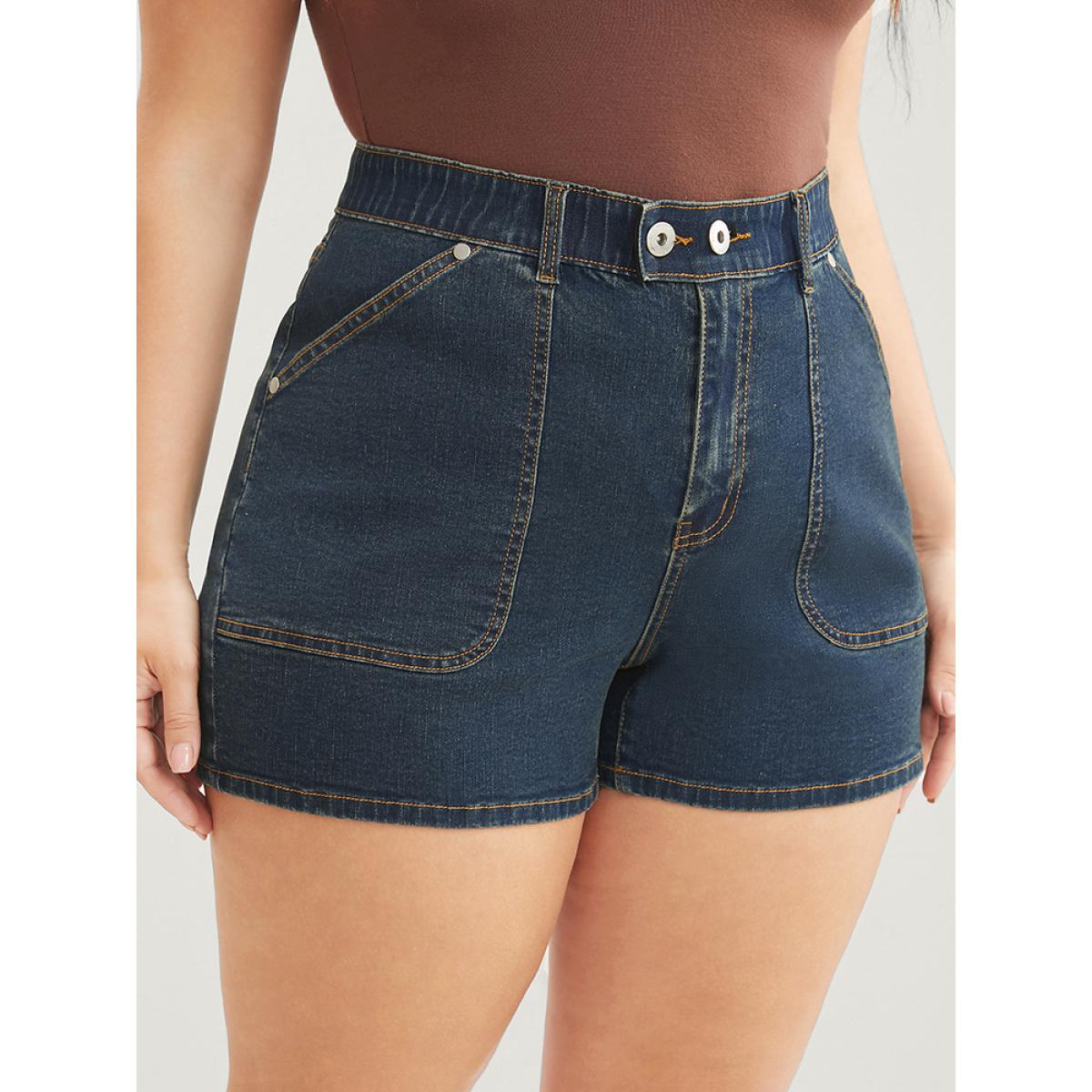 Plus Size Very Stretchy Dark Wash Pocket Knee Denim Shorts Women DarkBlue High stretch Dailywear Pocket Casual Denim Shorts BloomChic 10/M