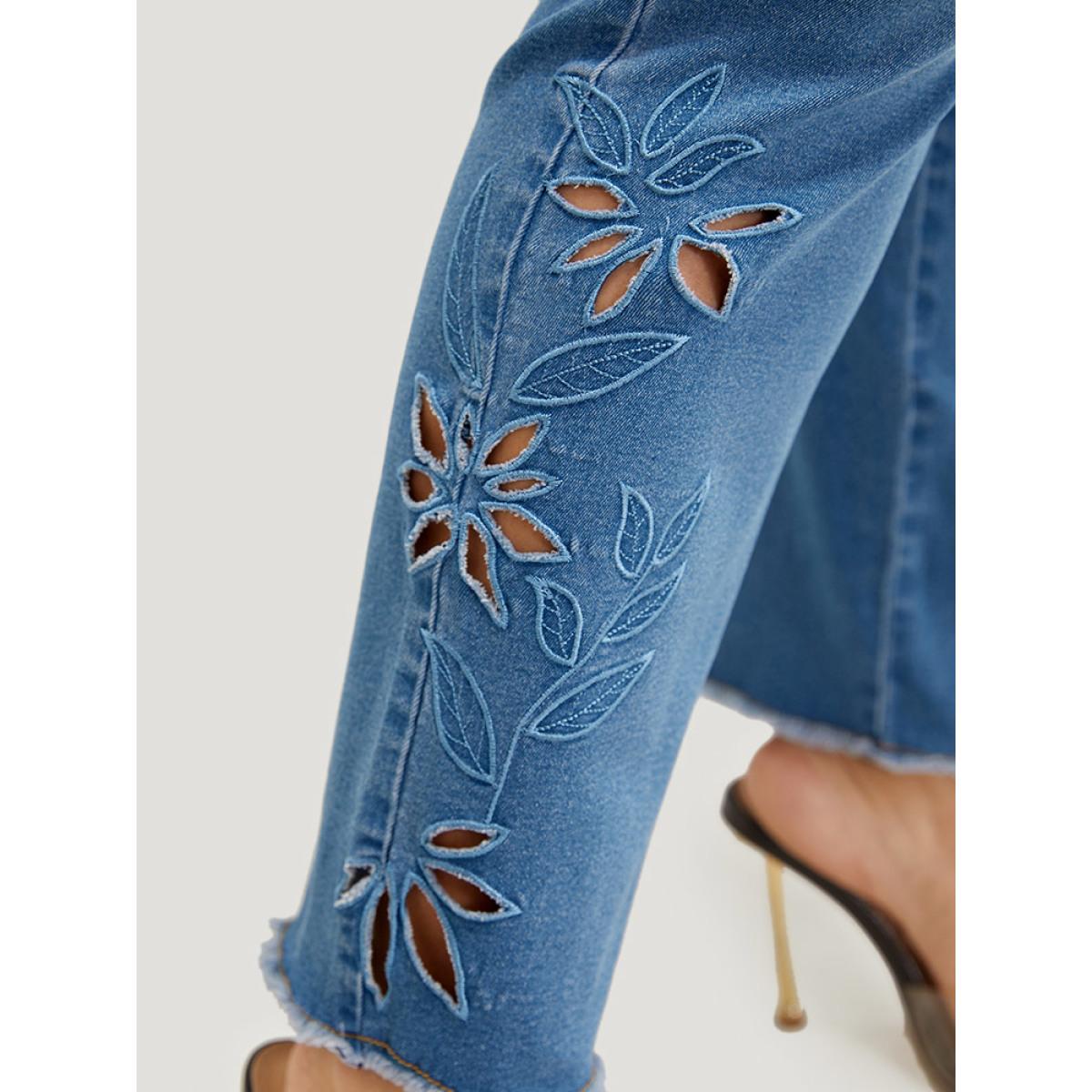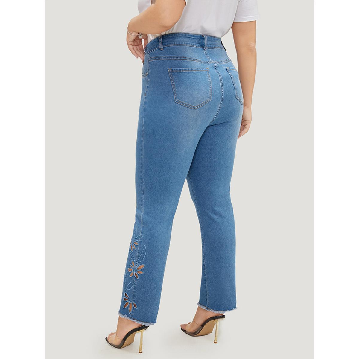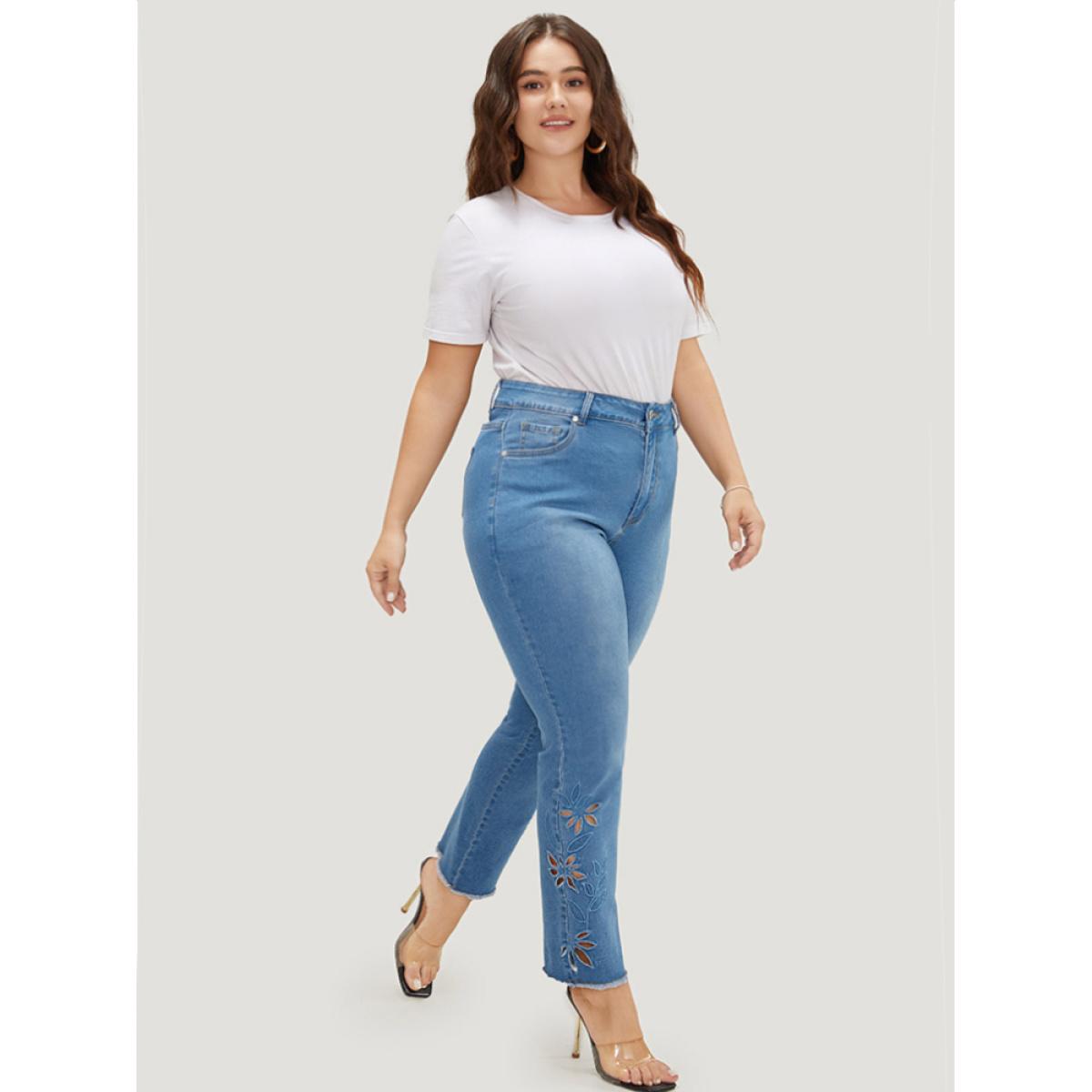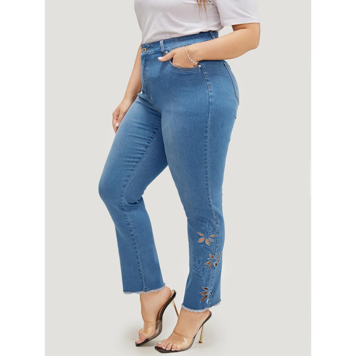 Plus Size Very Stretchy High Rise Medium Wash Broderie Anglaise Jeans Women LightBlue Casual Plain Broderie anglaise High stretch Pocket Jeans BloomChic 16/1X