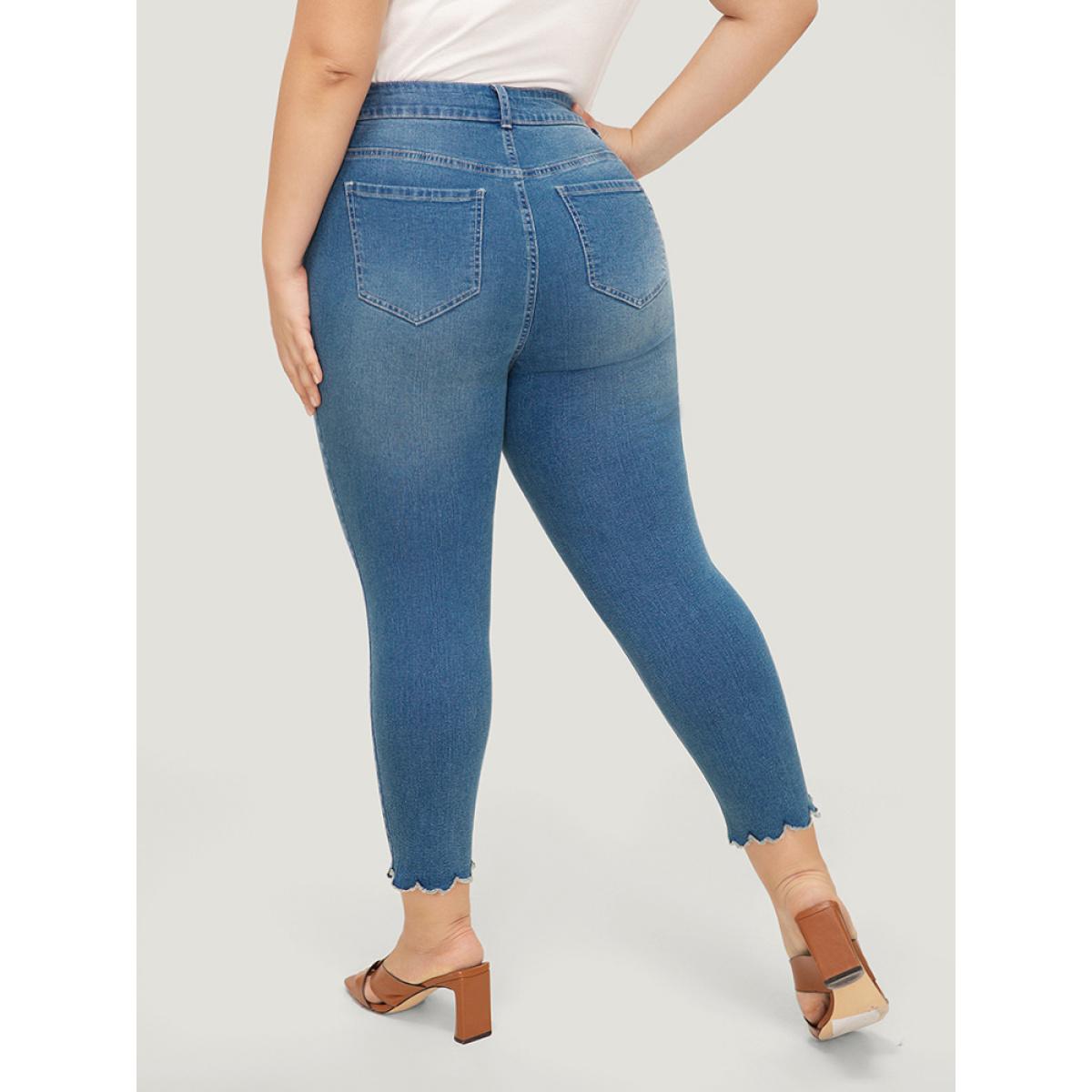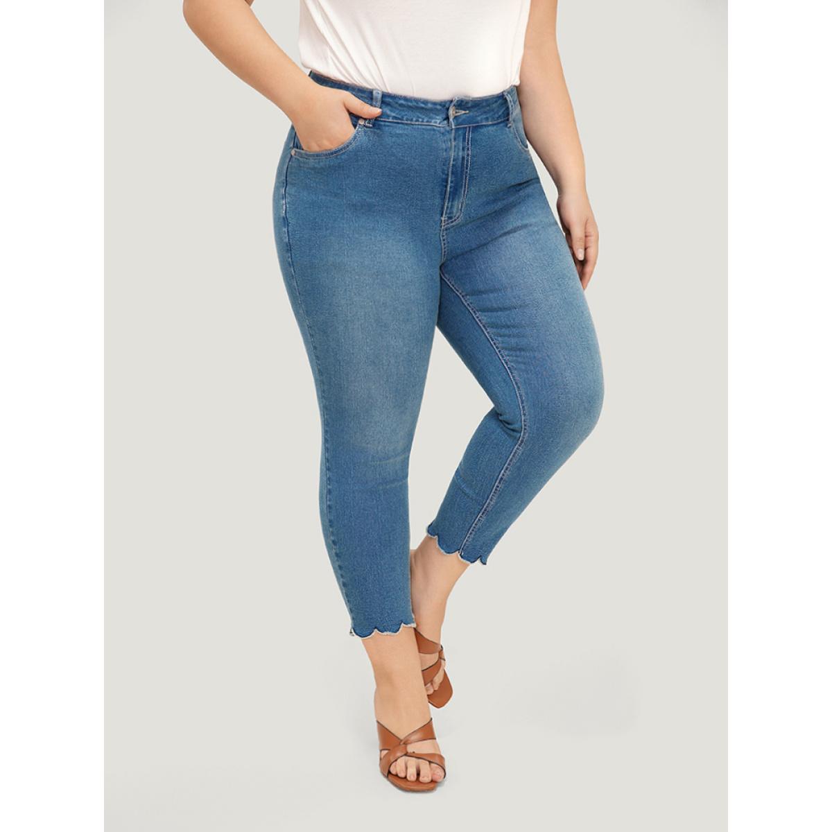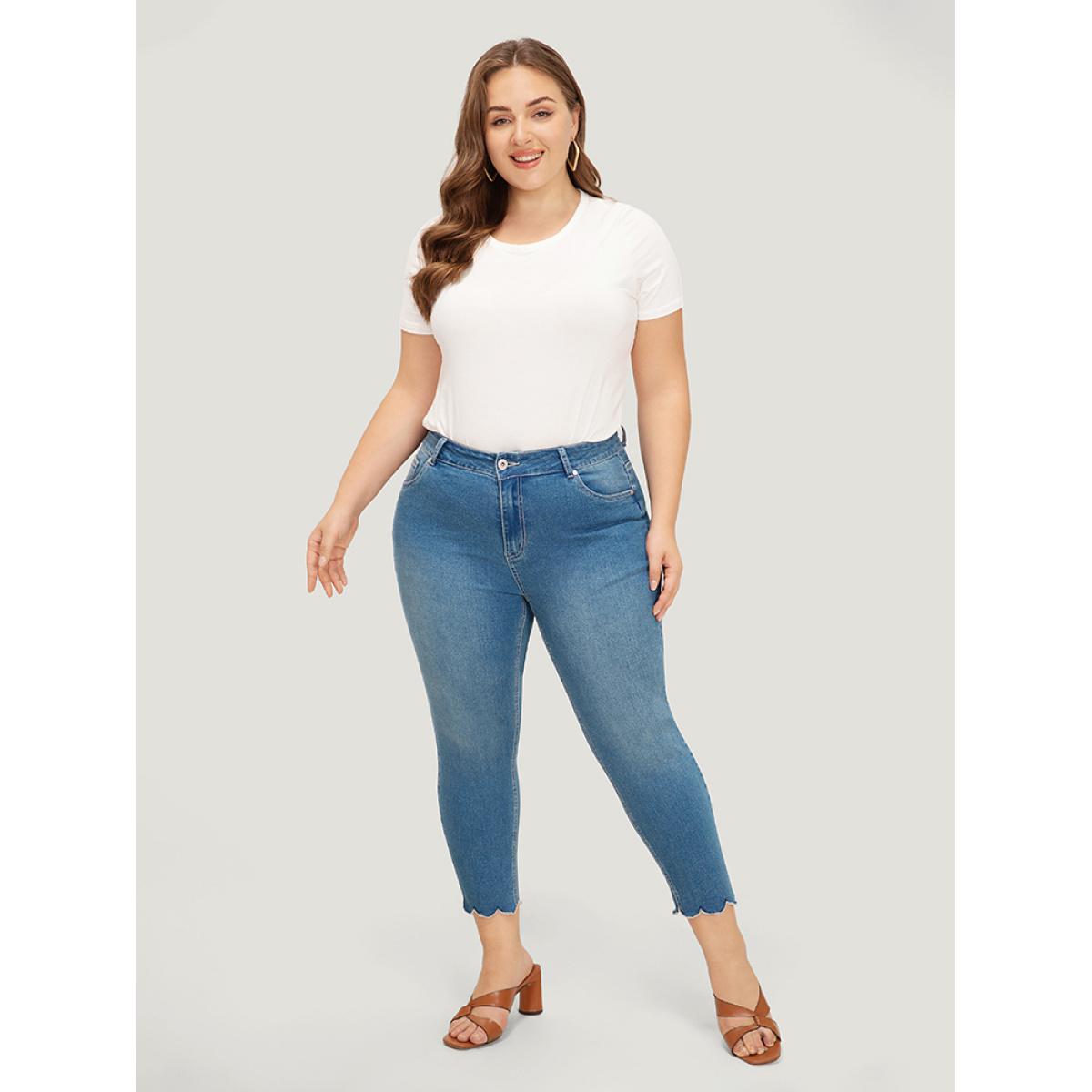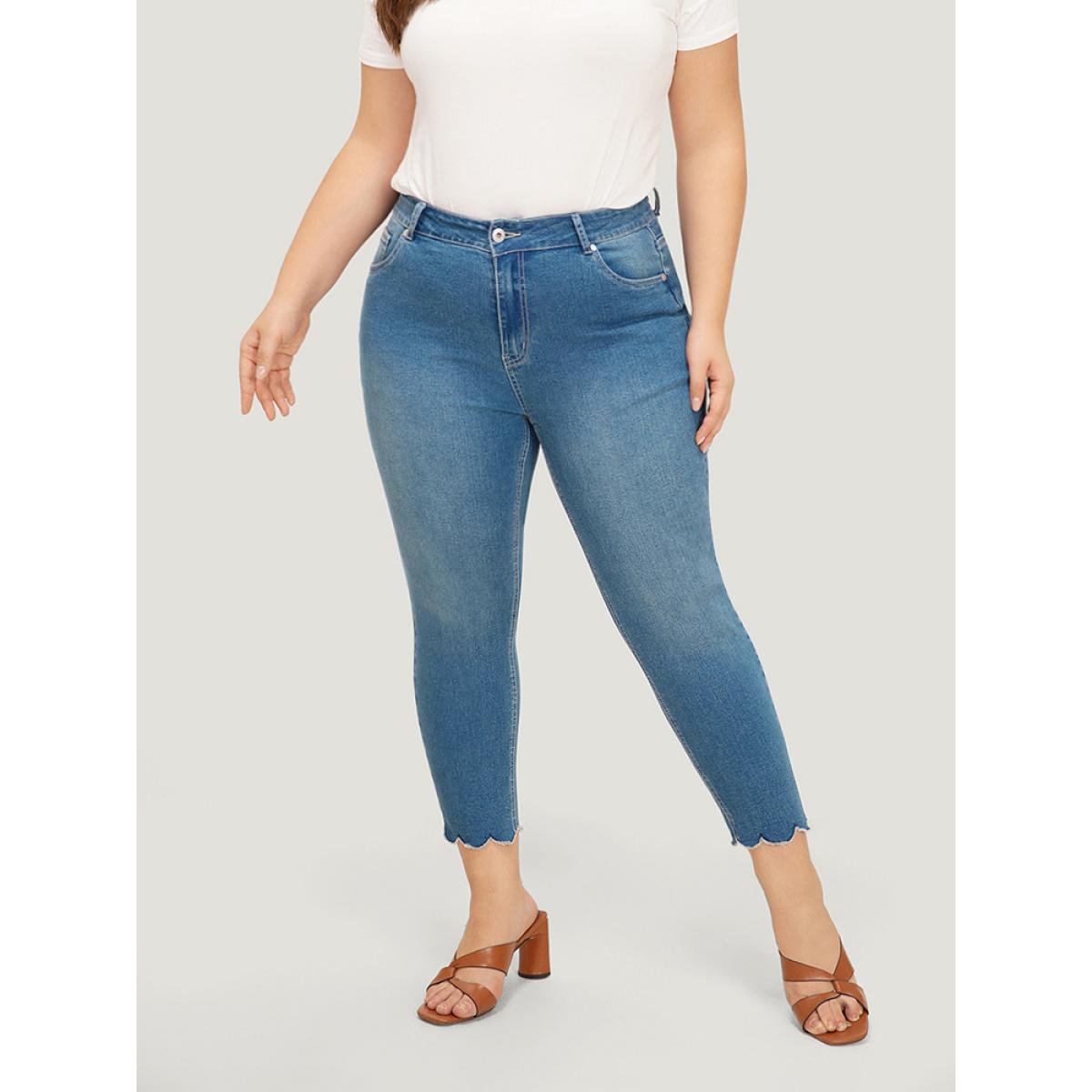 Plus Size Very Stretchy High Rise Medium Wash Scalloped Hem Jeans Women Blue Casual Plain Embroidered High stretch Pocket Jeans BloomChic 20/2X