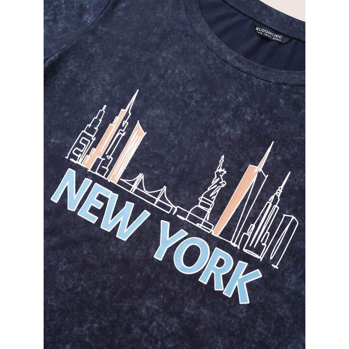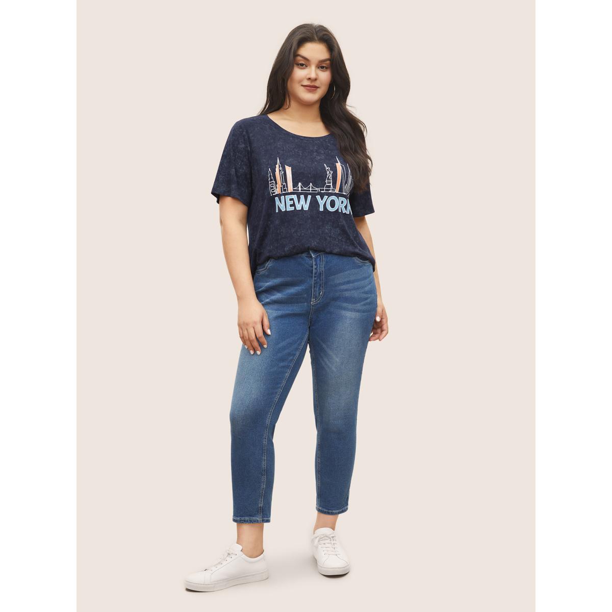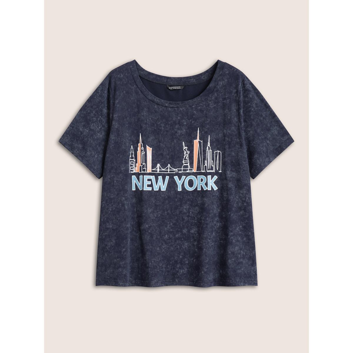 Plus Size Vintage City Print Crew Neck T-shirt Indigo Women Casual Non Area Everyday T-shirts BloomChic 30/6X