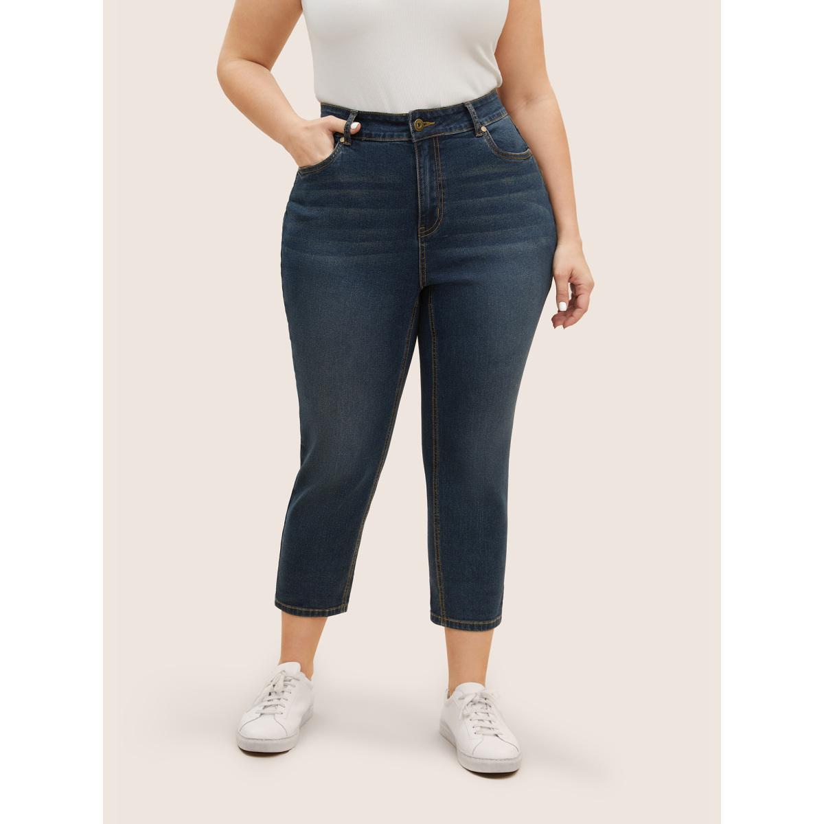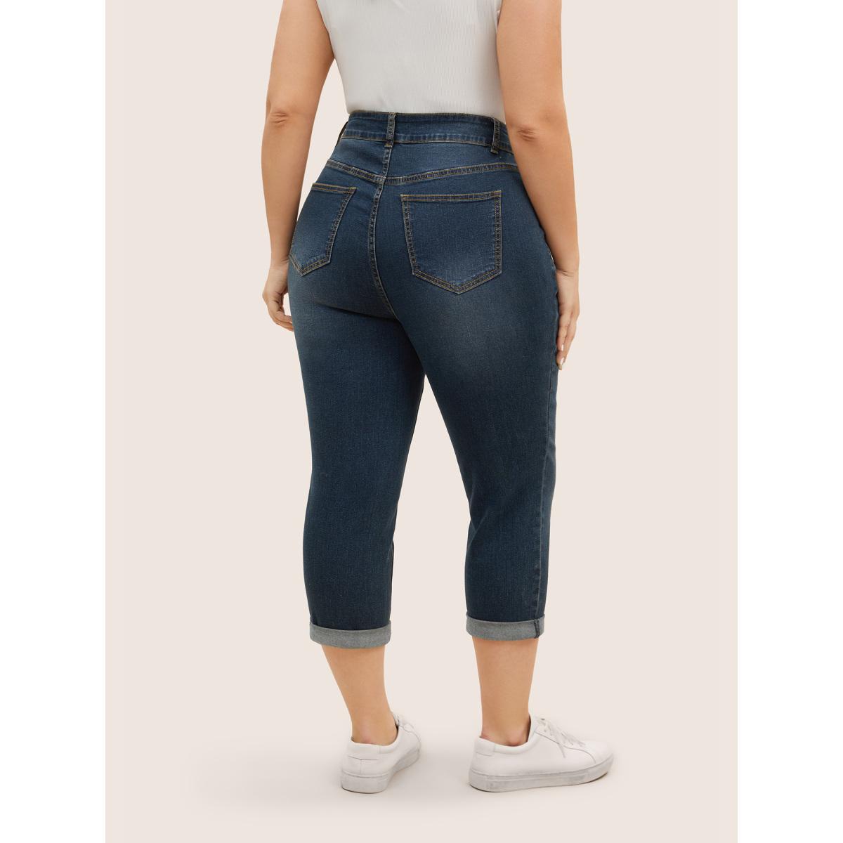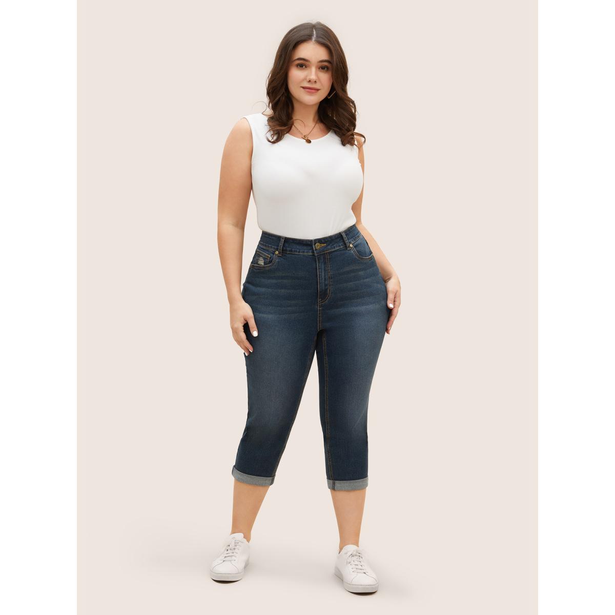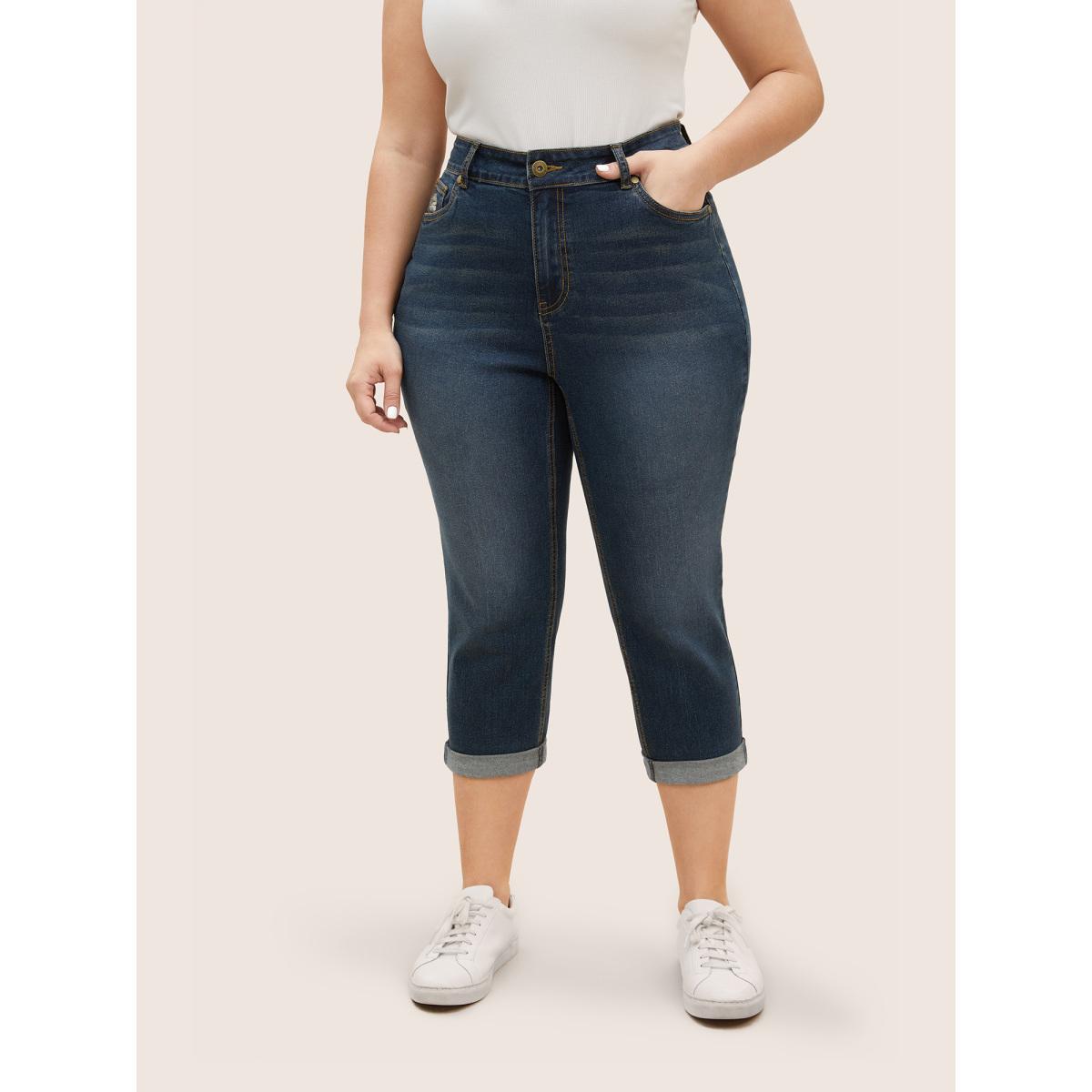 Plus Size Vintage Slanted Pocket Roll Hem Jeans Women DarkBlue Casual High stretch Slanted pocket Jeans BloomChic 22/3X