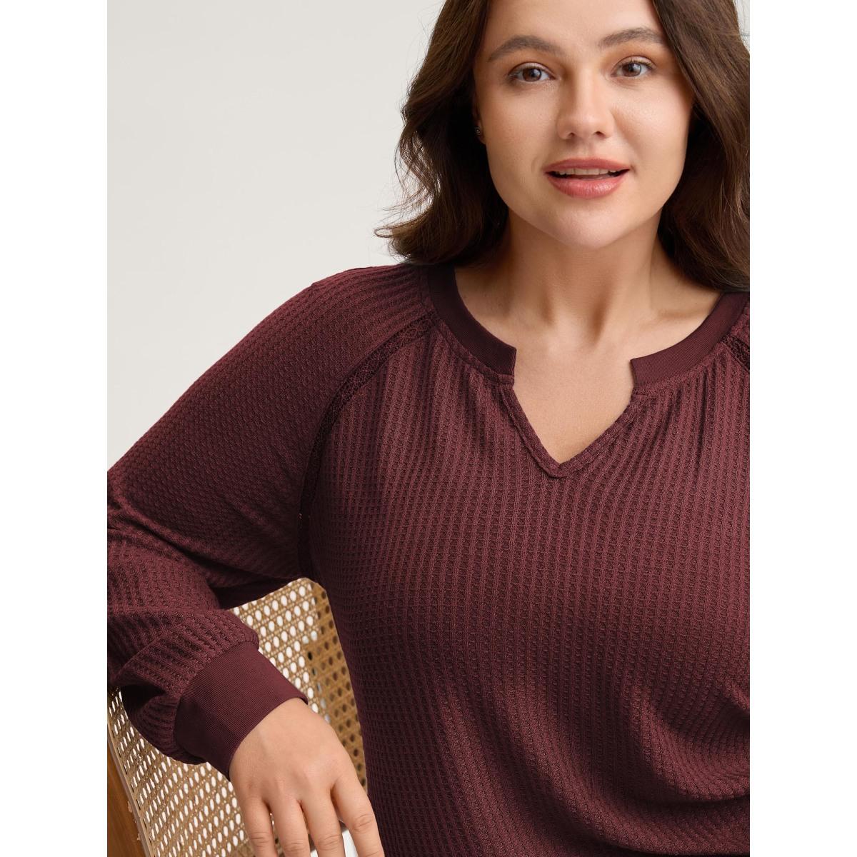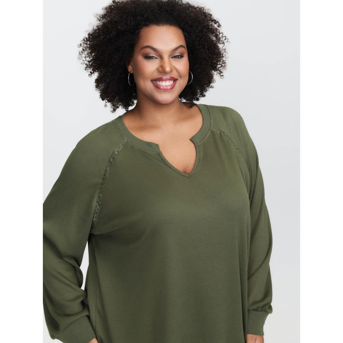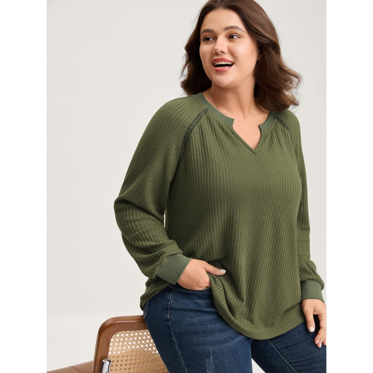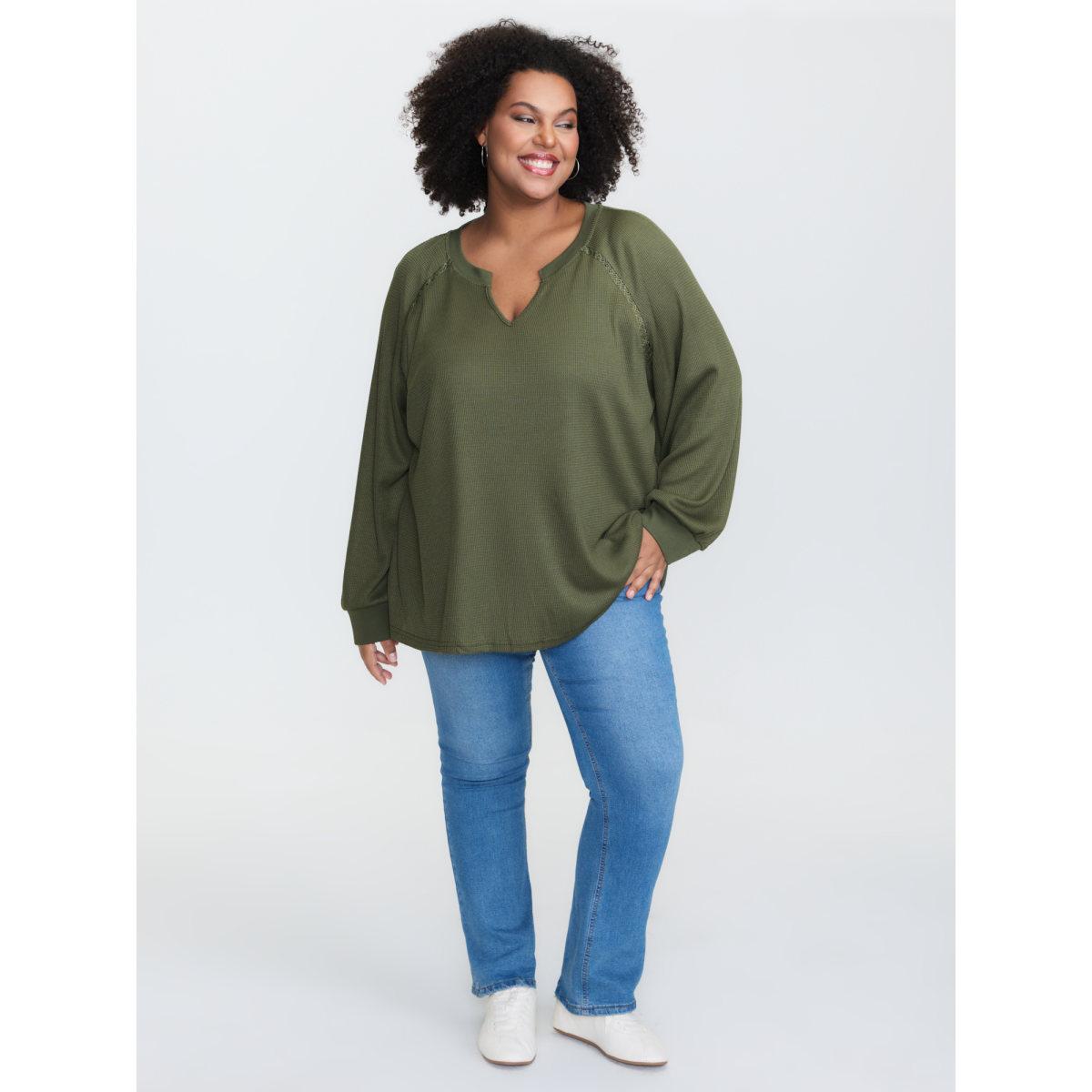 Plus Size Waffle Grid Notched Collar Lace Sweatshirt Women ArmyGreen Leisure Woven ribbon&lace trim Flat collar with V-notch Casual Sweatshirts BloomChic 14-16/1X