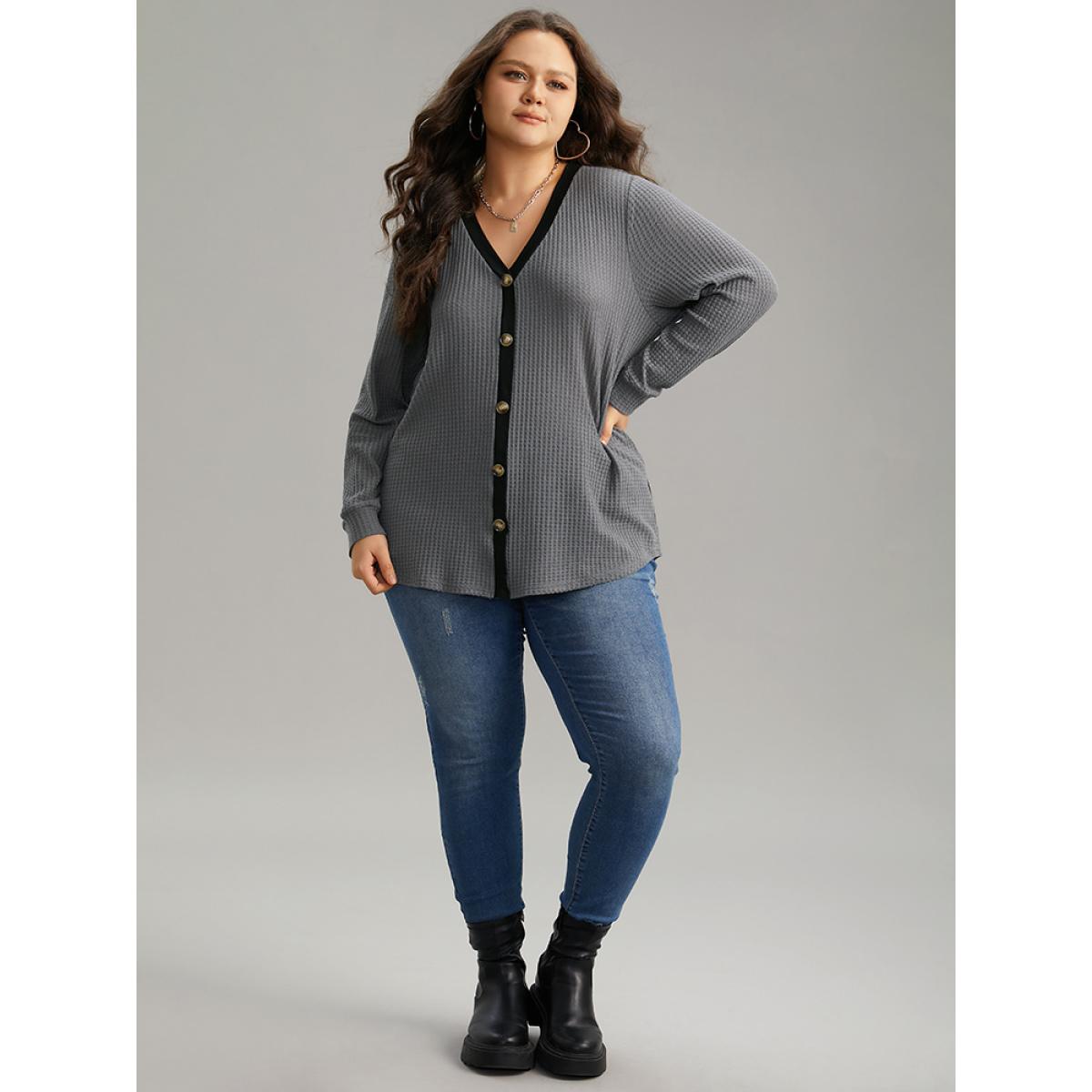 Plus Size Waffle Knit Button Detail Contrast Trim T-shirt Gray Women Casual Waffle Knit Plain Open Front Dailywear T-shirts BloomChic 10/M