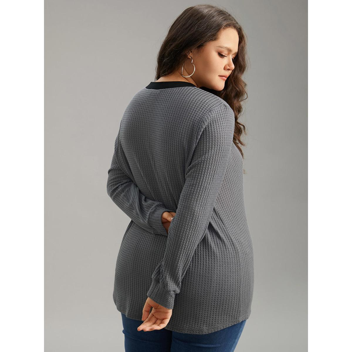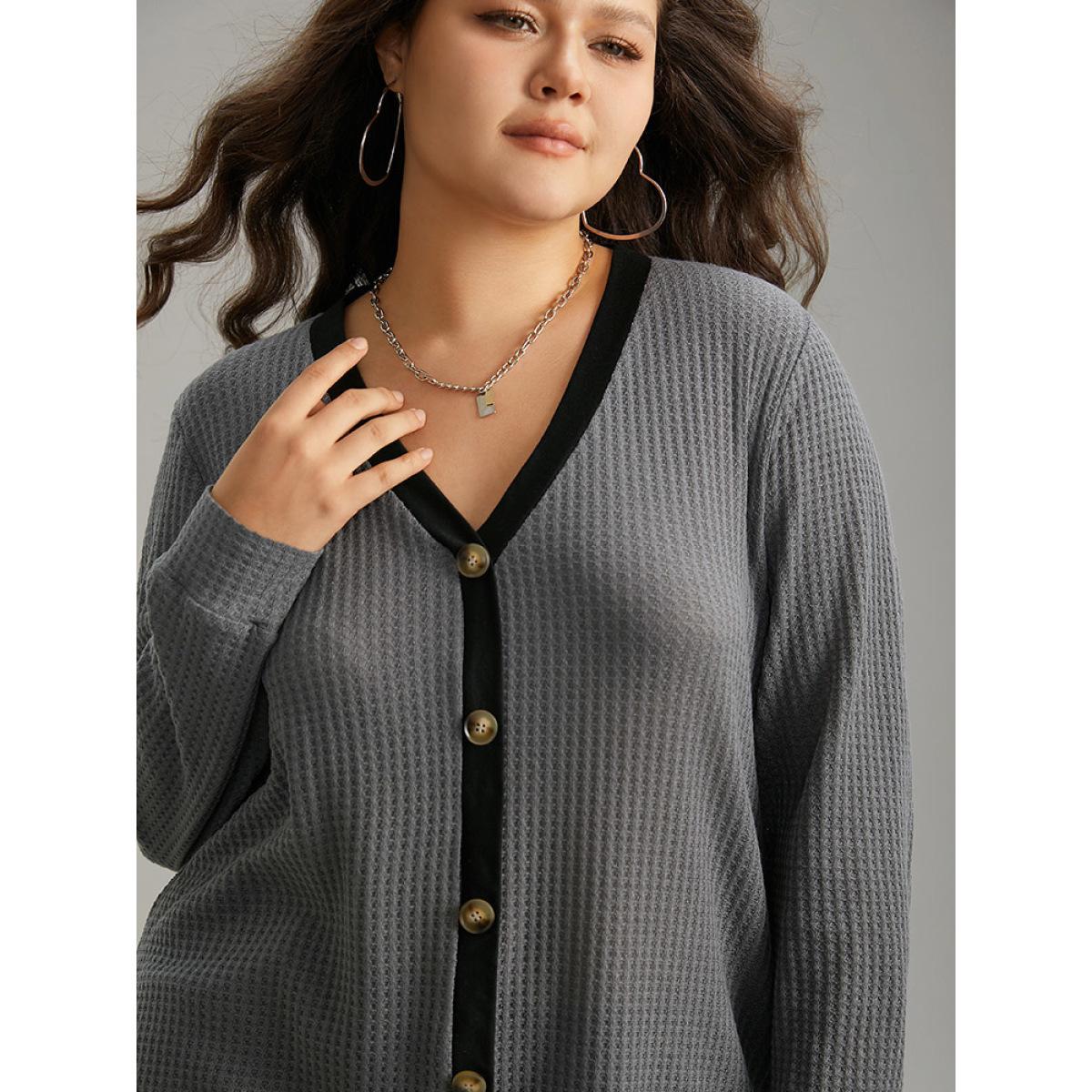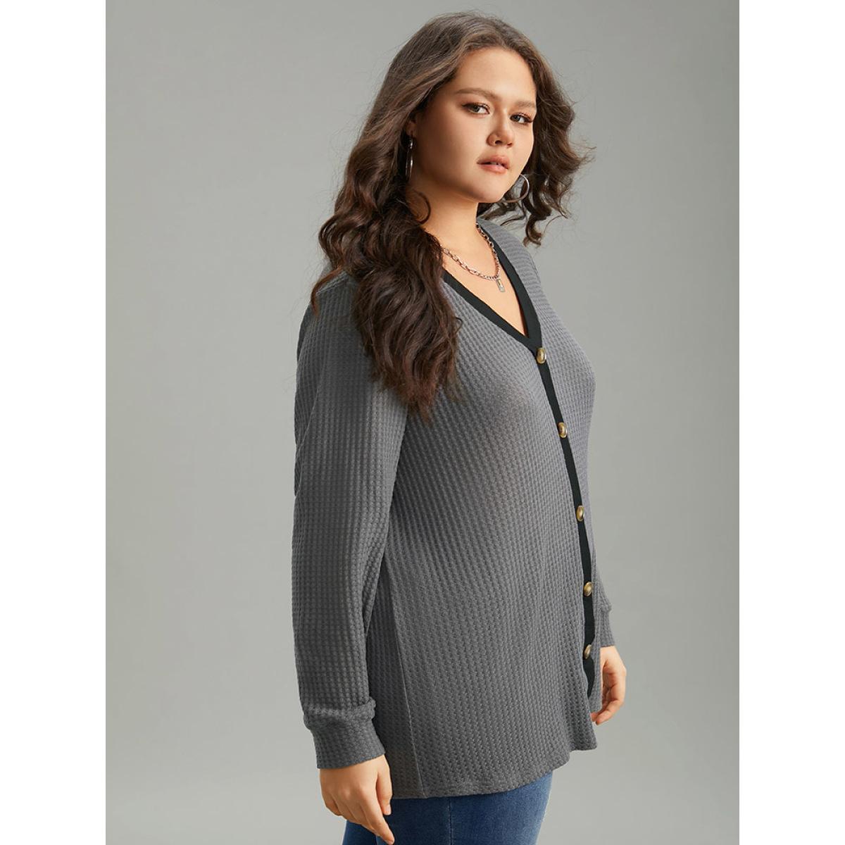 Plus Size Waffle Knit Button Detail Contrast Trim T-shirt Gray Women Casual Waffle Knit Plain Open Front Dailywear T-shirts BloomChic 10/M Product Image
