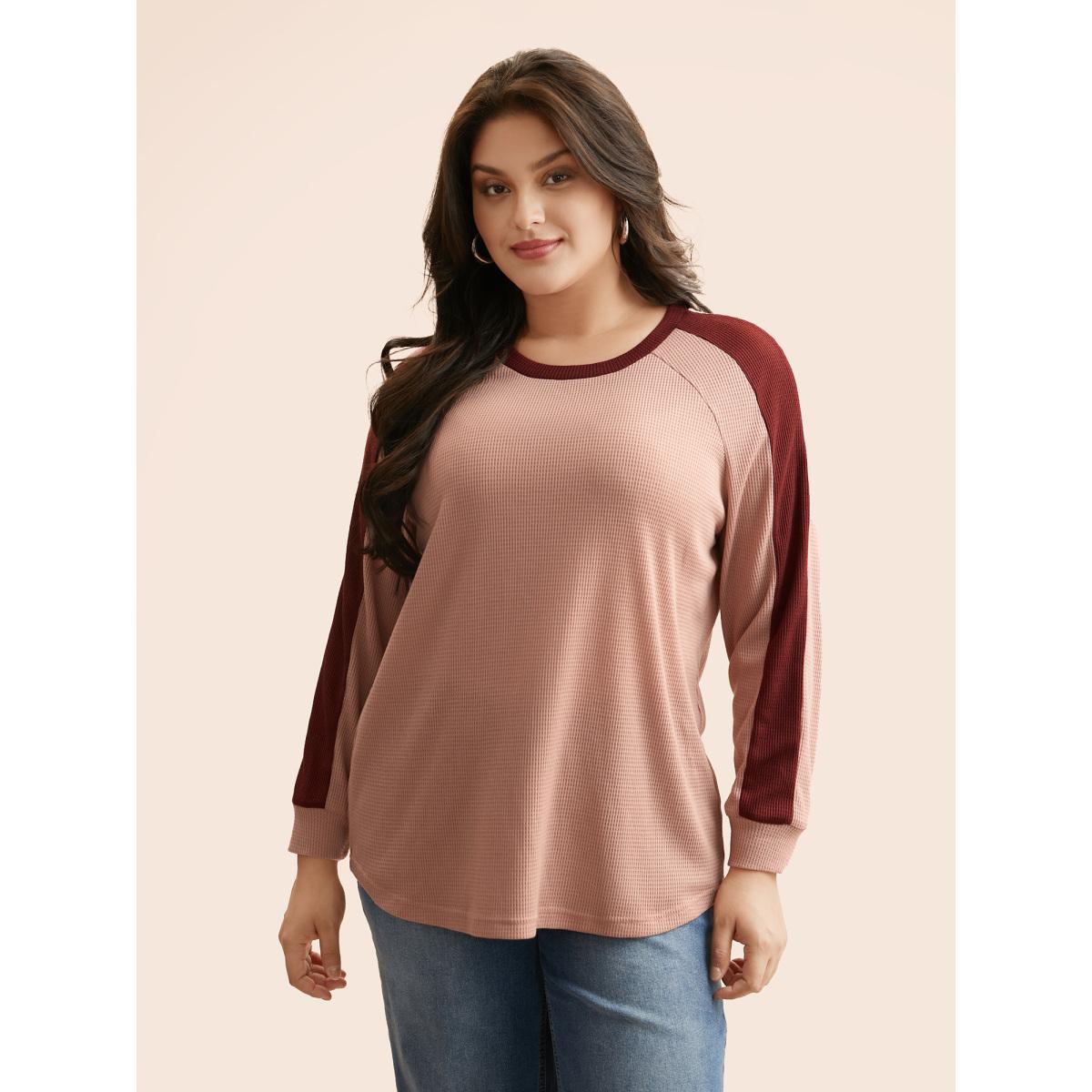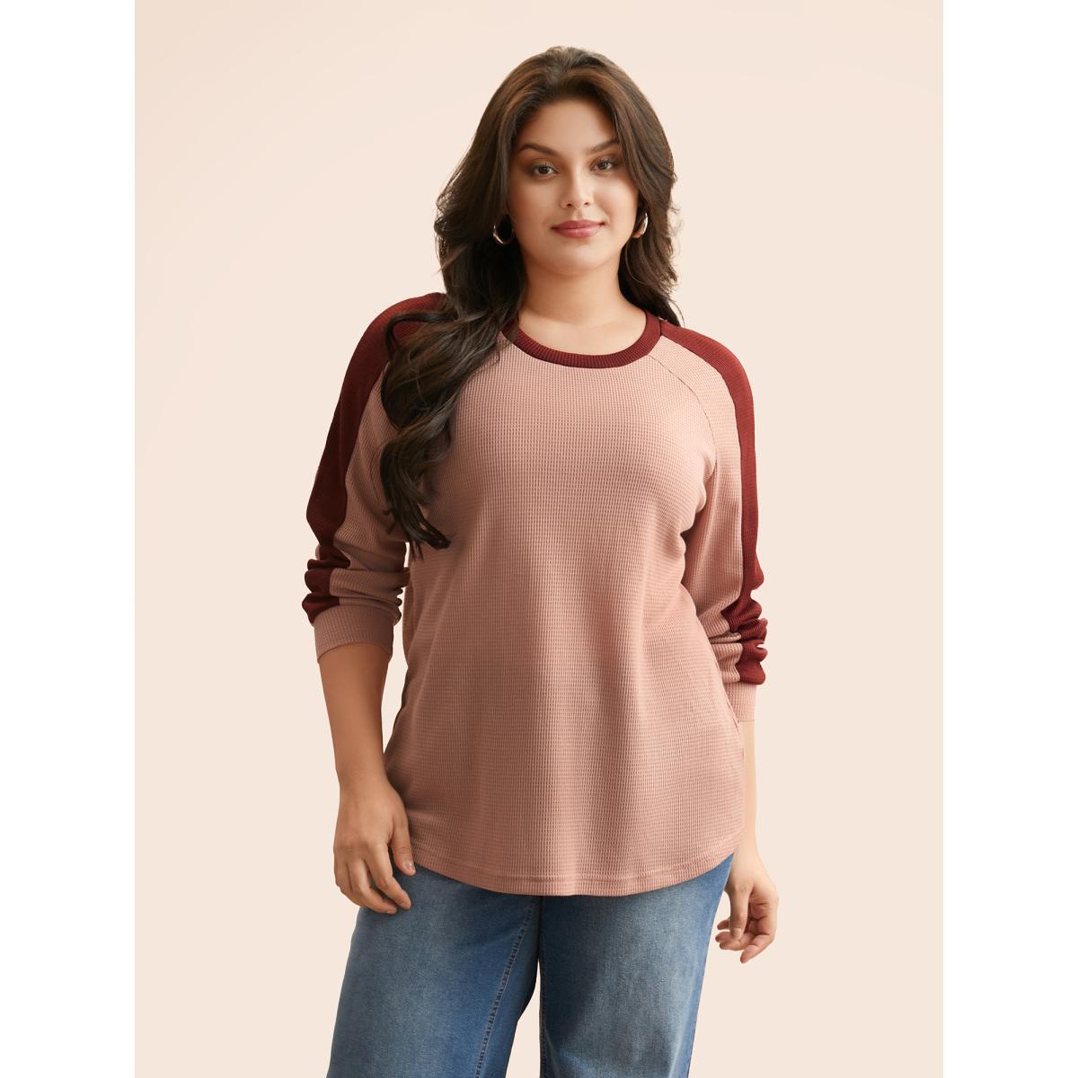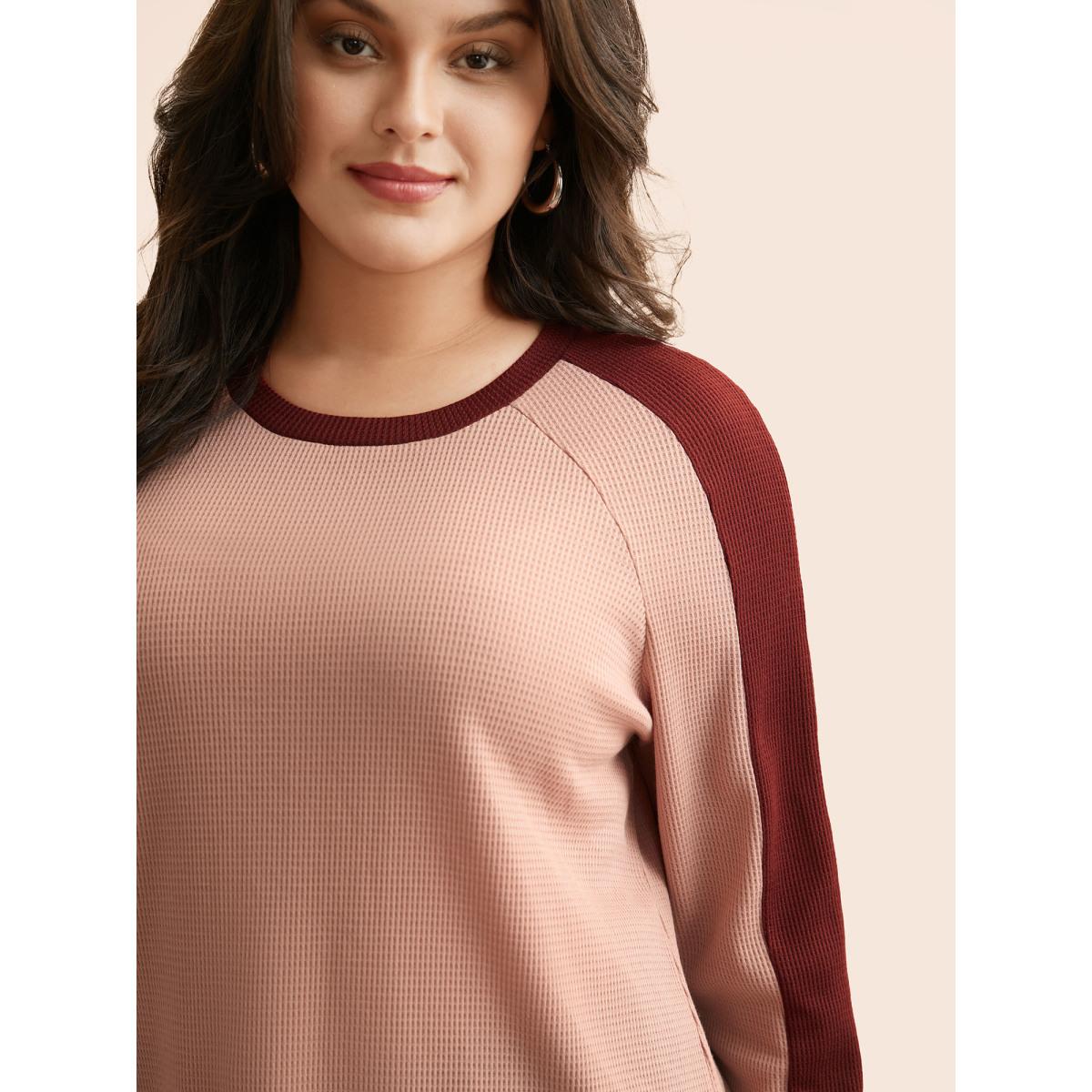 Plus Size Waffle Knit Contrast Patchwork T-shirt Dirtypink Women Elegant Texture Round Neck Everyday T-shirts BloomChic 12/L