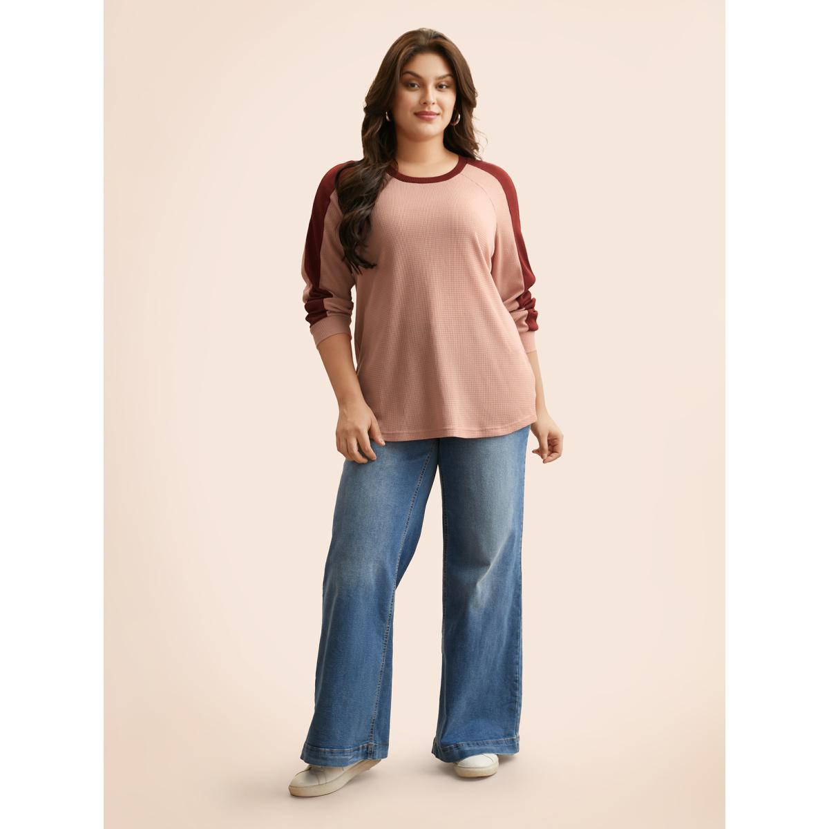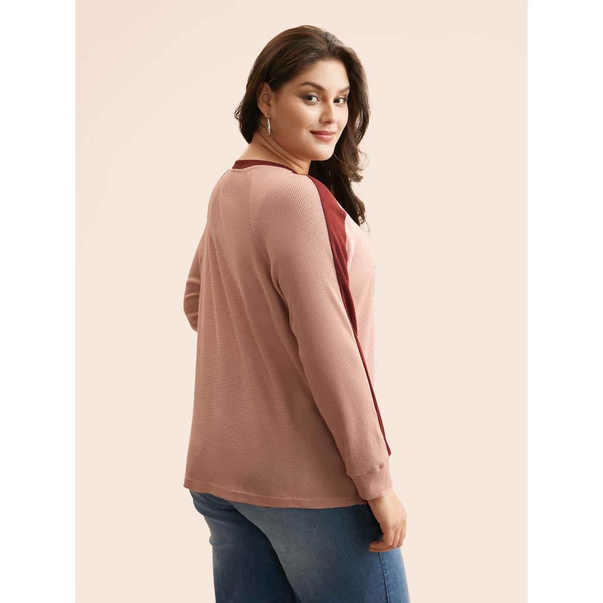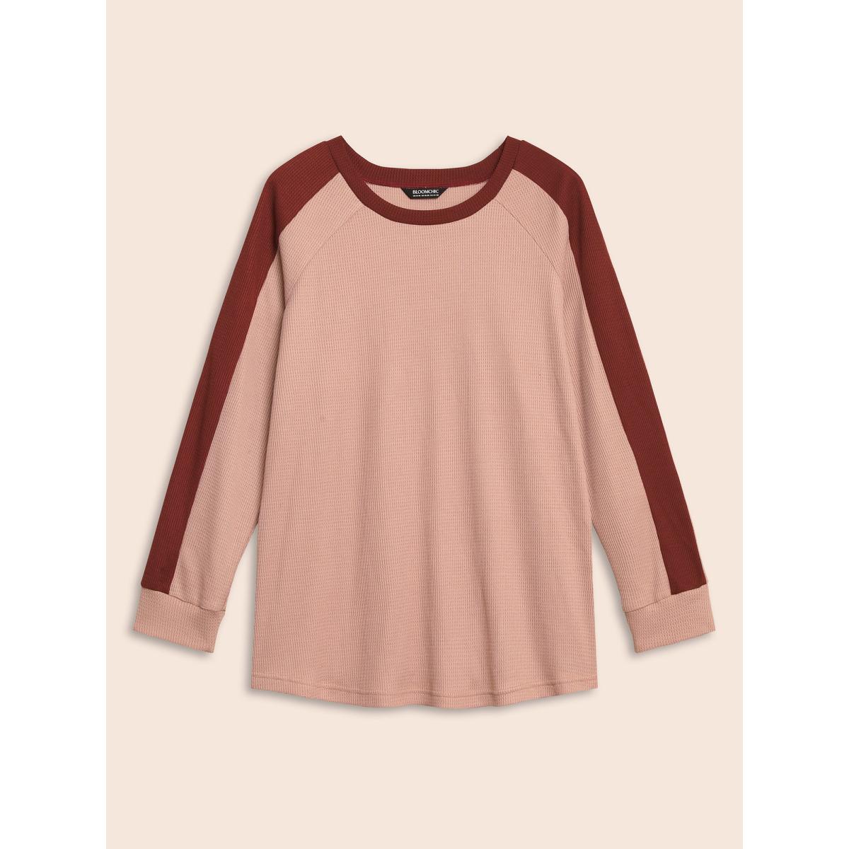 Plus Size Waffle Knit Contrast Patchwork T-shirt Dirtypink Women Elegant Texture Round Neck Everyday T-shirts BloomChic 12/L