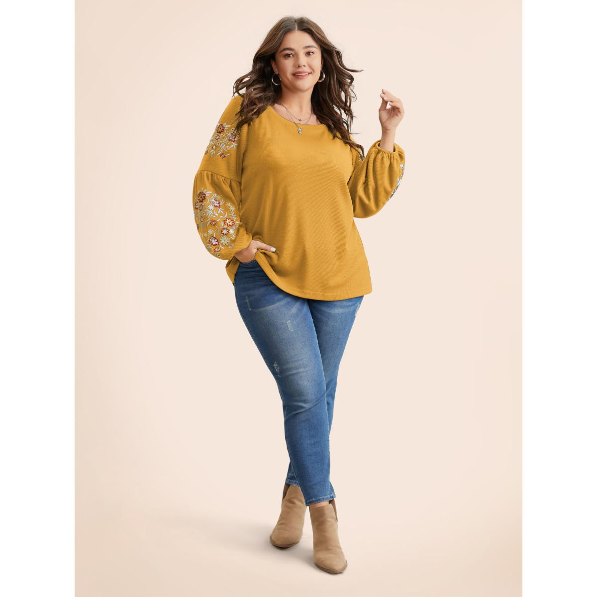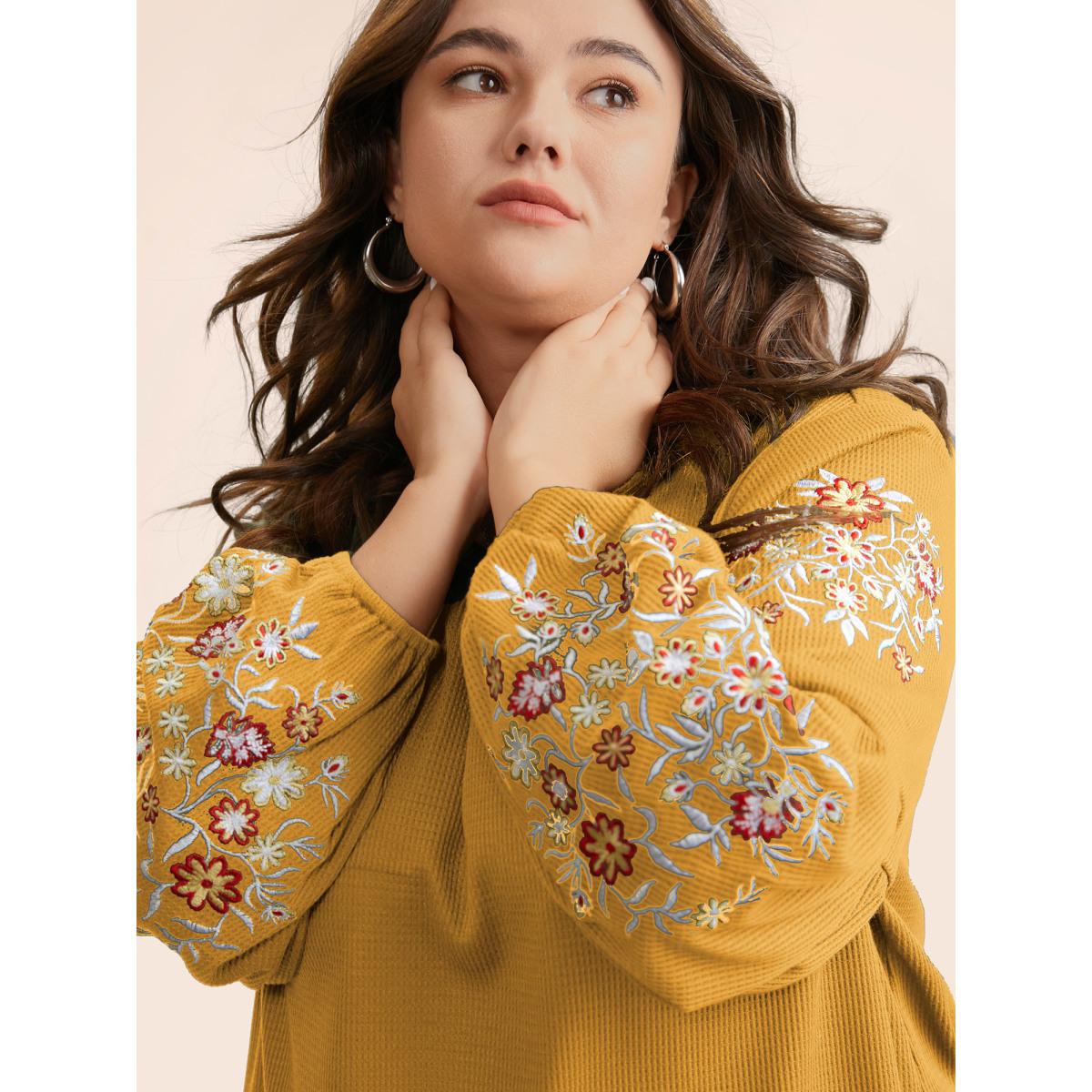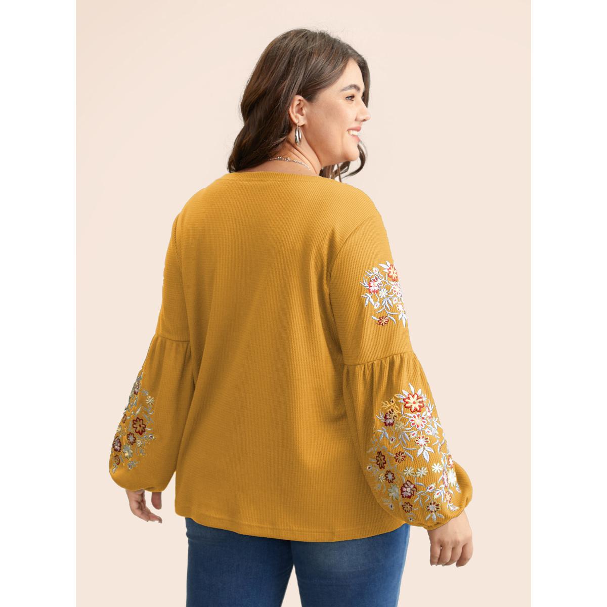 Plus Size Waffle Knit Floral Embroidered Lantern Sleeve T-shirt Turmeric Women Leisure Texture Floral Round Neck Casual T-shirts BloomChic 18-20/2X