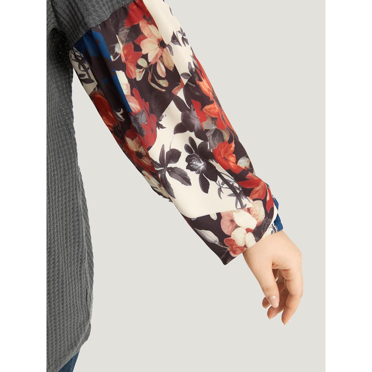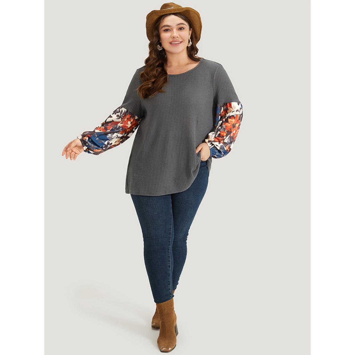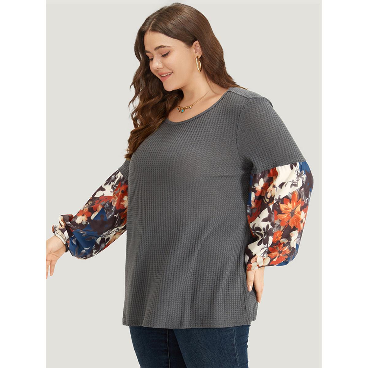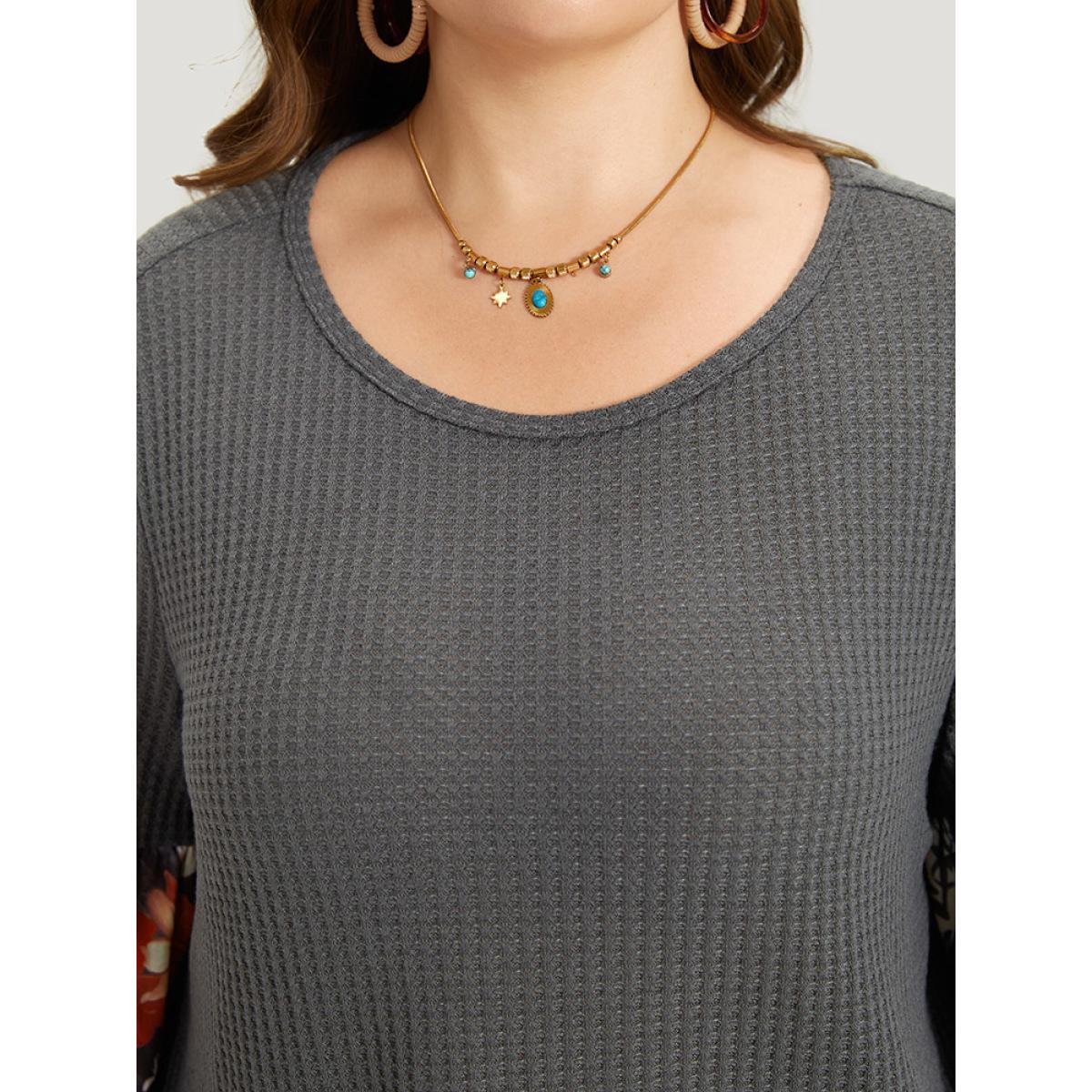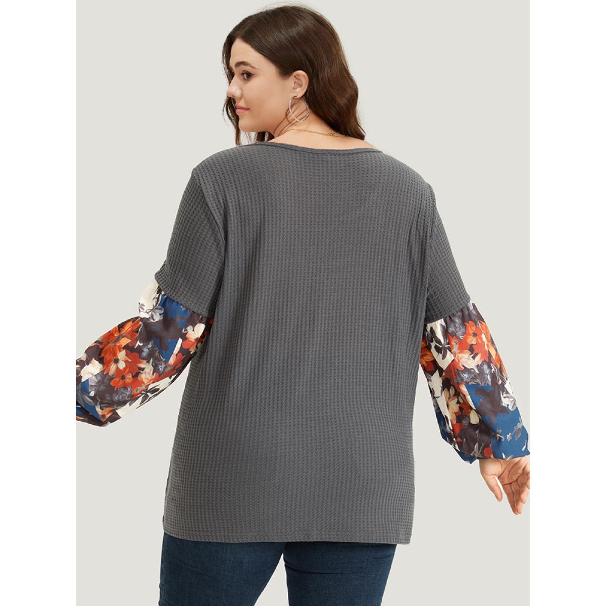 Plus Size Waffle Knit Floral Print Patchwork Elastic Cuffs T-shirt Gray Women Resort Elastic cuffs Bohemian Print Round Neck Vacation T-shirts BloomChic 26/4X