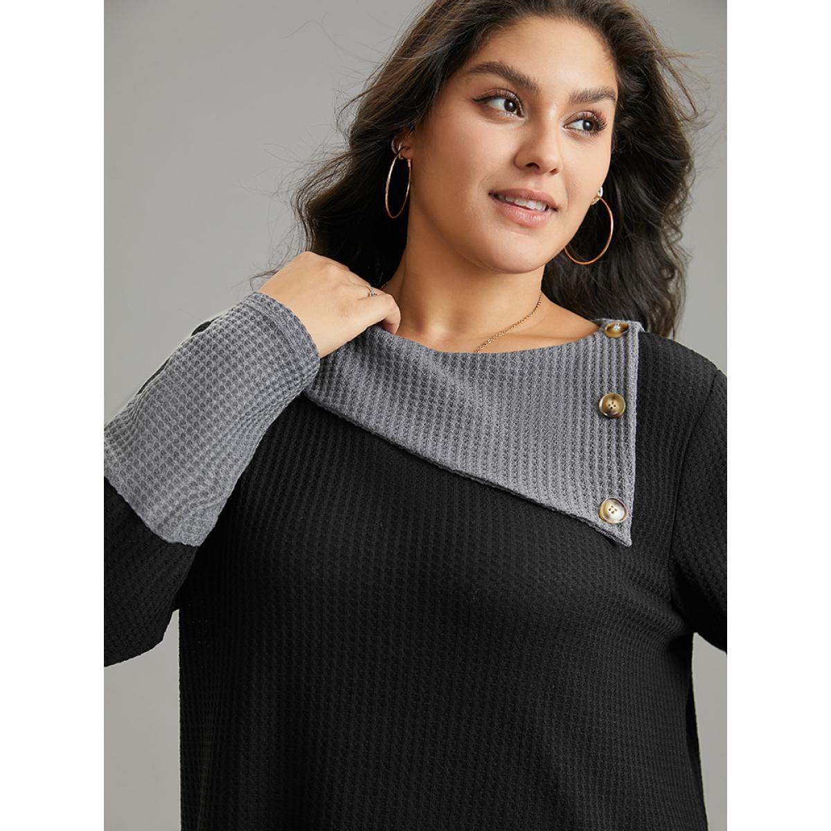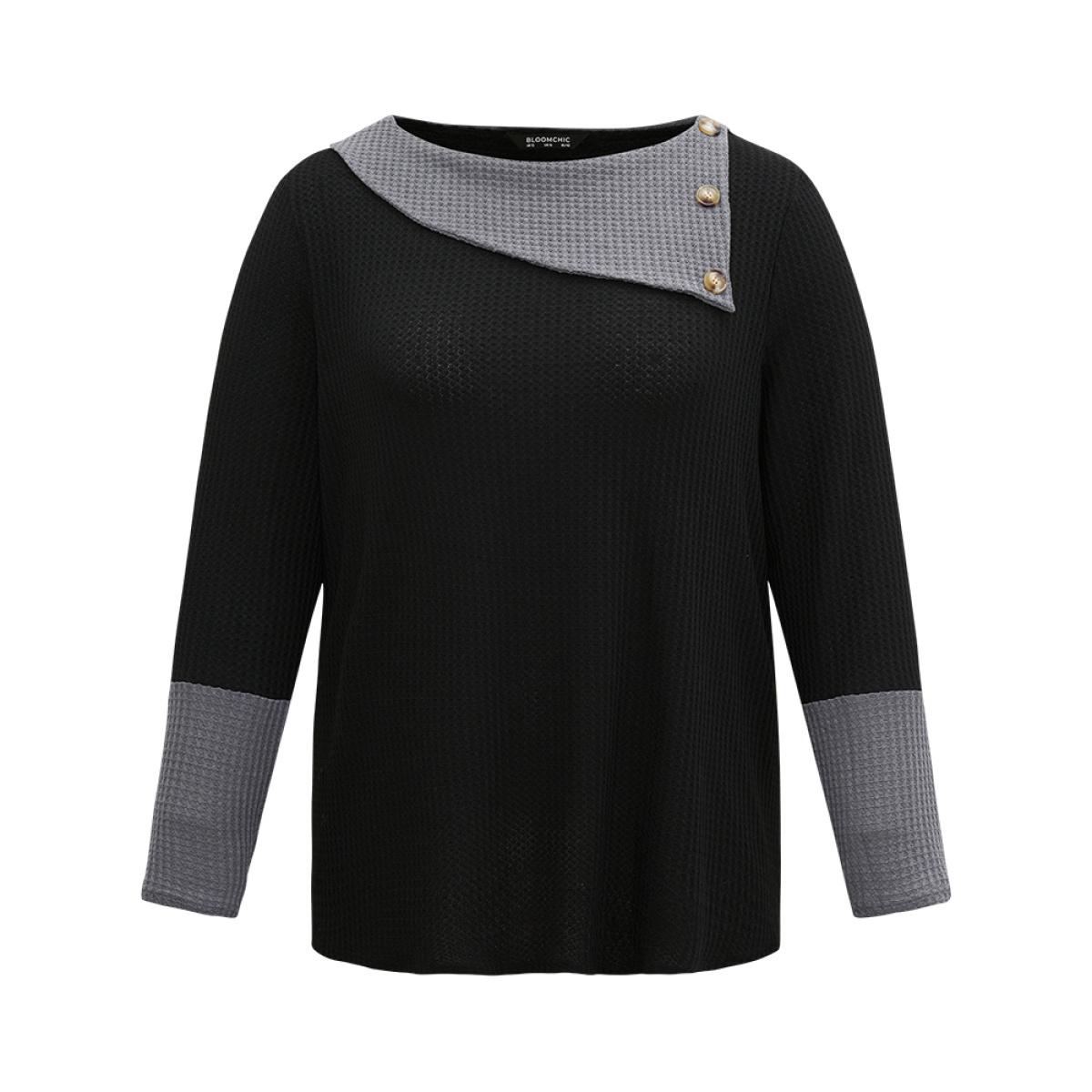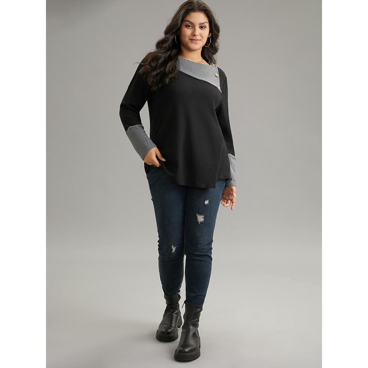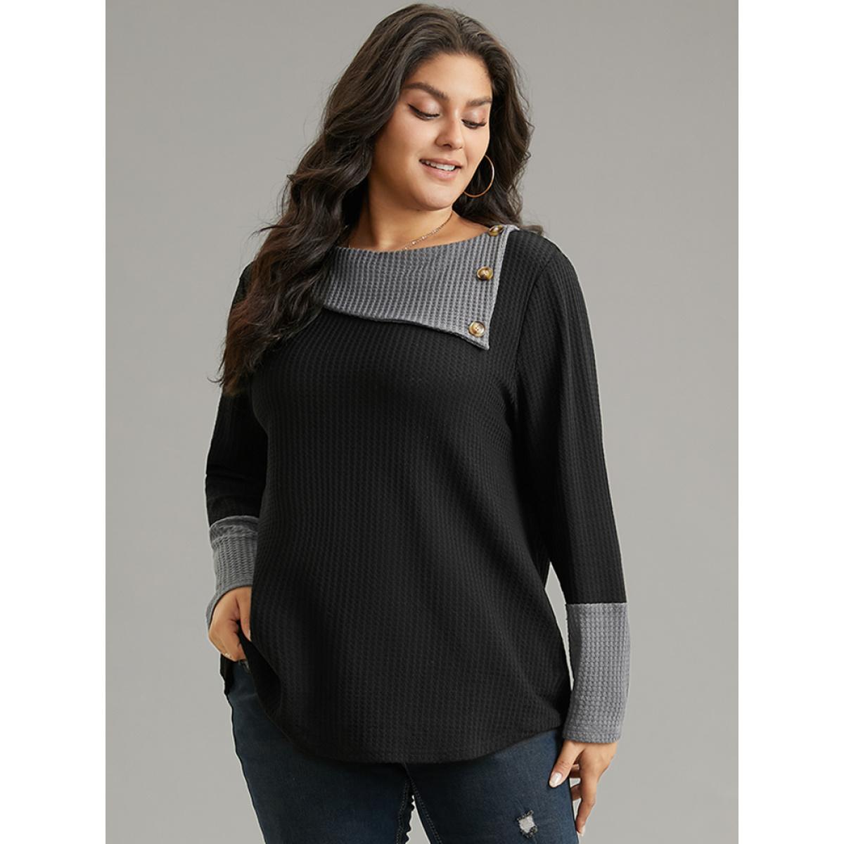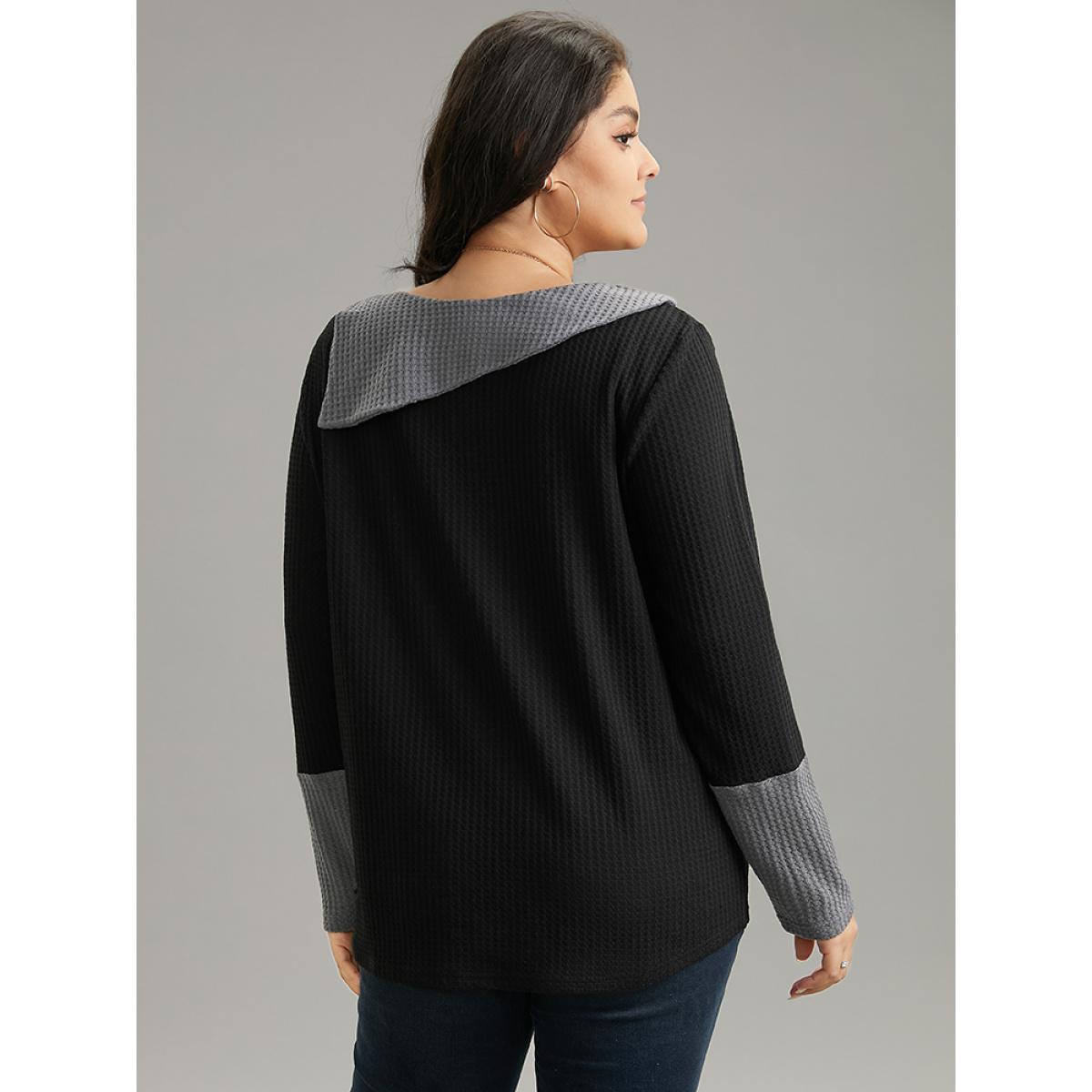 Plus Size Waffle Knit Lapel Collar Patchwork T-shirt Black Women Casual Waffle Knit Plain Round Neck Dailywear T-shirts BloomChic 18-20/2X
