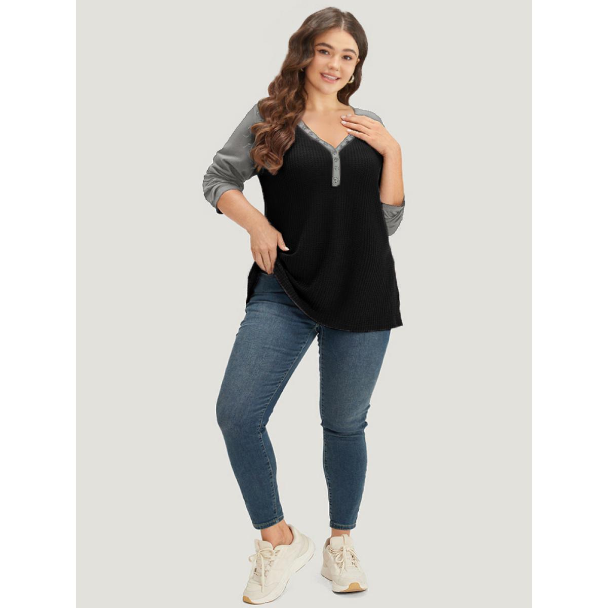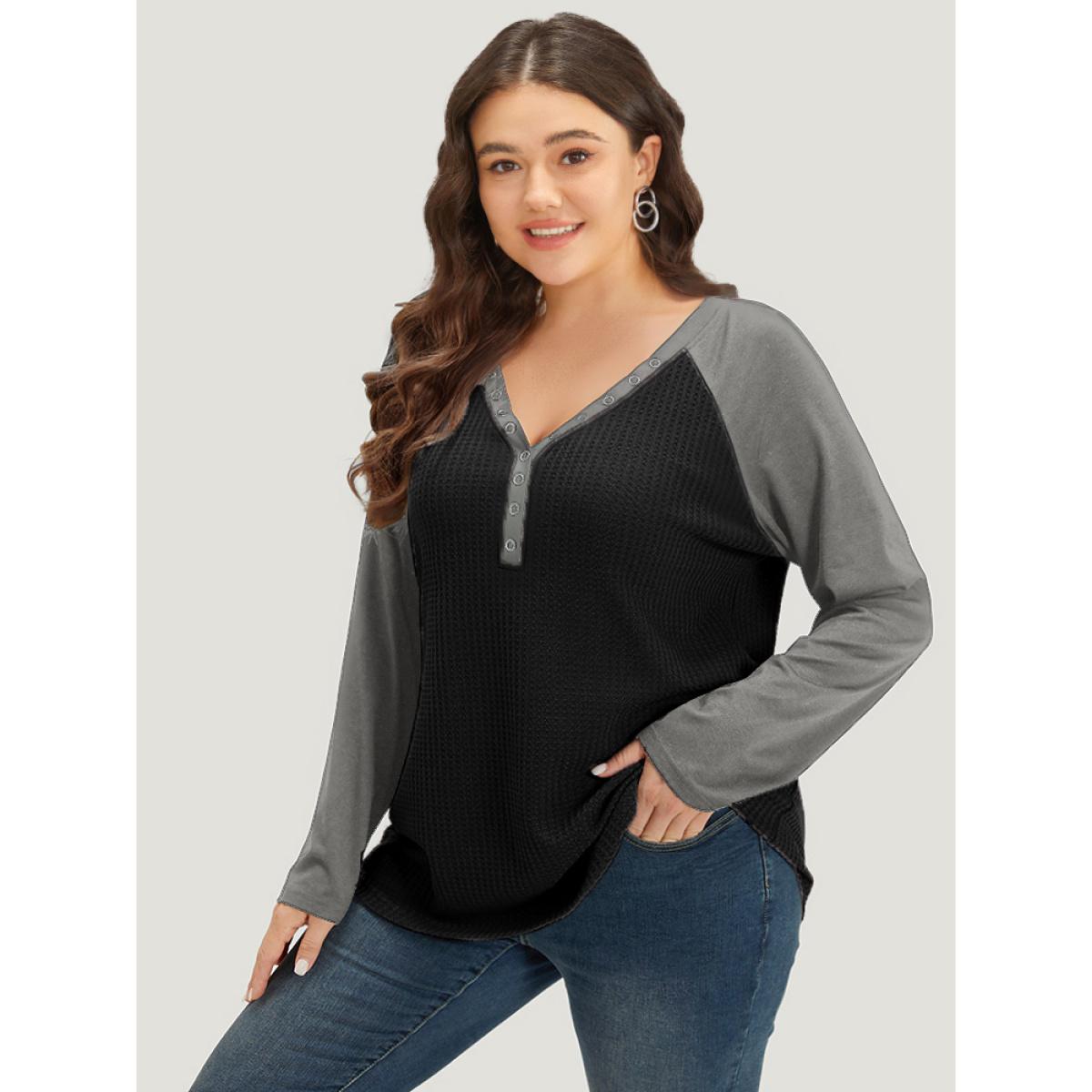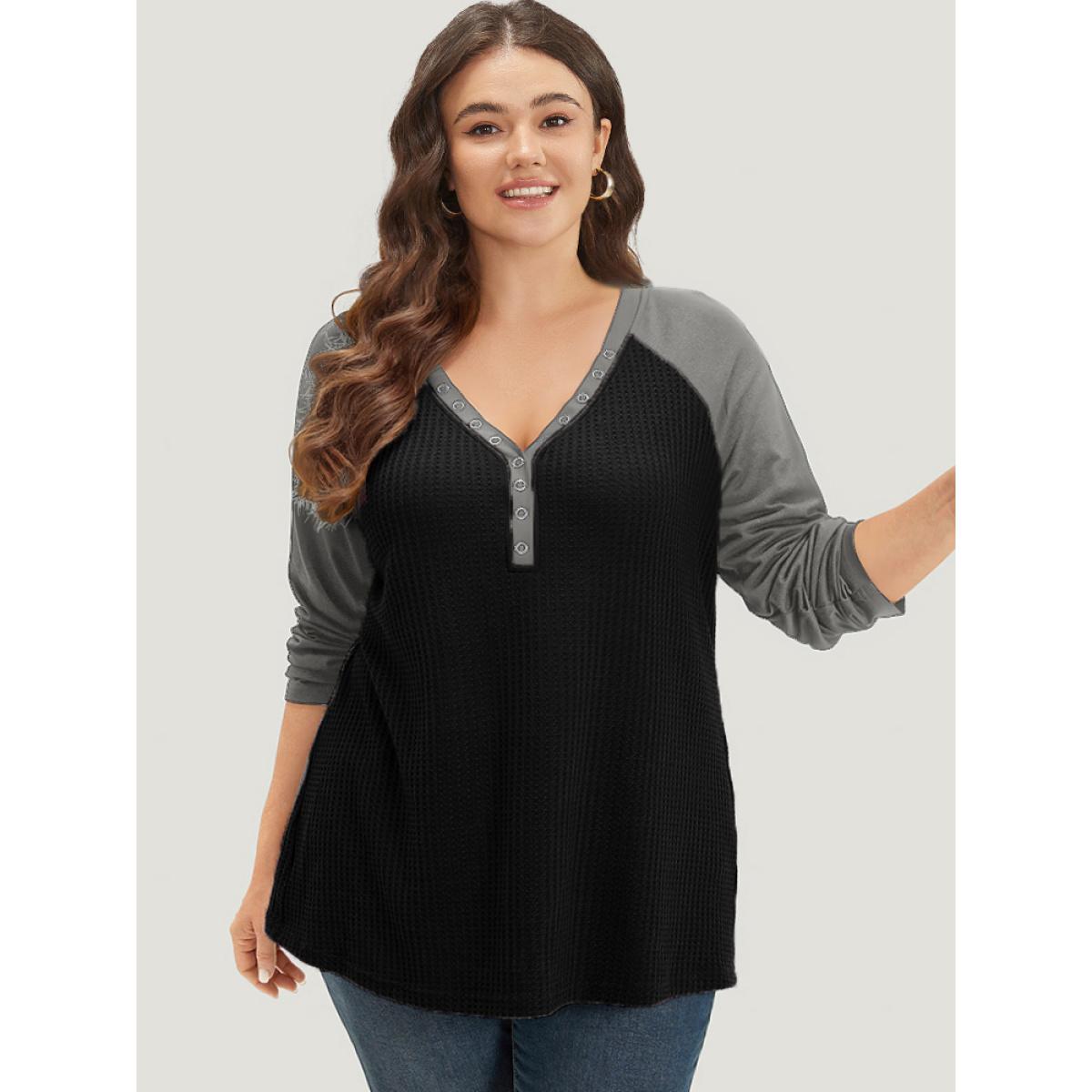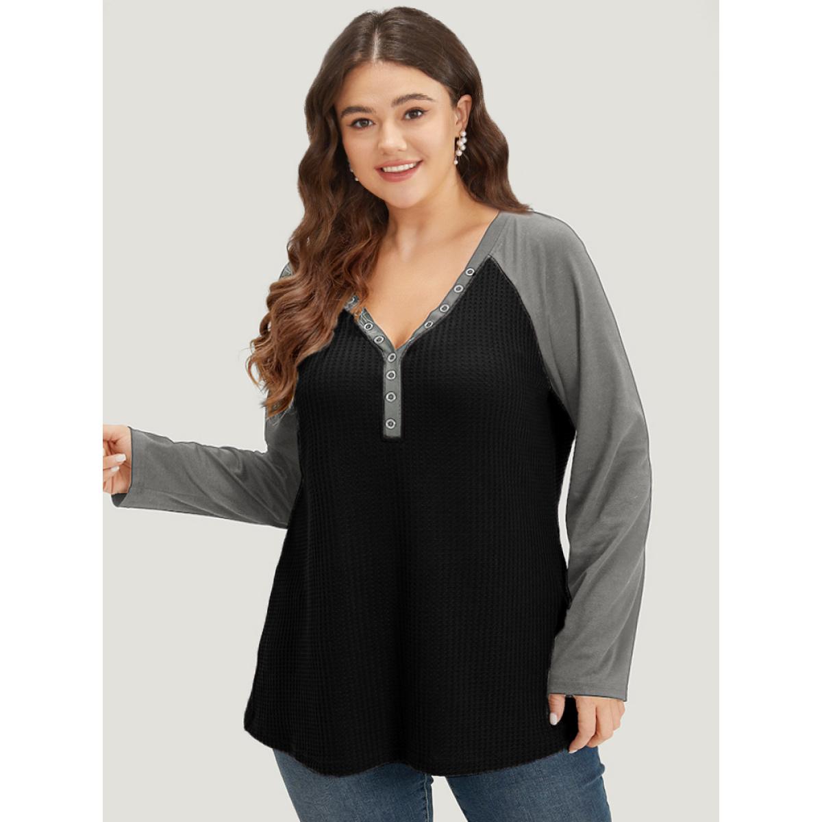Plus Size Waffle Knit Raglan Sleeve Metal Buckle Detail T-shirt Black Women Casual Contrast Plain Everyday T-shirts BloomChic 30/6X