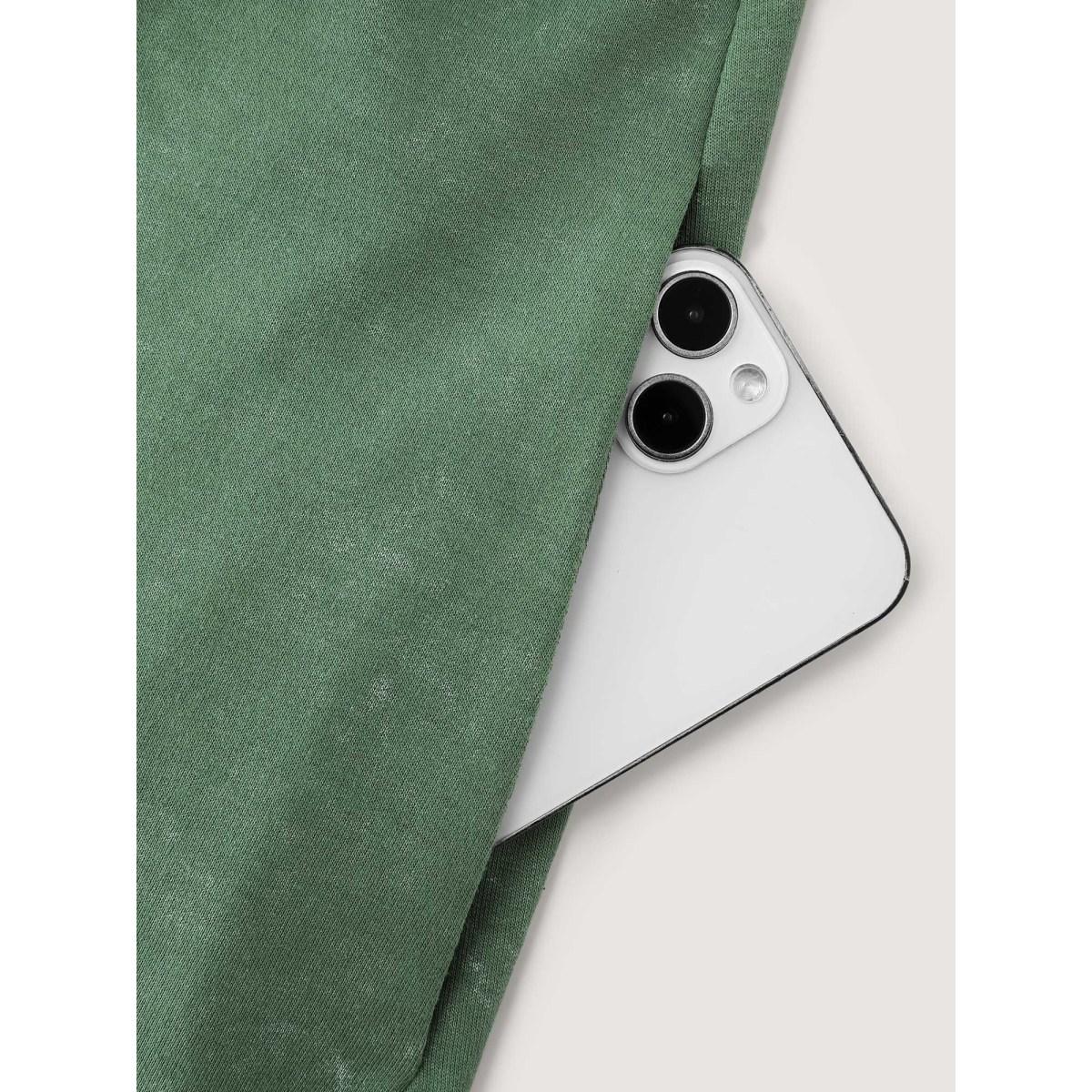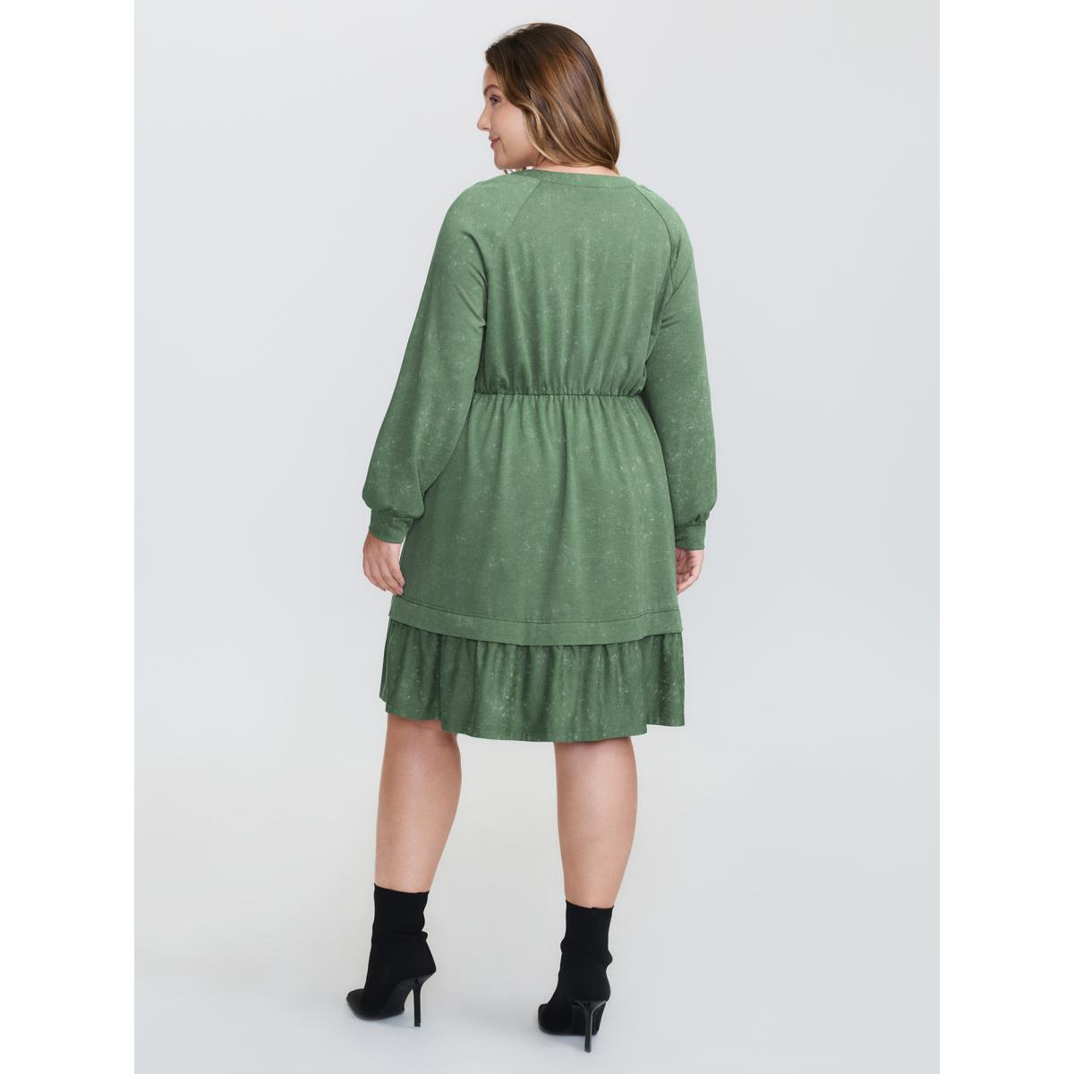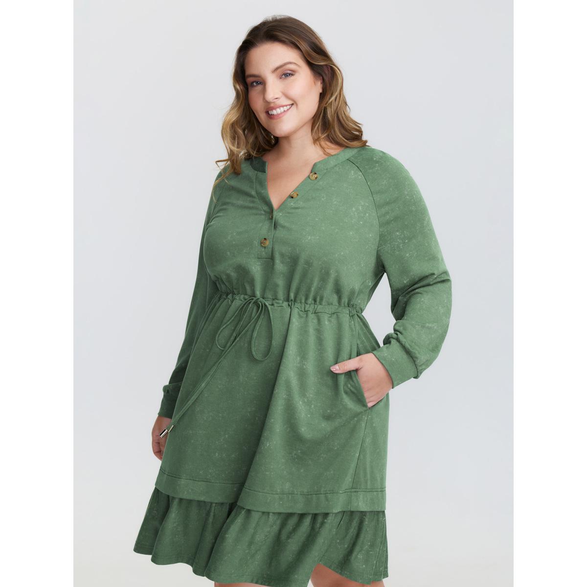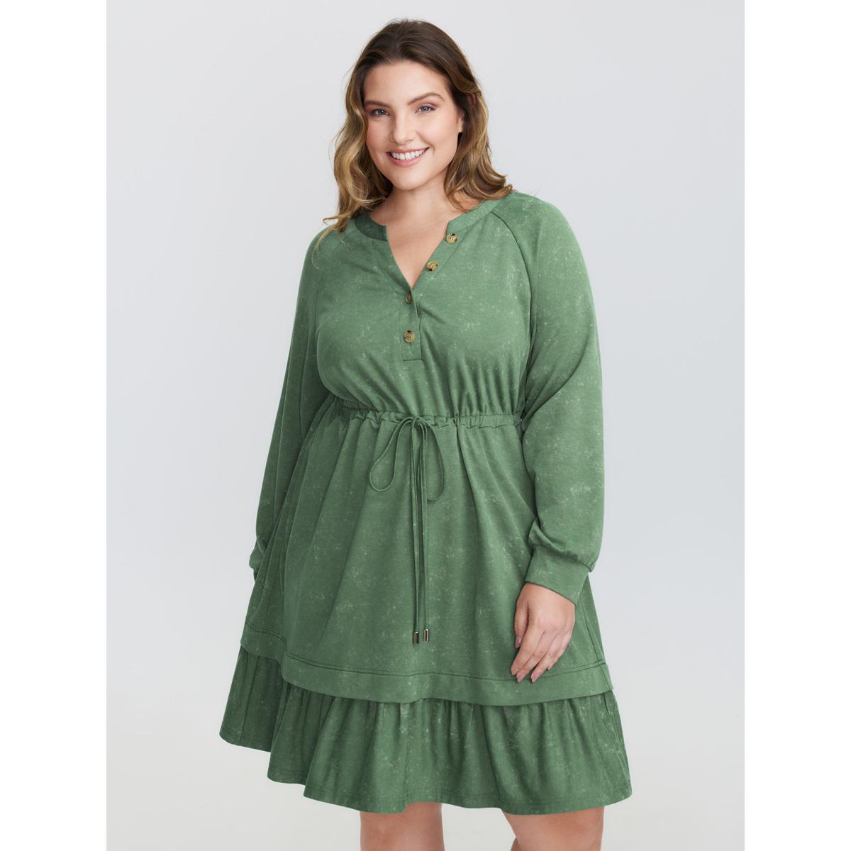 Plus Size Washed Effect Tiered Drawstring Mini Dress Moss Women Leisure Drawstring Flat collar with V-notch Extra Long Sleeve Curvy BloomChic 14-16/1X