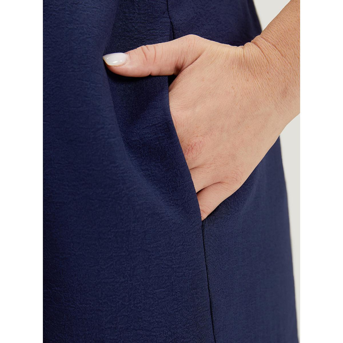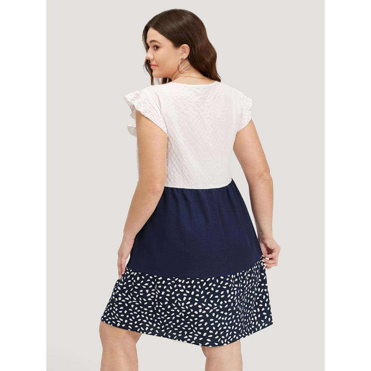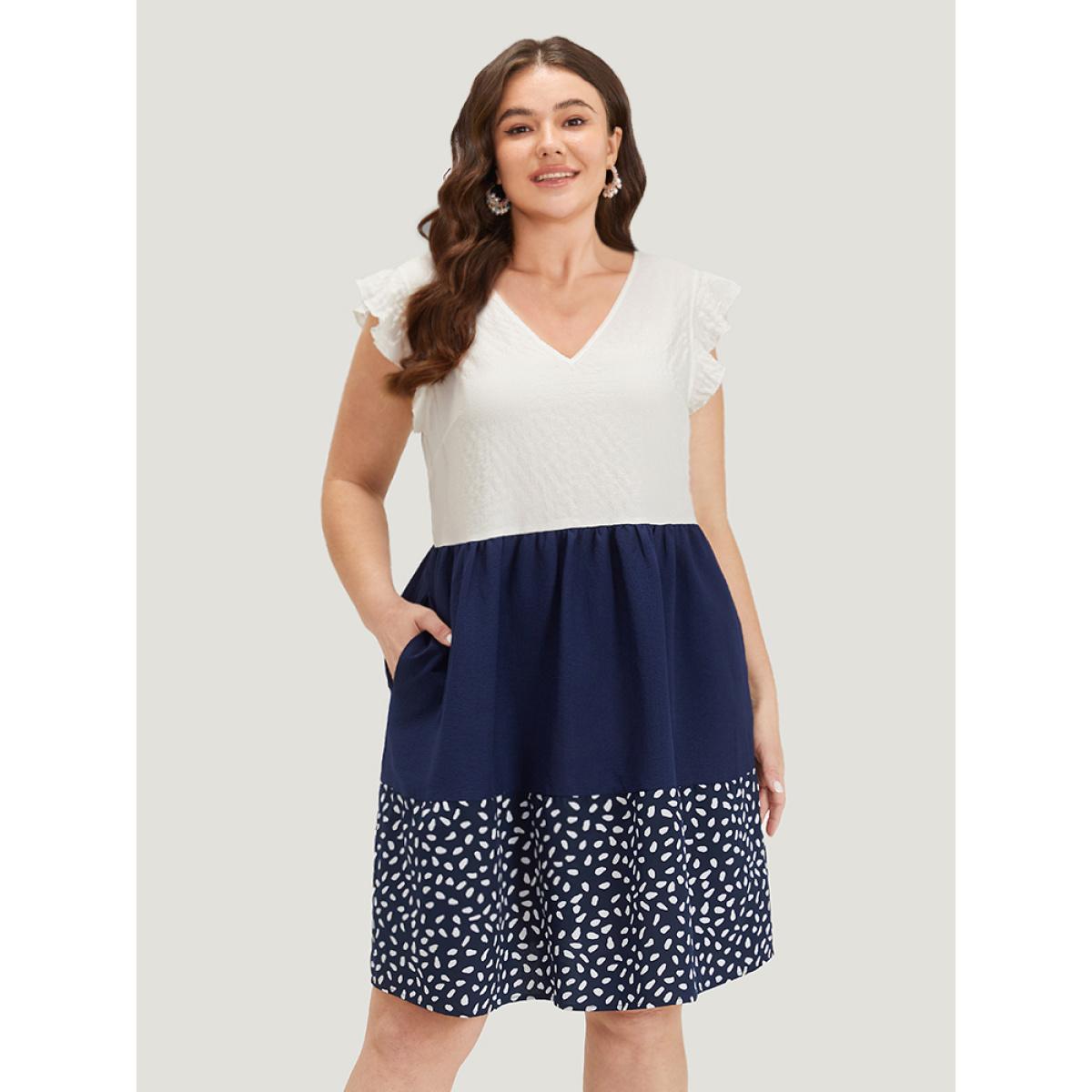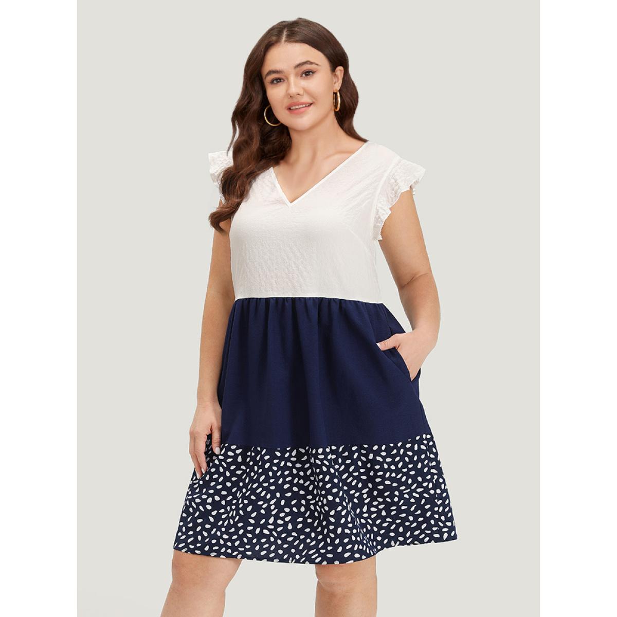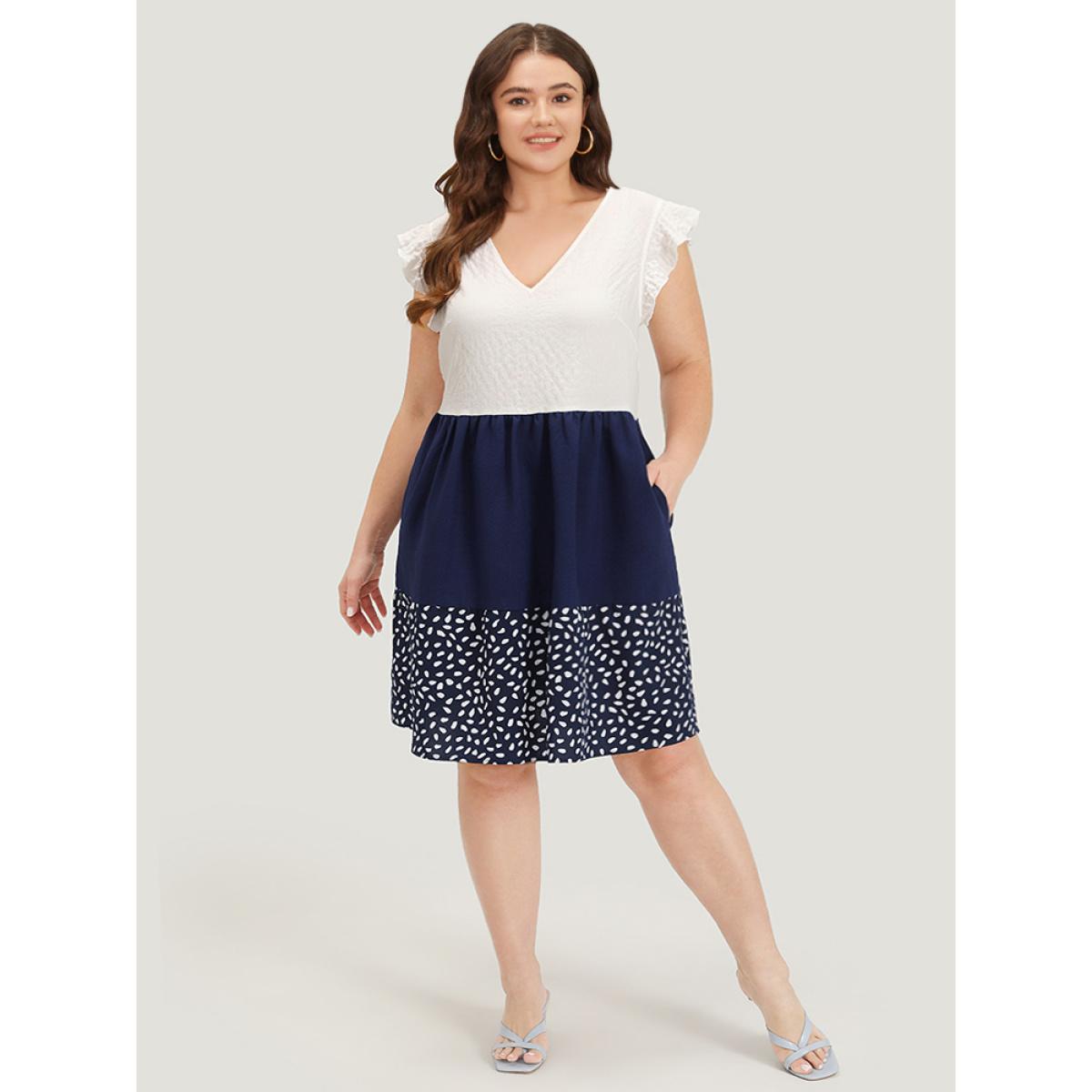 Plus Size Water Drop Print Patchwork Ruffle Cap Sleeve Pocket Dress DarkBlue Women Elegant Contrast V-neck Cap Sleeve Curvy Knee Dress BloomChic 14-16/1X