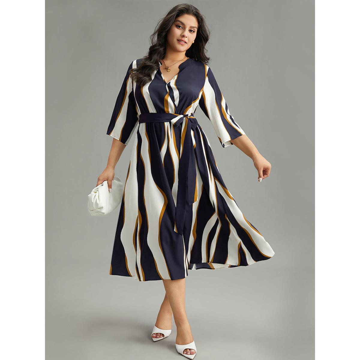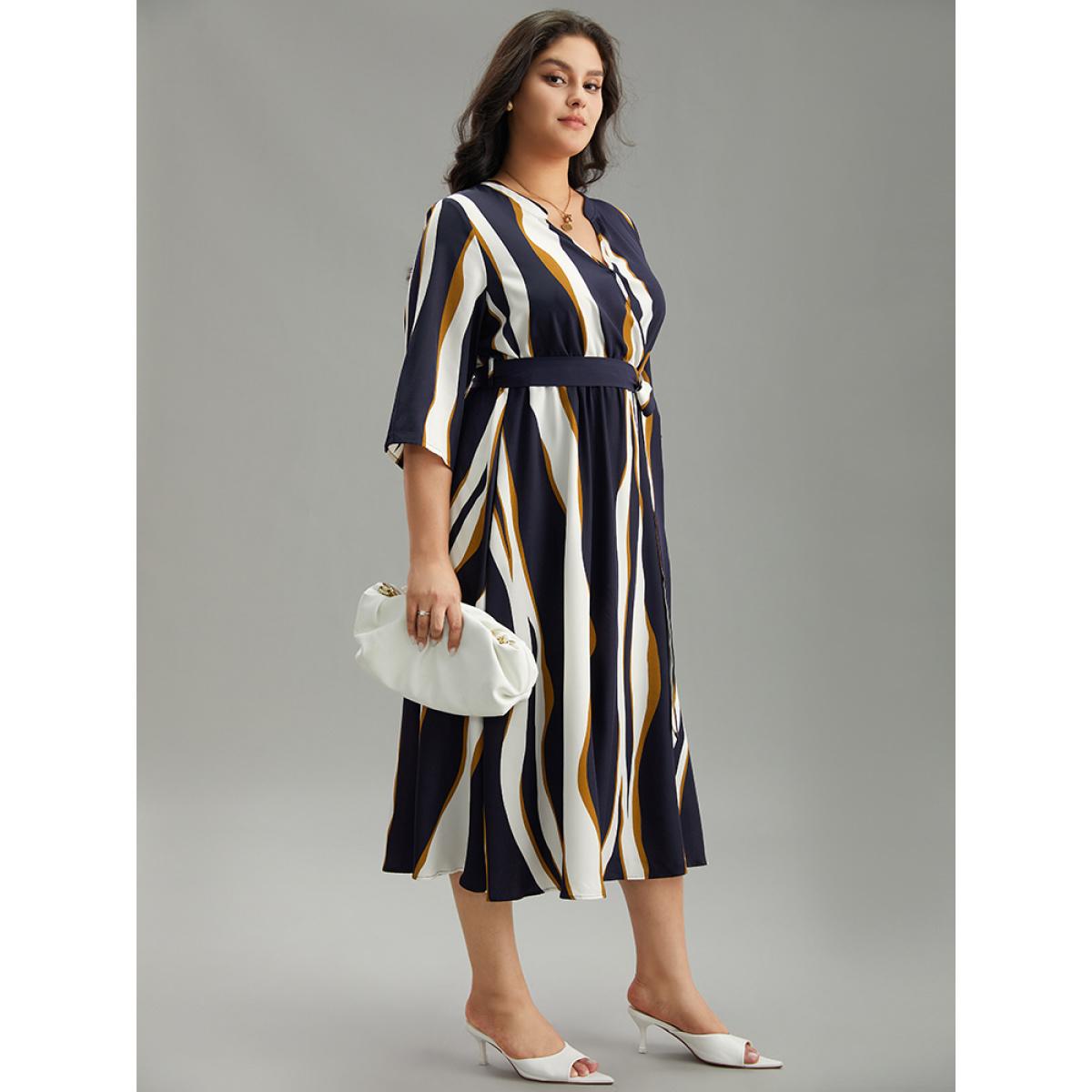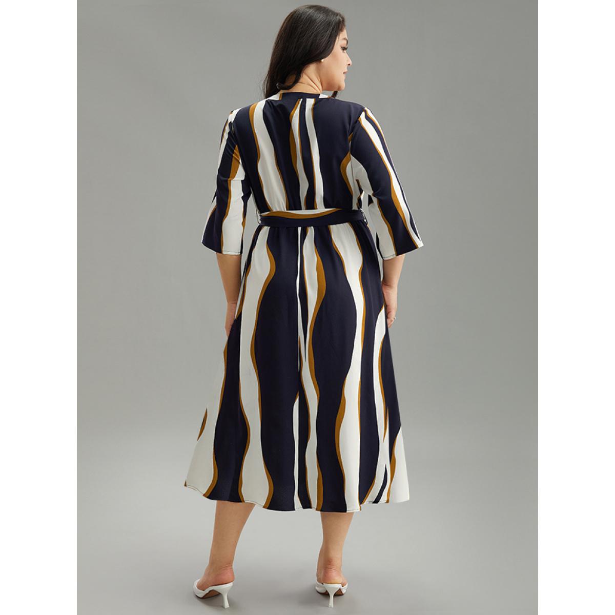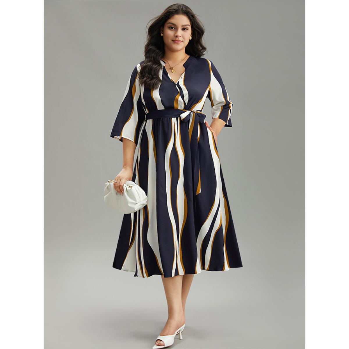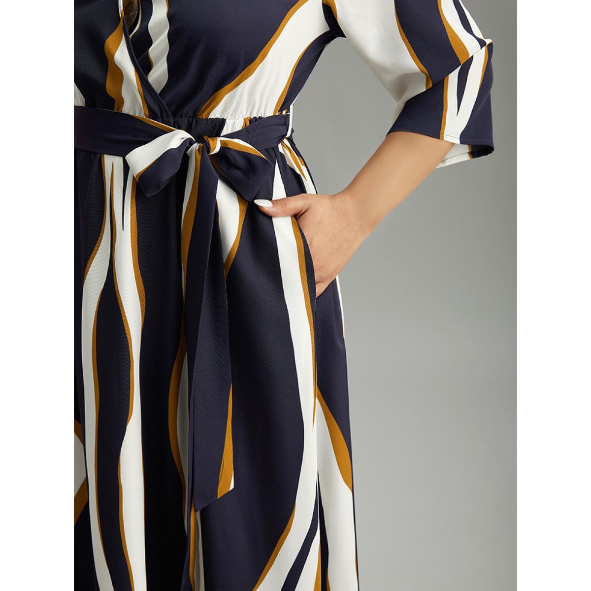 Plus Size Water Ripple Belted Overlap Collar Pocket Dress Indigo Women Office Wrap Overlap Collar Elbow-length sleeve Curvy Midi Dress BloomChic 22-24/3X