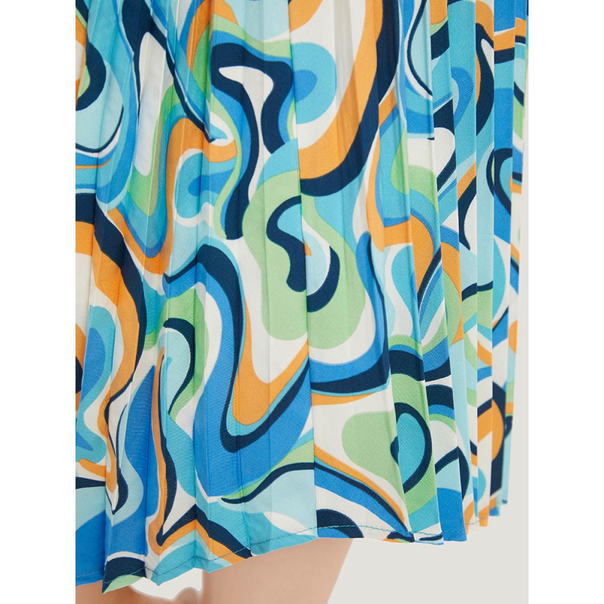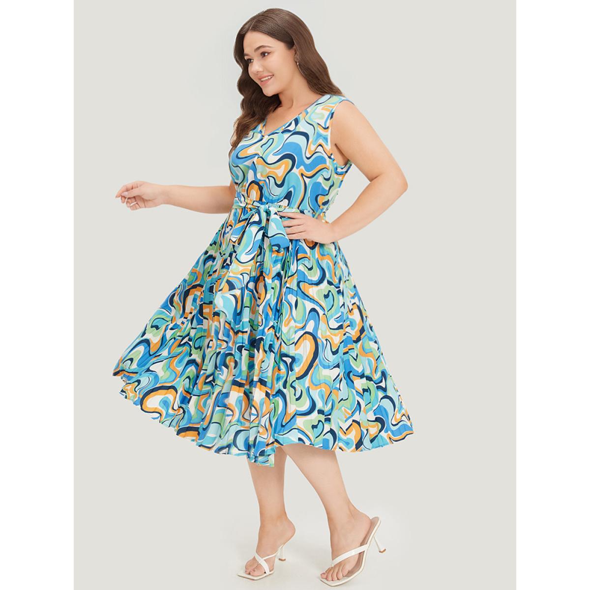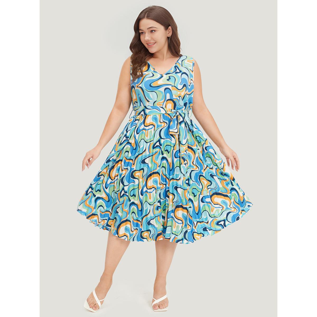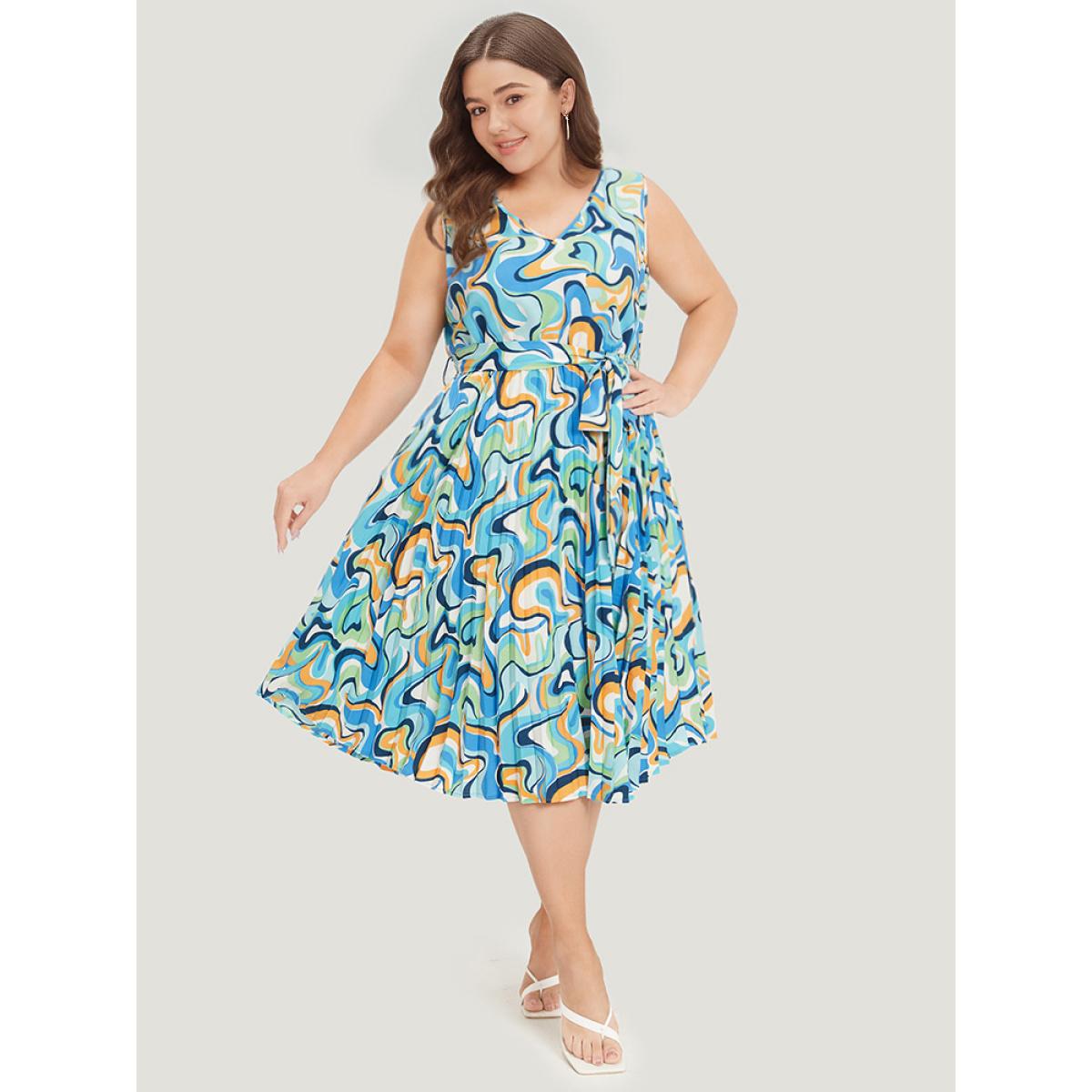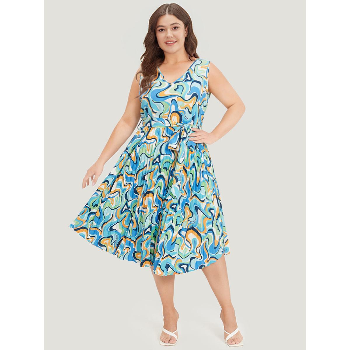 Plus Size Water Ripple Print V Neck Belted Plicated Detail Tank Dress Blue Women Elegant Belted V-neck Sleeveless Curvy Midi Dress BloomChic 18-20/2X