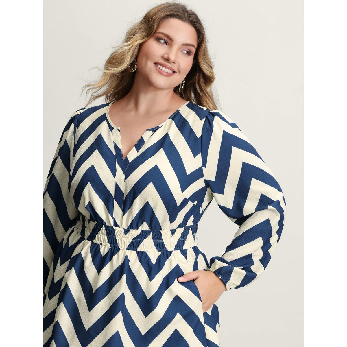 Plus Size Wavy Textured Stretchy Waist Midi Dress Navy Women Office Shirred Flat collar with V-notch Long Sleeve Curvy BloomChic 14-16/1X