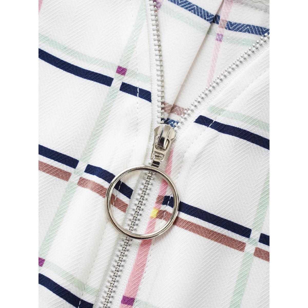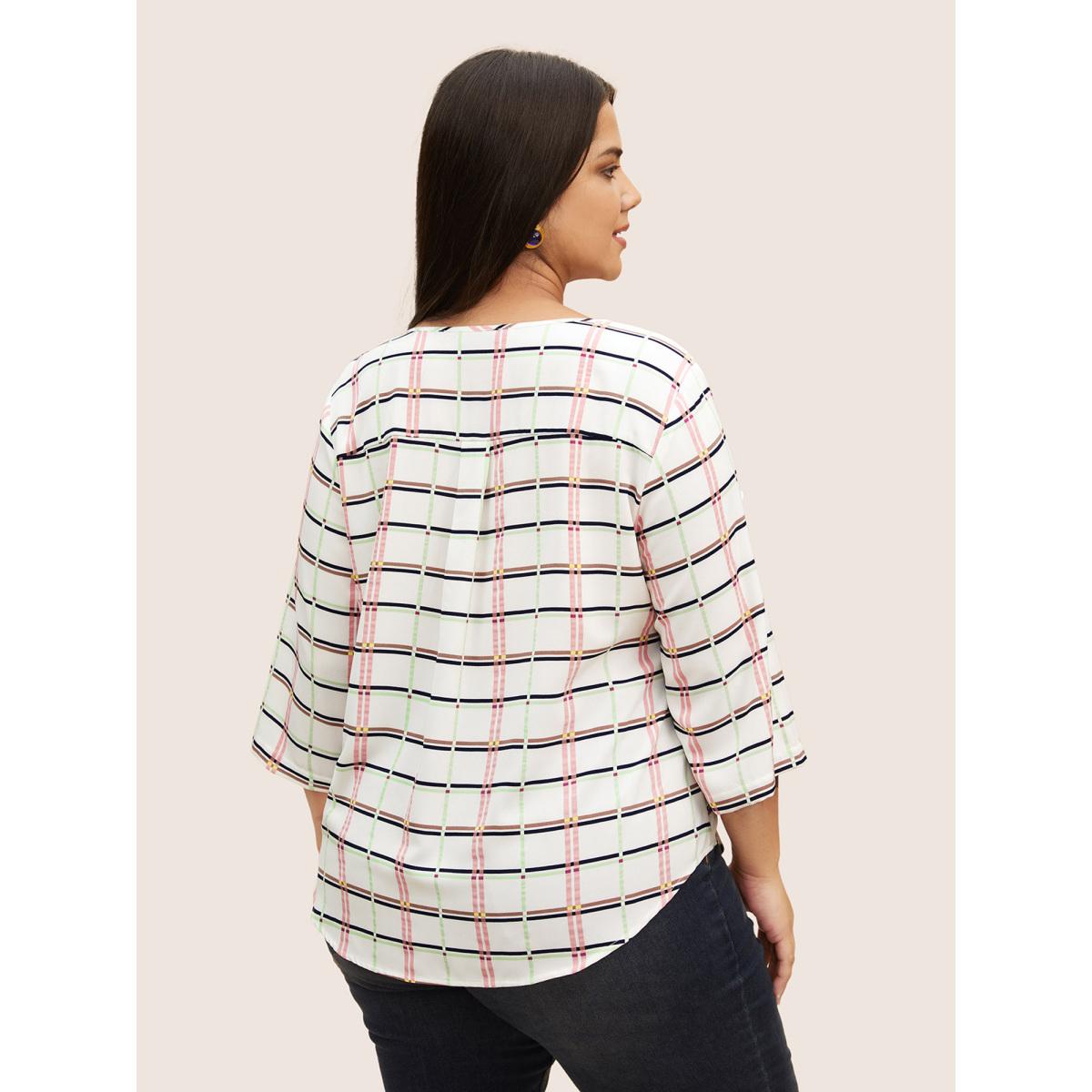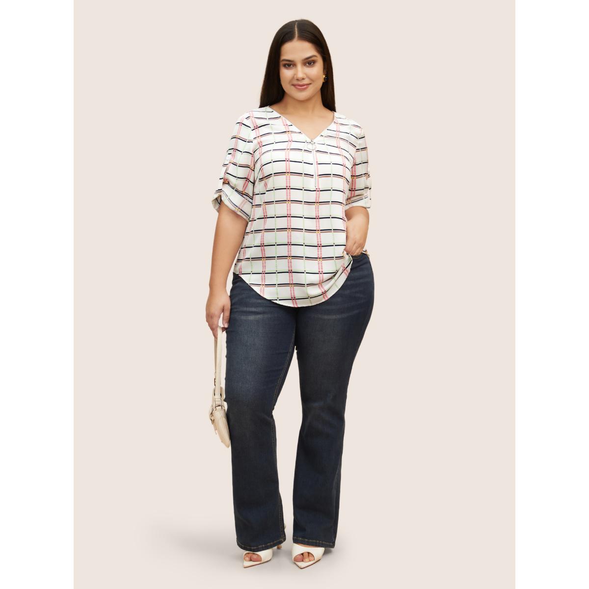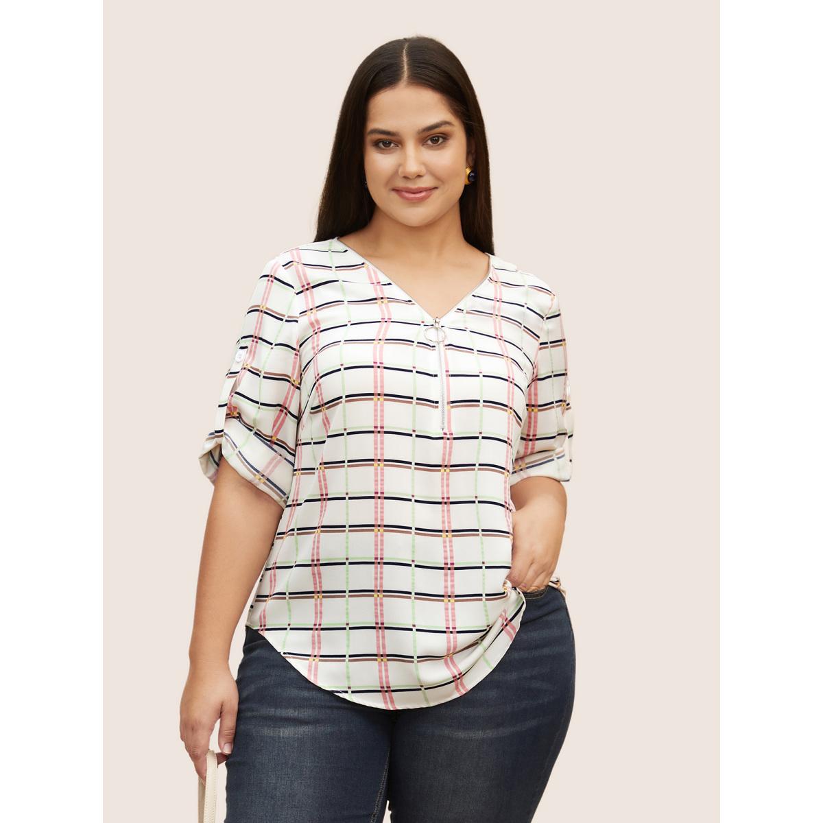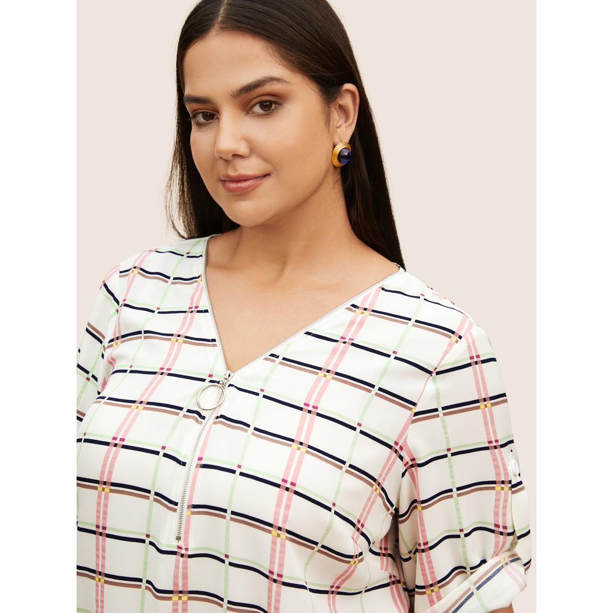 Plus Size White Plaid O Ring Zipper Tab Sleeve Blouse Women Work From Home Elbow-length sleeve V-neck Work Blouses BloomChic 30/6X
