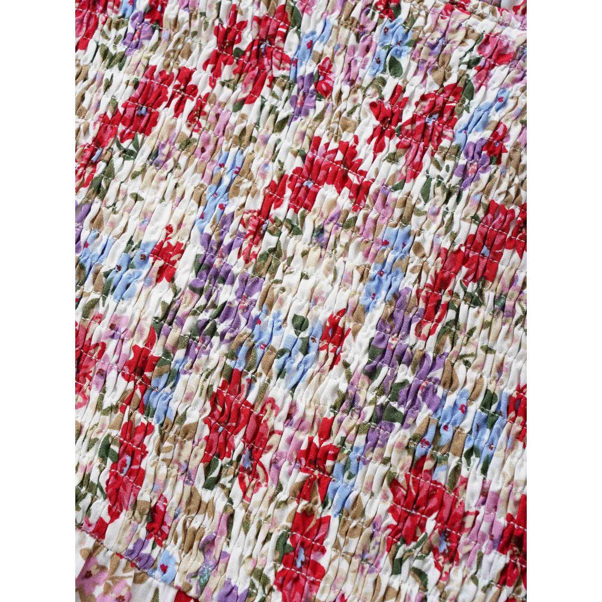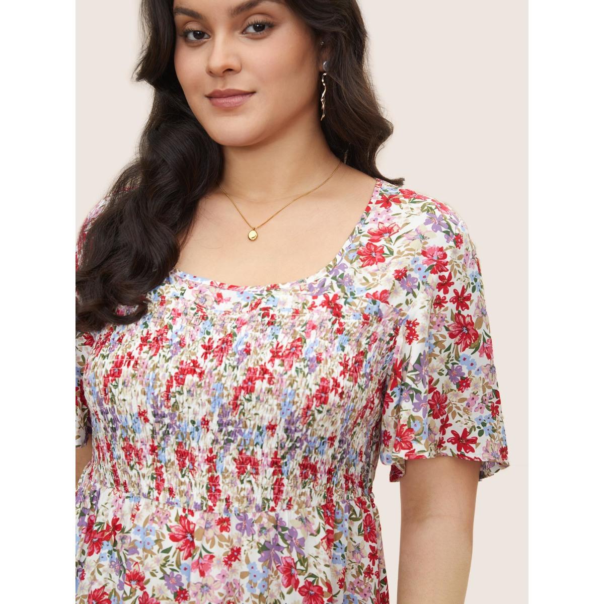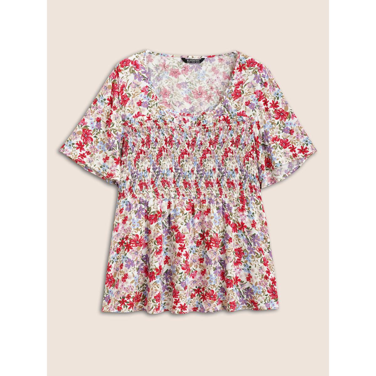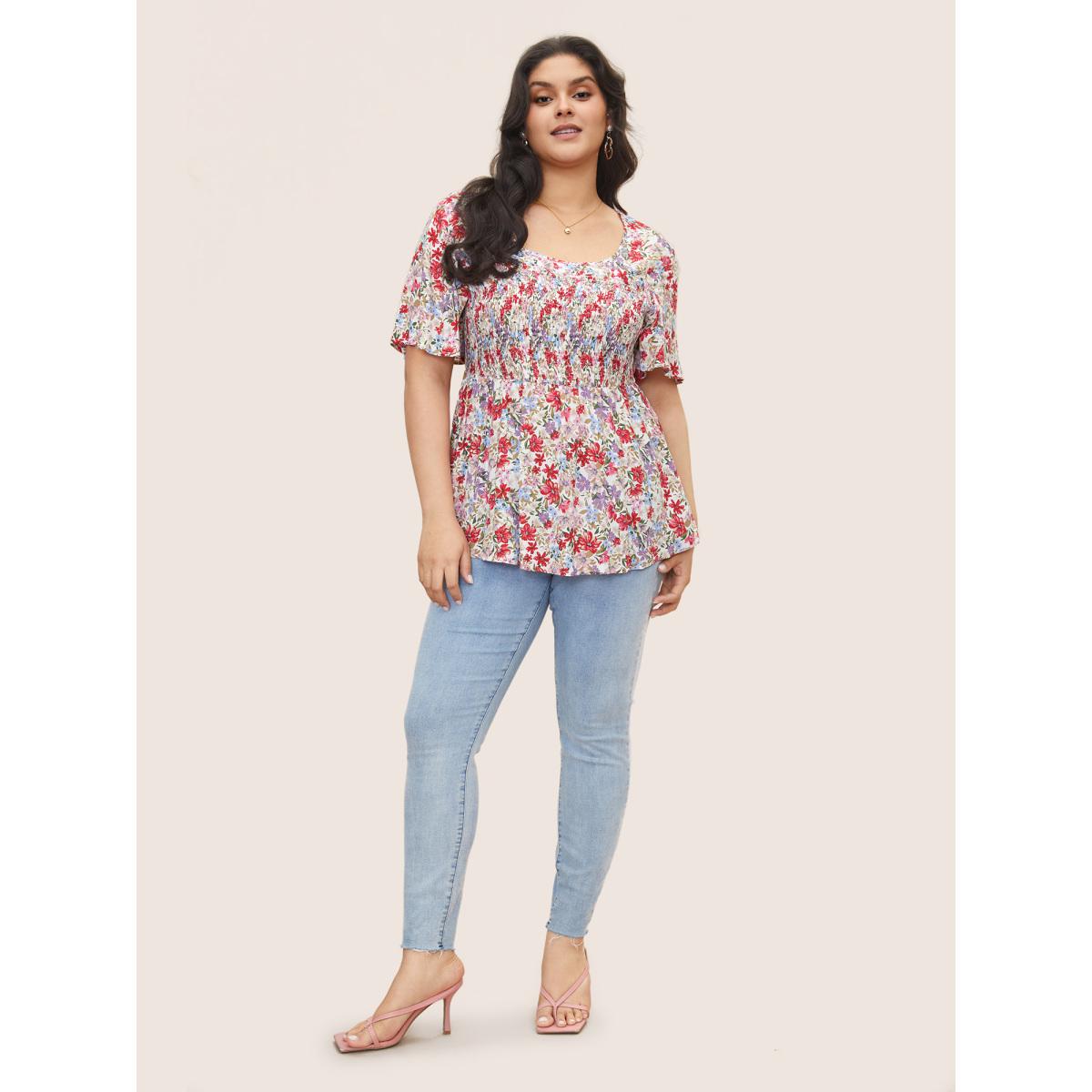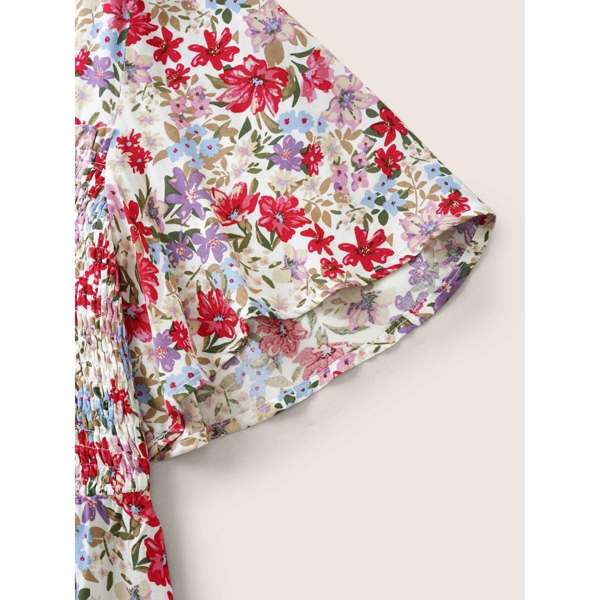 Plus Size White Rayon Floral Print Shirred Ruffle Sleeve Blouse Women Elegant Short sleeve U-neck Everyday Blouses BloomChic 14-16/1X