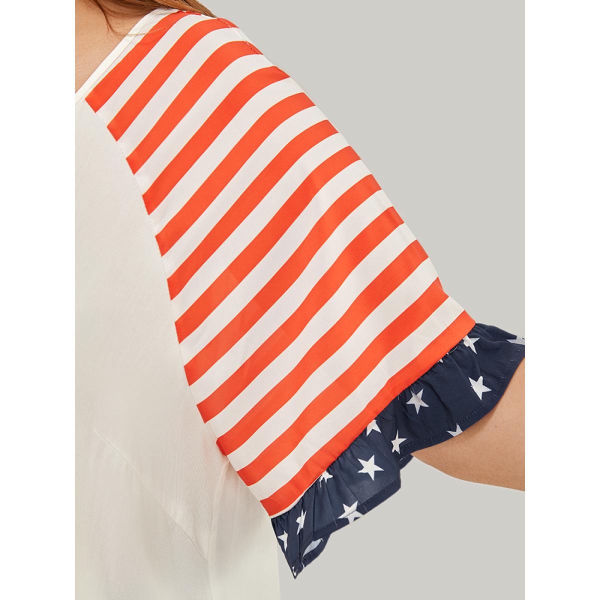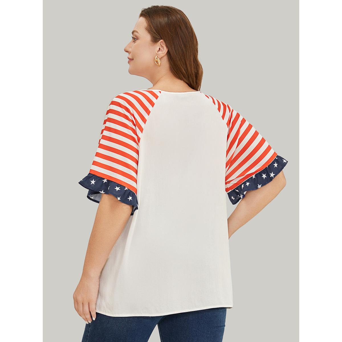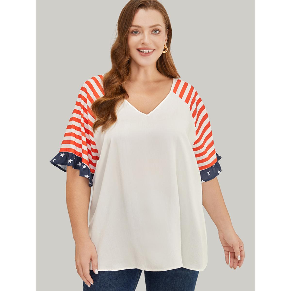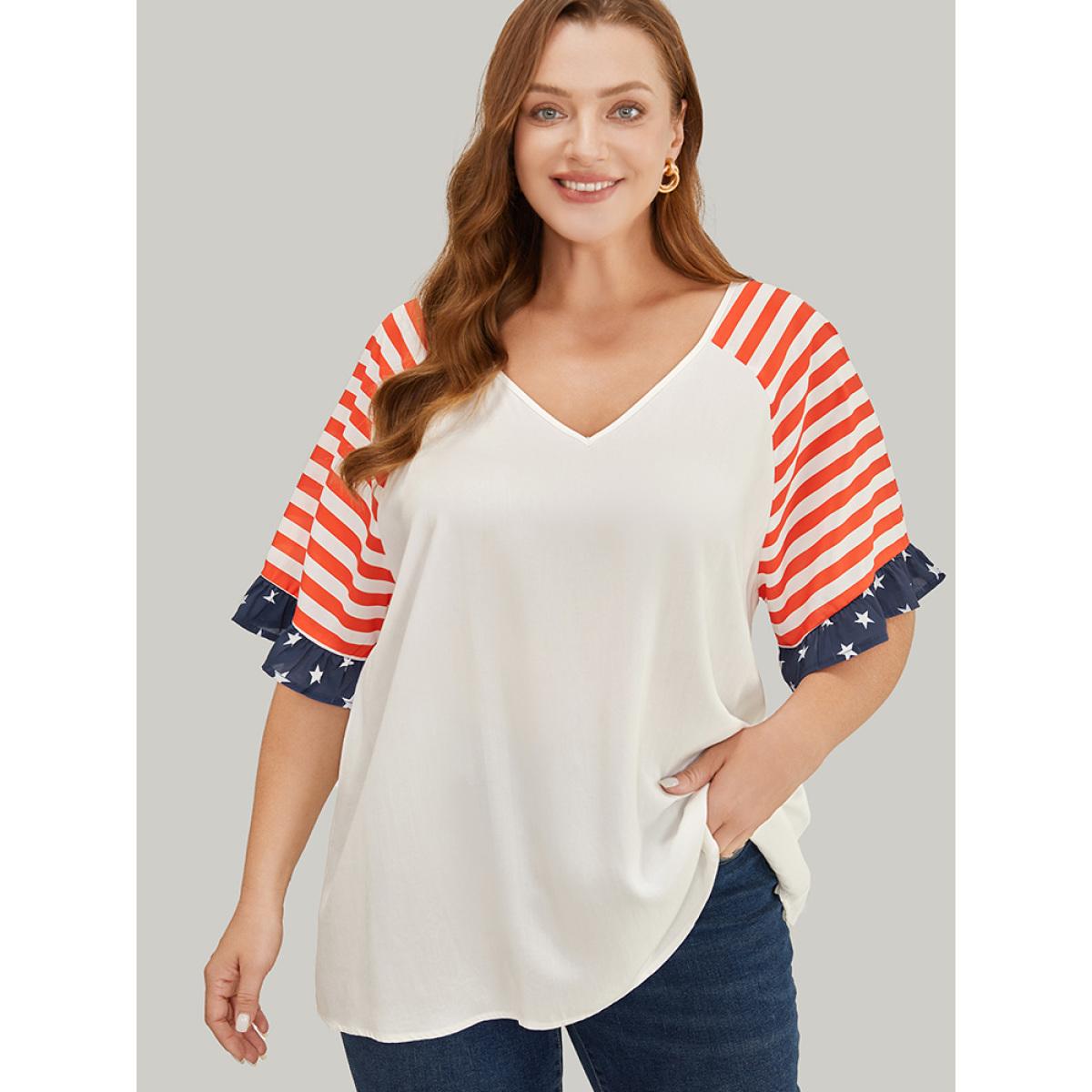 Plus Size White Star & Striped Print Raglan Sleeve Ruffle Trim Blouse Women Elegant Half Sleeve V-neck Dailywear Blouses BloomChic 18-20/2X