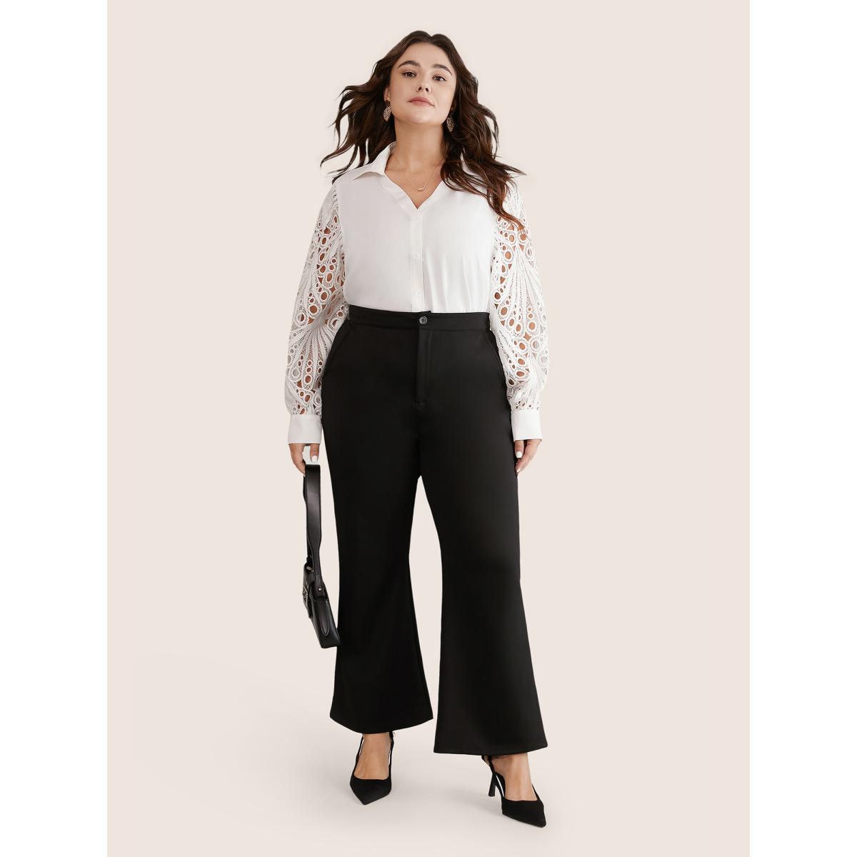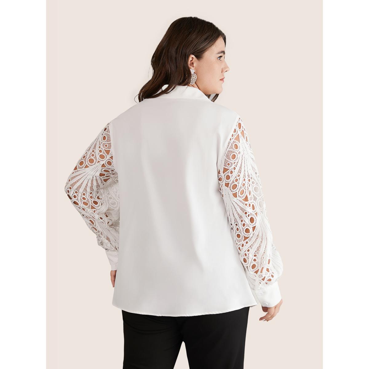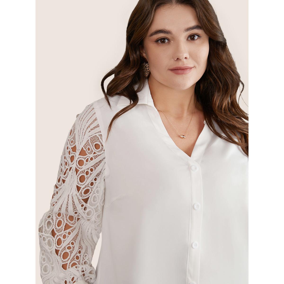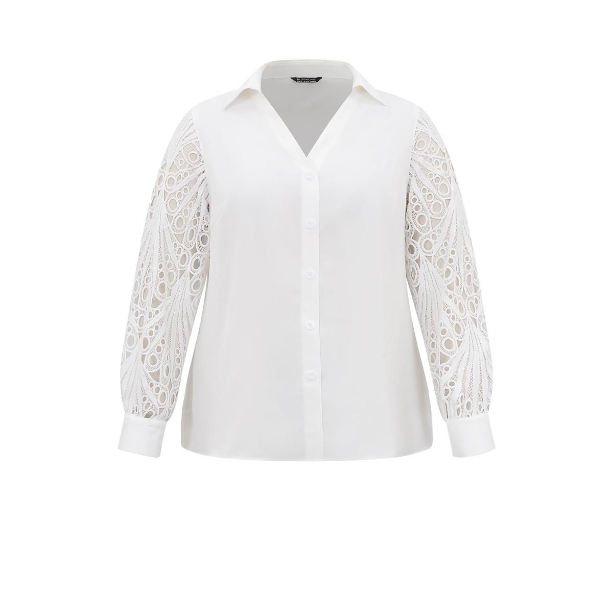 Plus Size White Static-Free Lace Panel Button Through Blouse Women Office Long Sleeve Shirt collar Party Blouses BloomChic 12/L