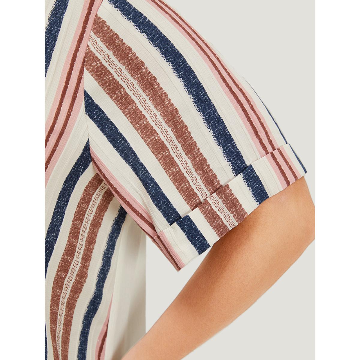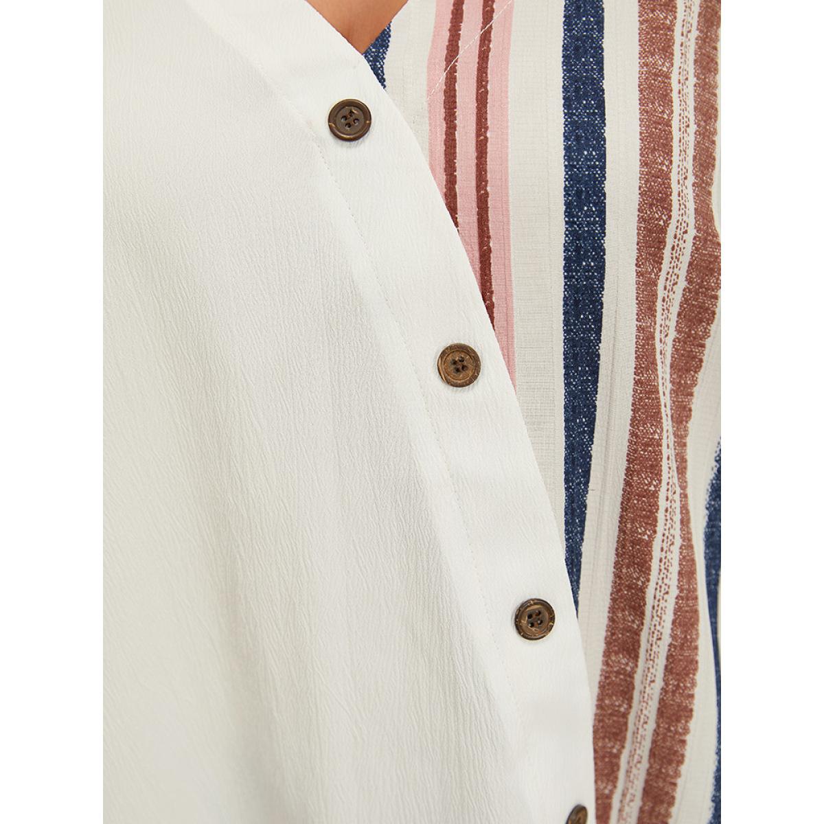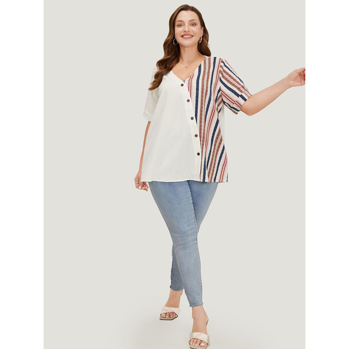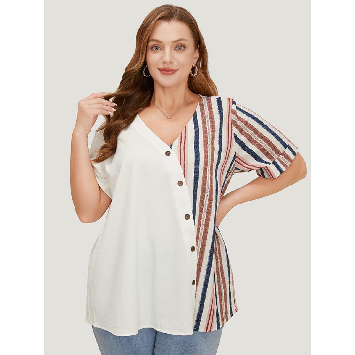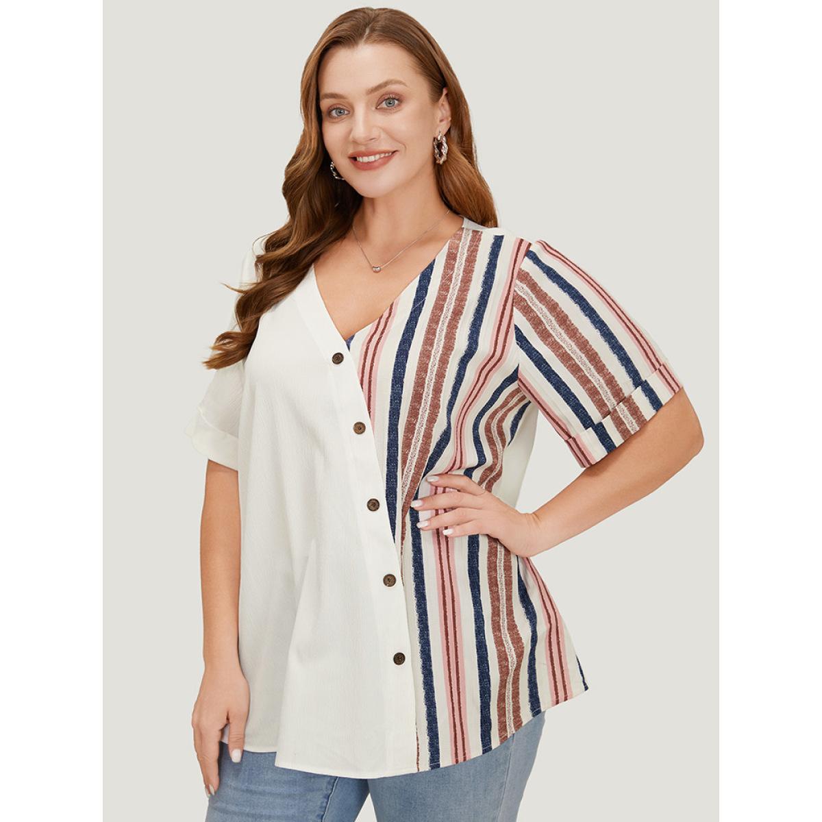 Plus Size White Striped Patchwork Roll Sleeve Button Detail Wrap Blouse Women Elegant Short sleeve V-neck Dailywear Blouses BloomChic 12/L