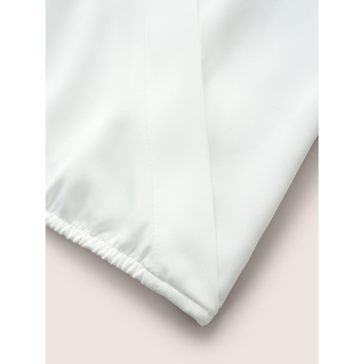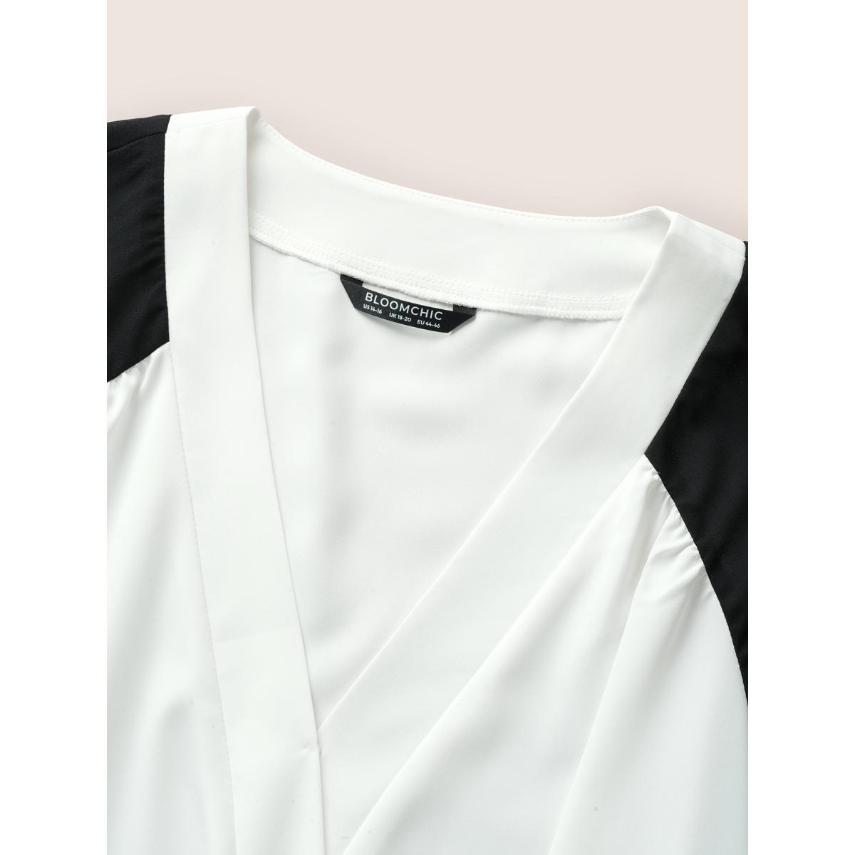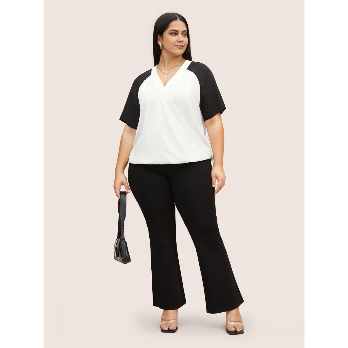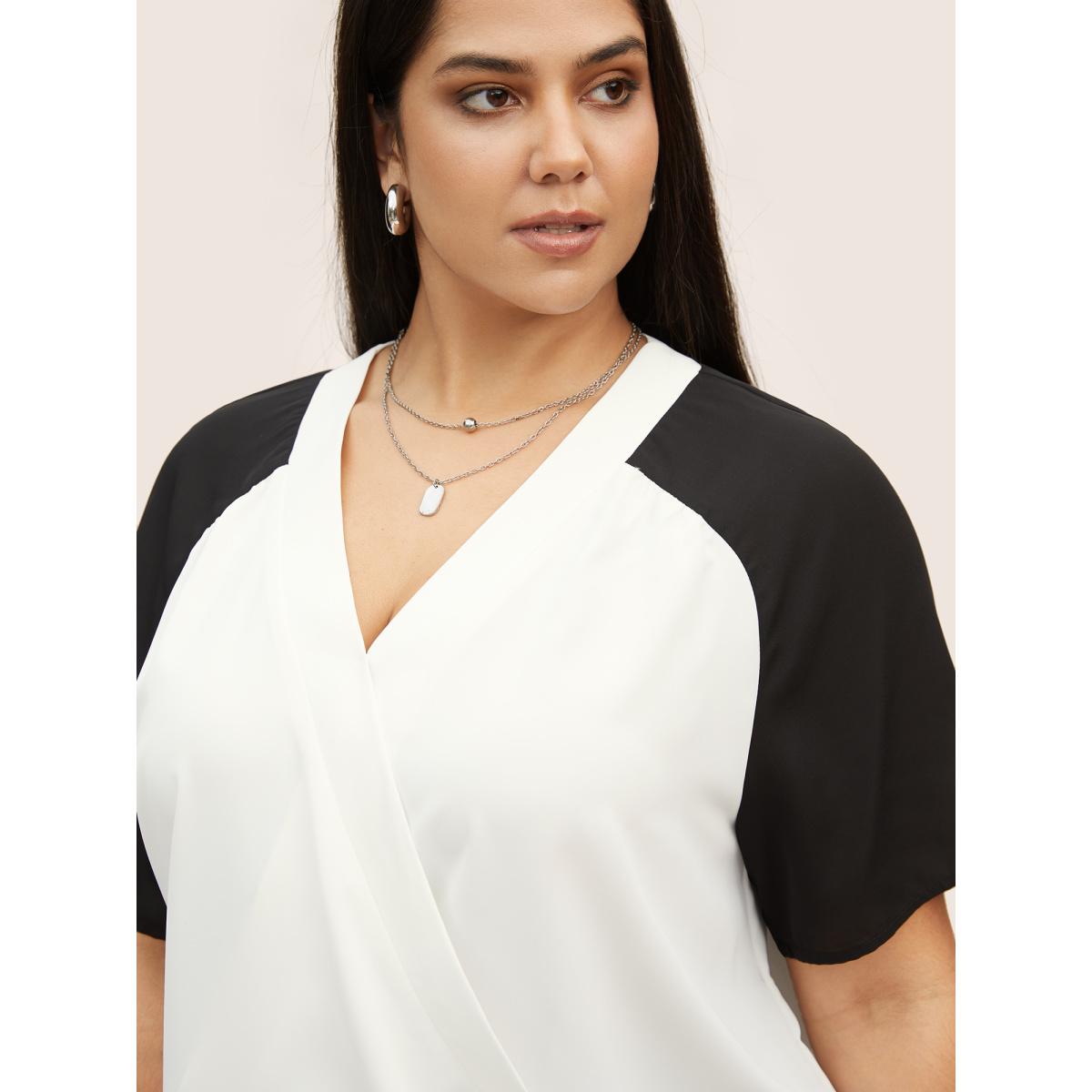 Plus Size White Two Tone Wrap Raglan Sleeve Blouse Women At the Office Short sleeve Overlap Collar Work Blouses BloomChic 10/M