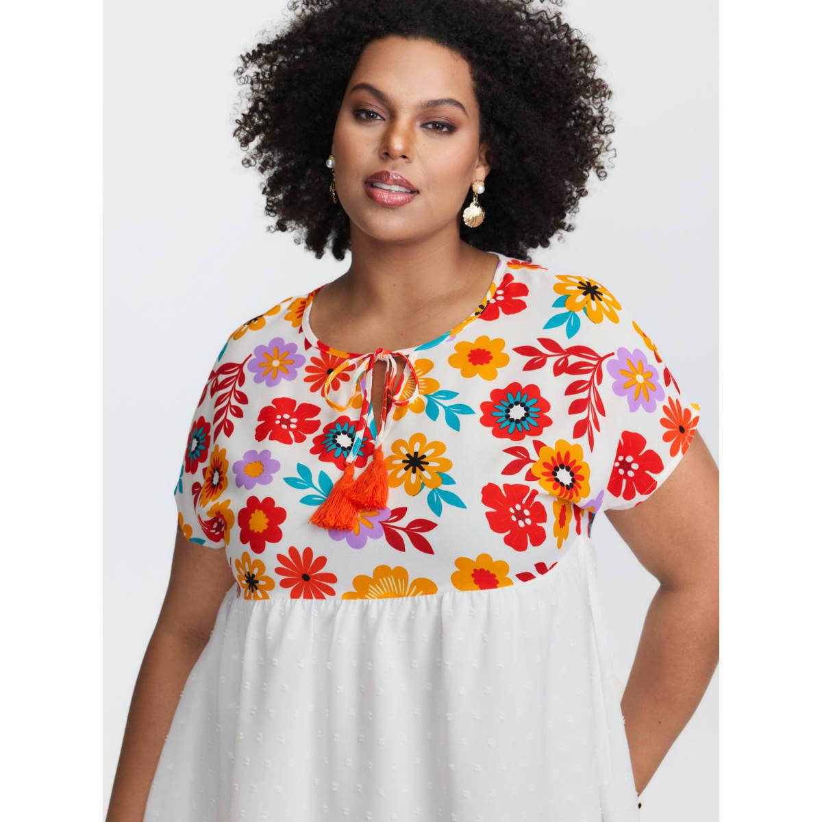 Plus Size WhiteSmoke Floral Print Neck-Tie Babydoll Top Women Resort Short sleeve Non Vacation Blouses BloomChic 28/5X