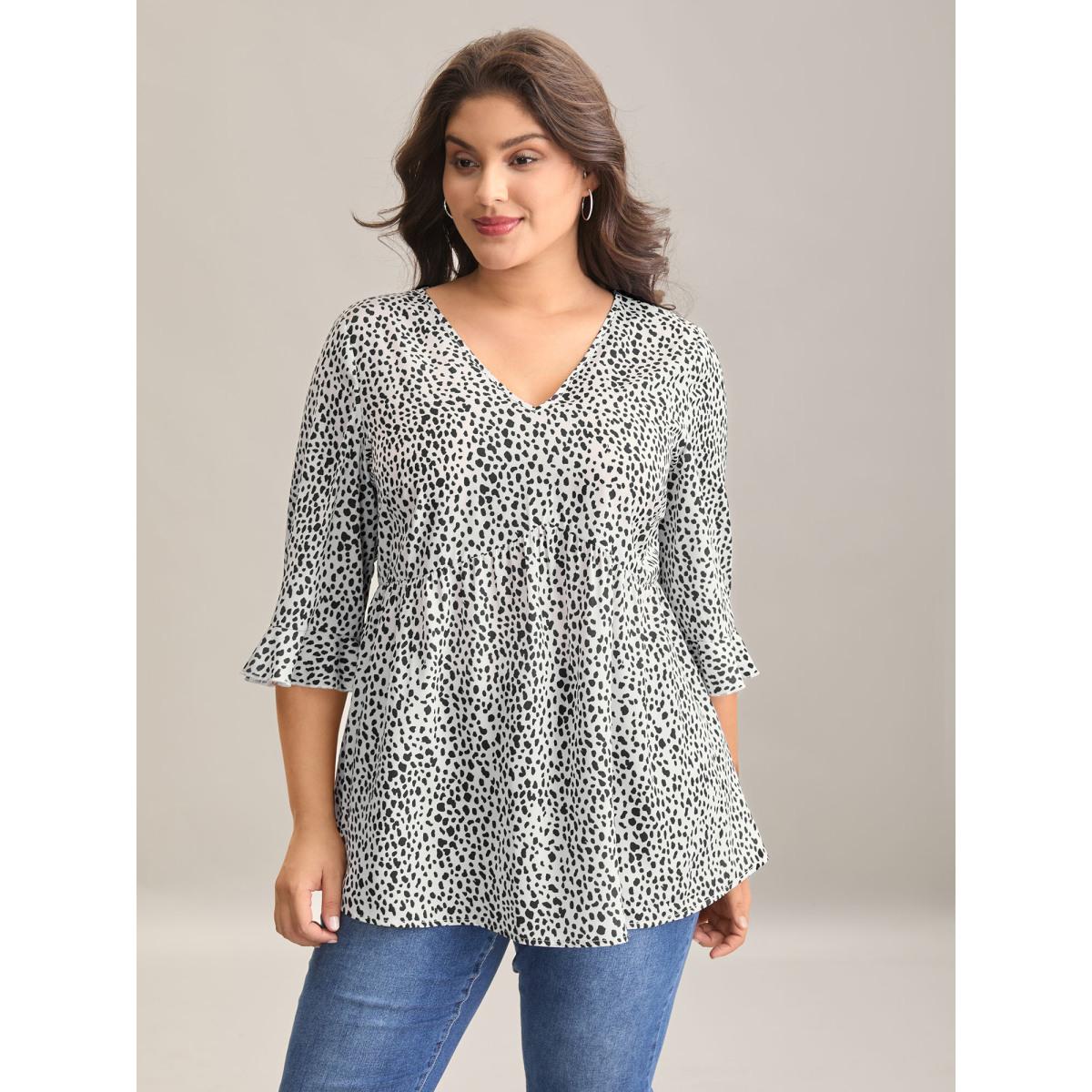 Plus Size WhiteSmoke Leopard Print Ruffled Detail V-Neck Blouse Women Leisure Elbow-length sleeve V-neck Casual Blouses BloomChic 12/L