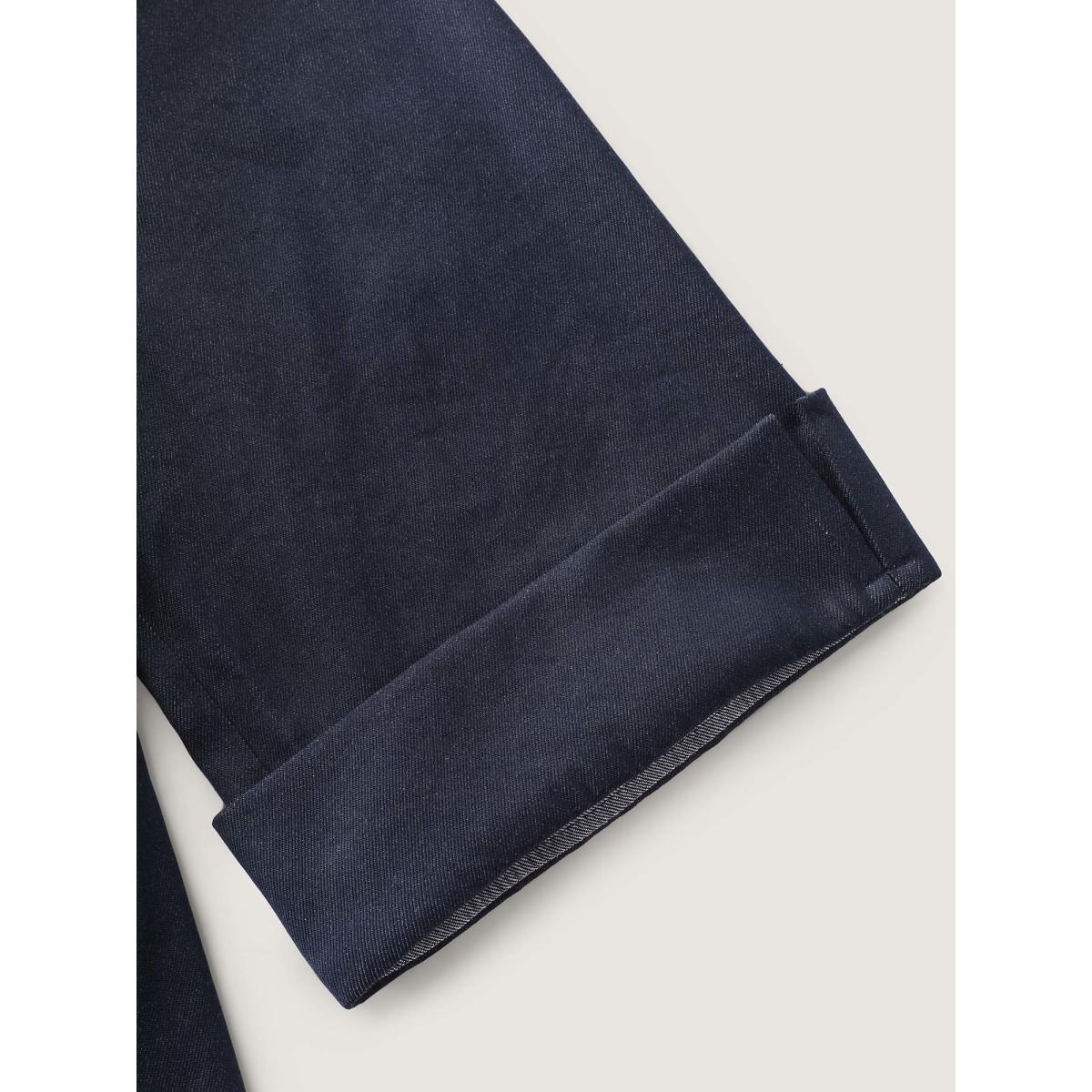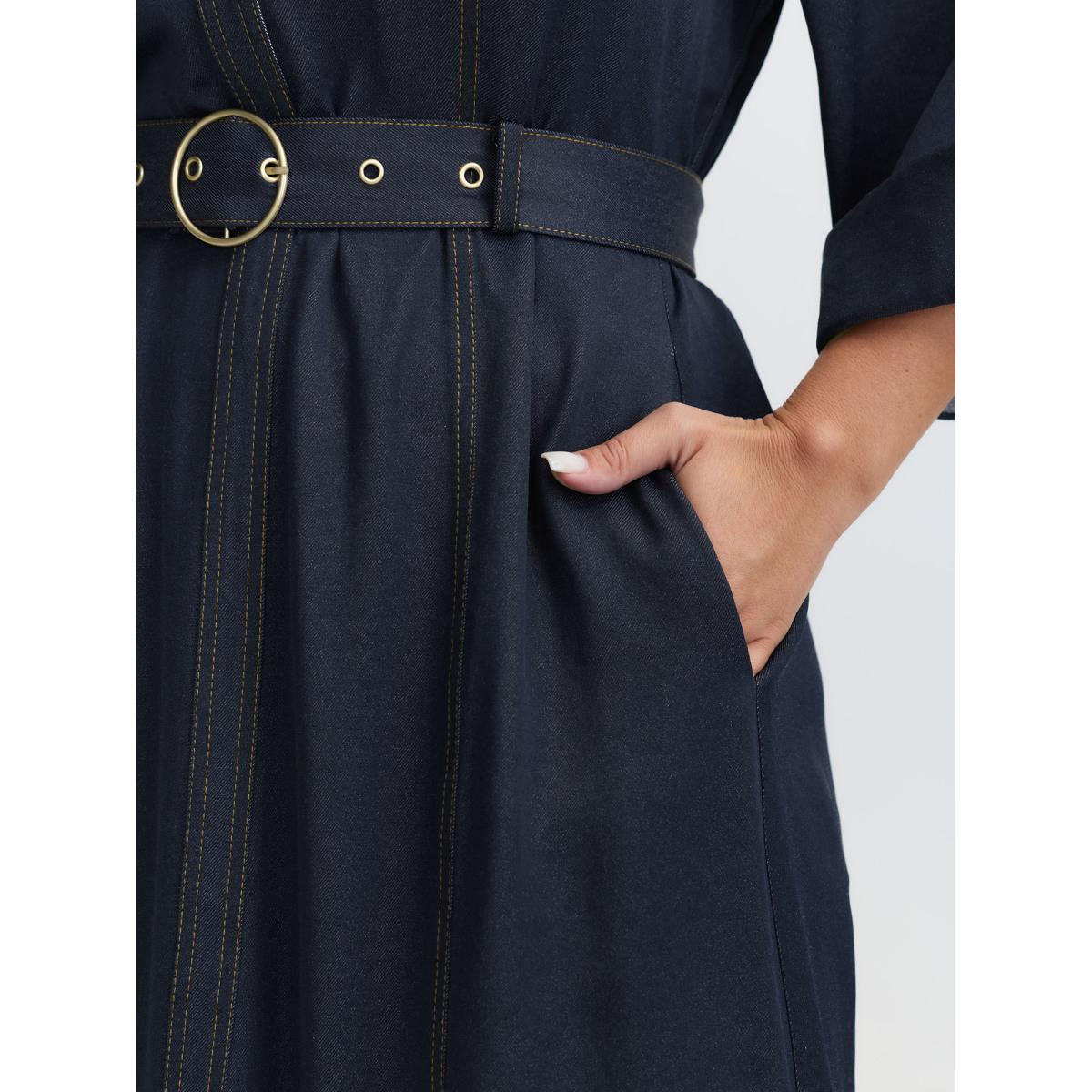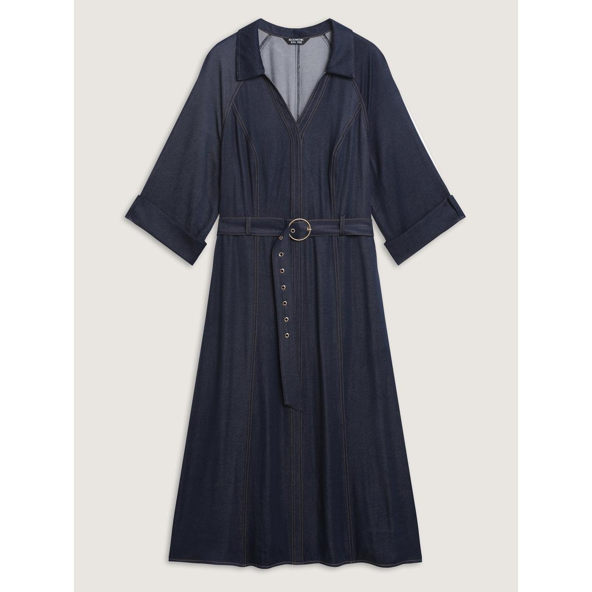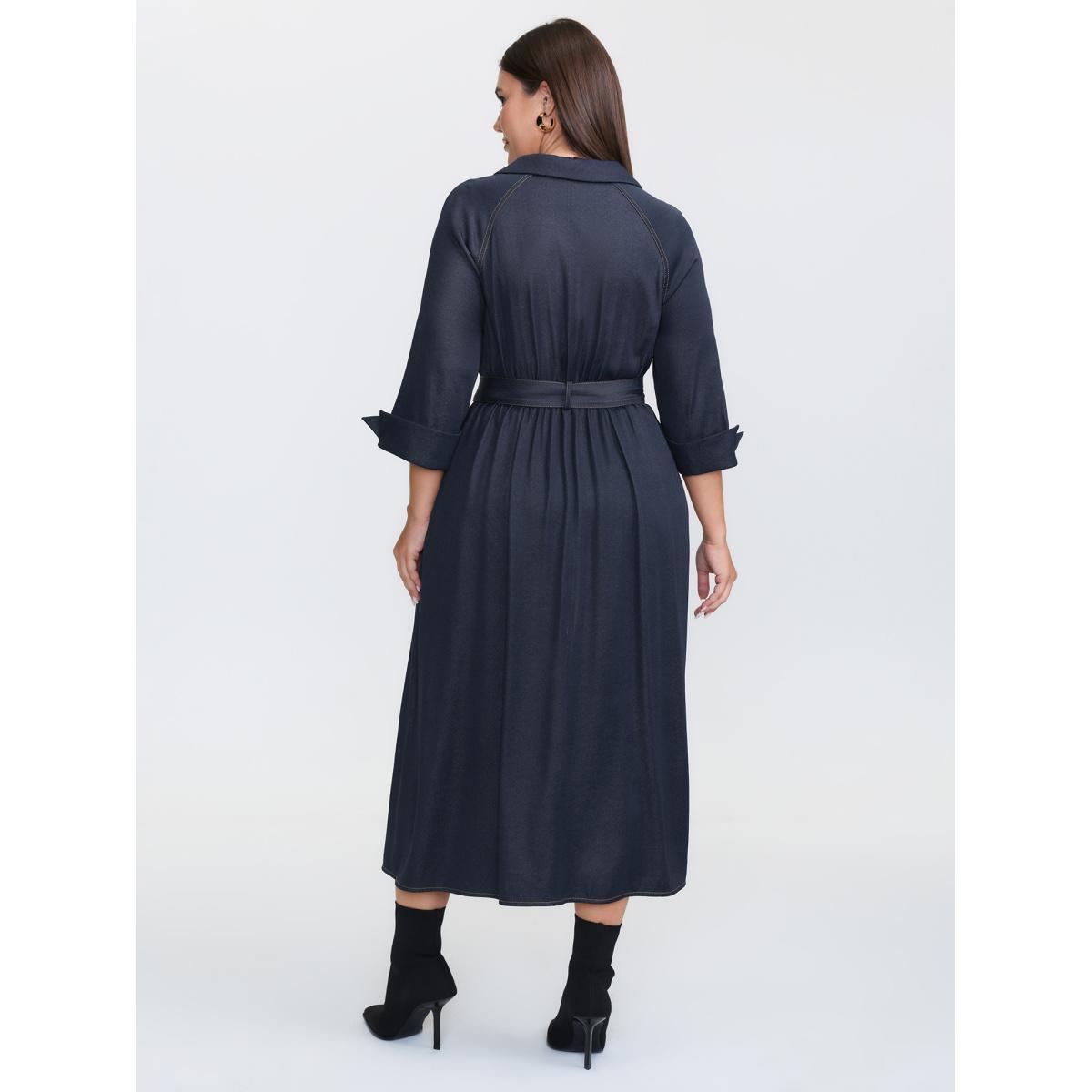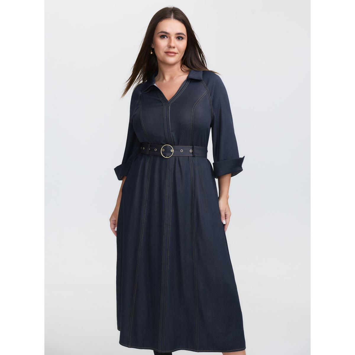 Plus Size Wide Waist Belt Denim Midi Dress Midnight Women Office V-neck Elbow-length sleeve Curvy BloomChic 18-20/2X