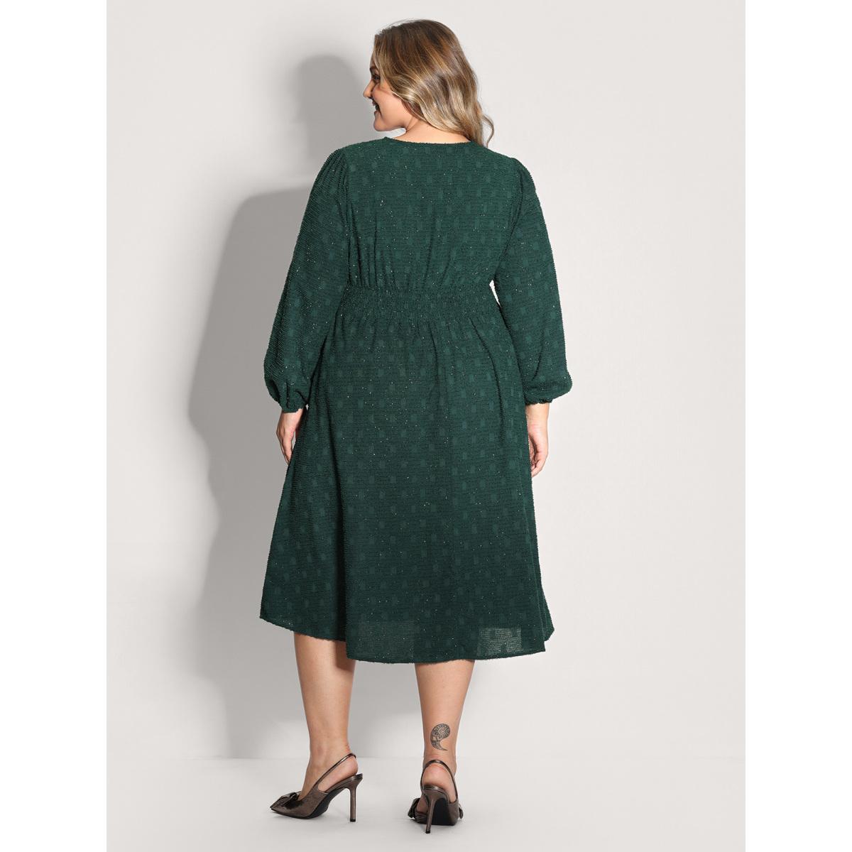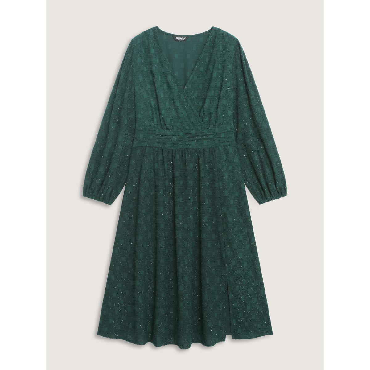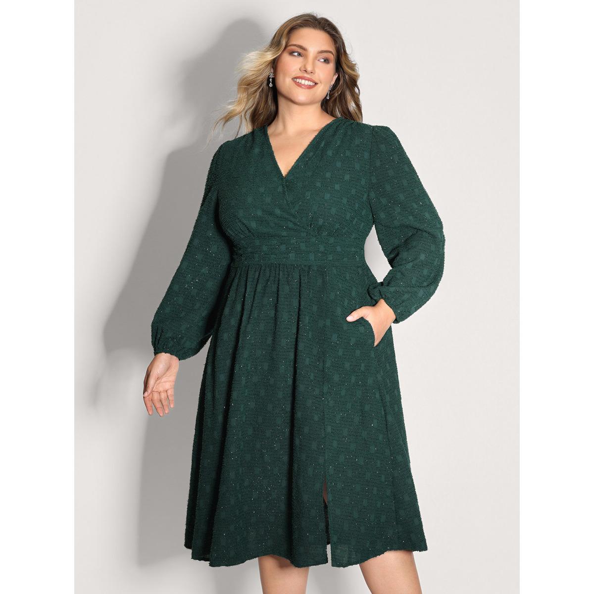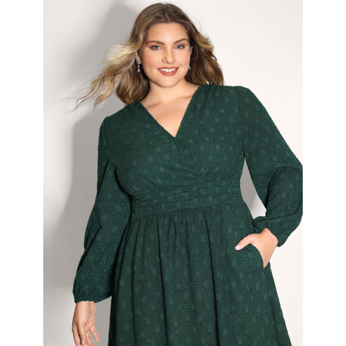Plus Size Woven Pleated Waist-Defining Wrap Midi Dress DarkGreen Women Party&Cocktail Overlapping Overlap Collar Long Sleeve Curvy BloomChic 22-24/3X