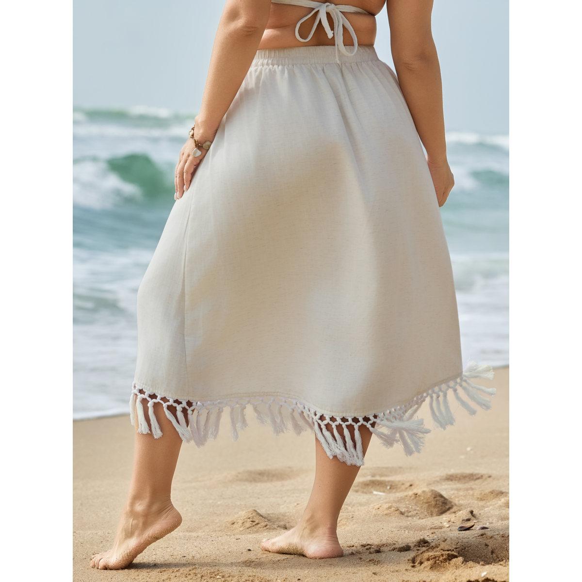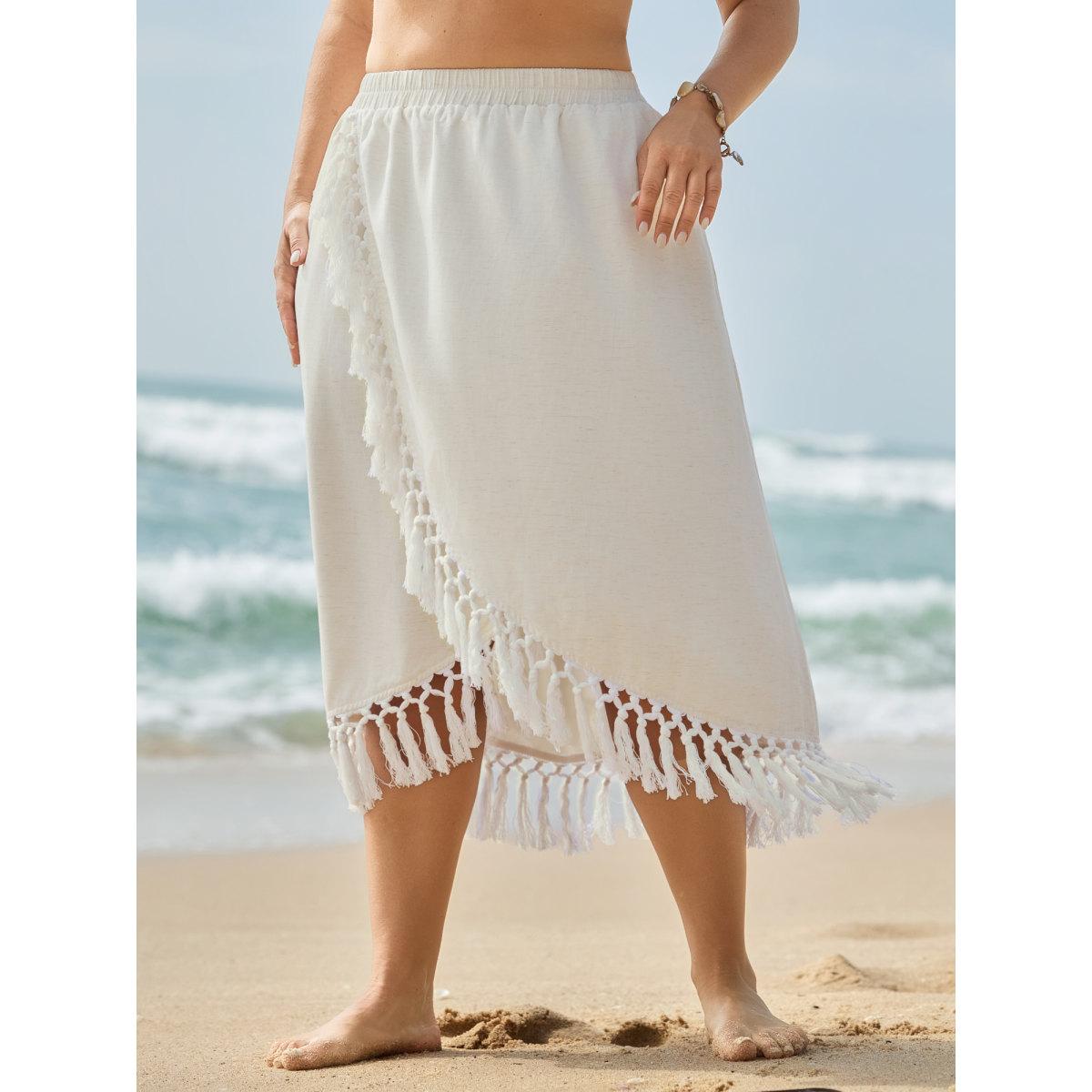 Plus Size Wrap Fringe Hem Maxi Skirt Women Originalwhite Resort Overlapping No stretch Side seam pocket Vacation Skirts BloomChic 26/4X