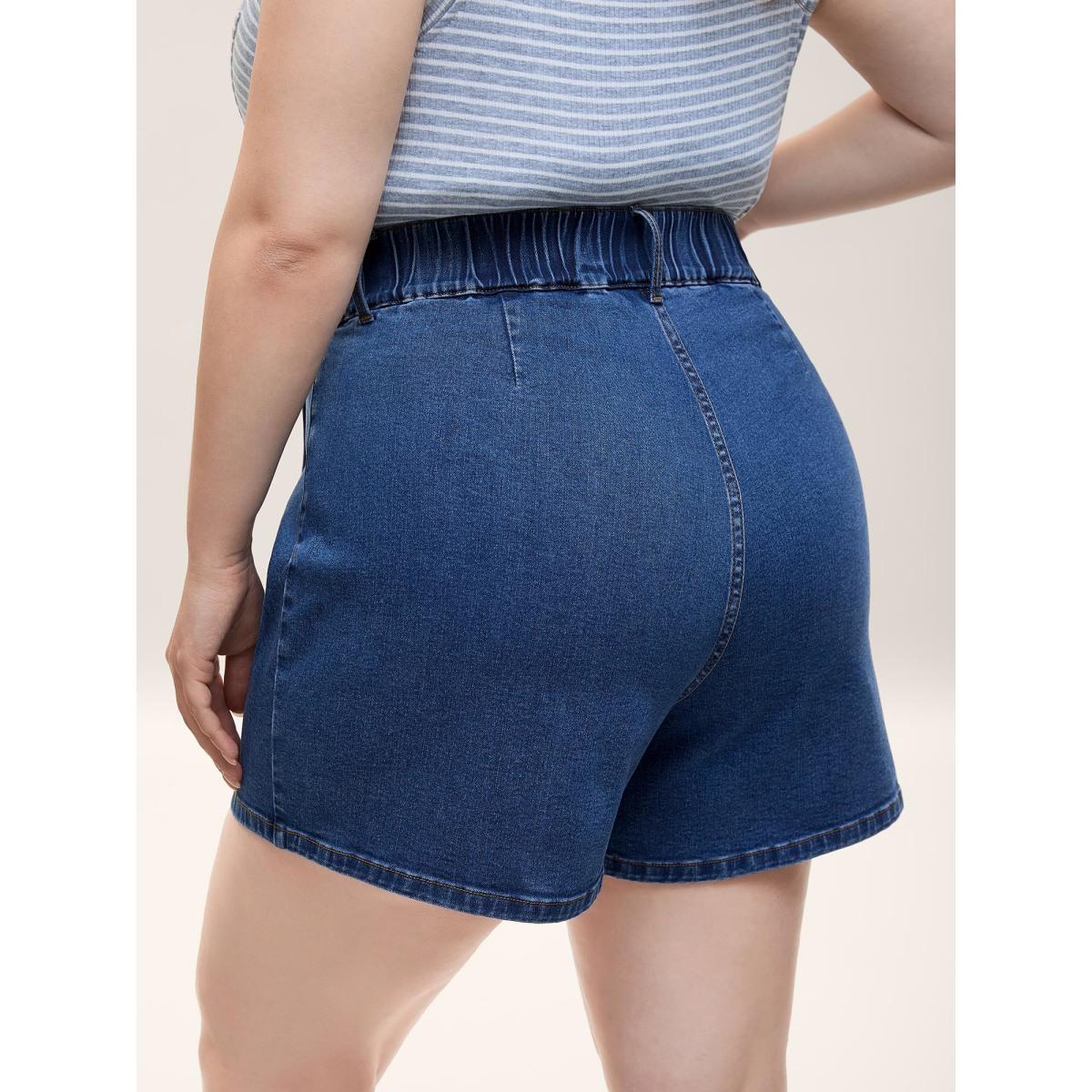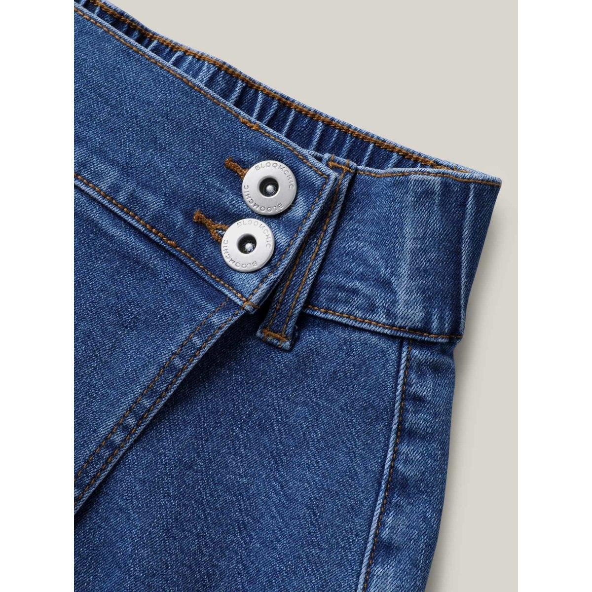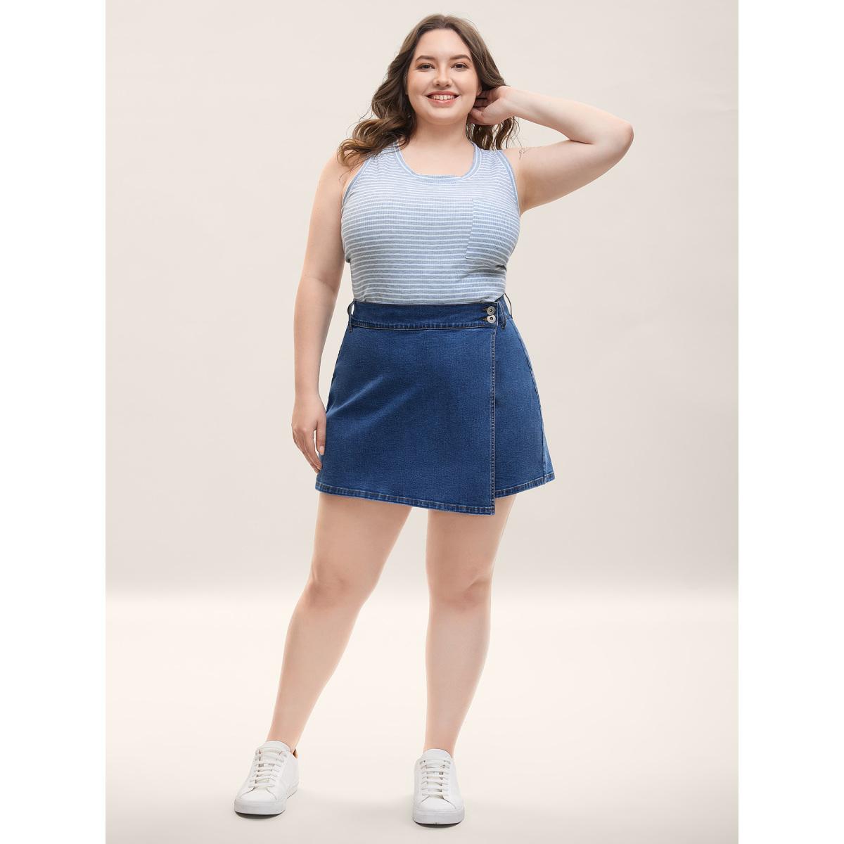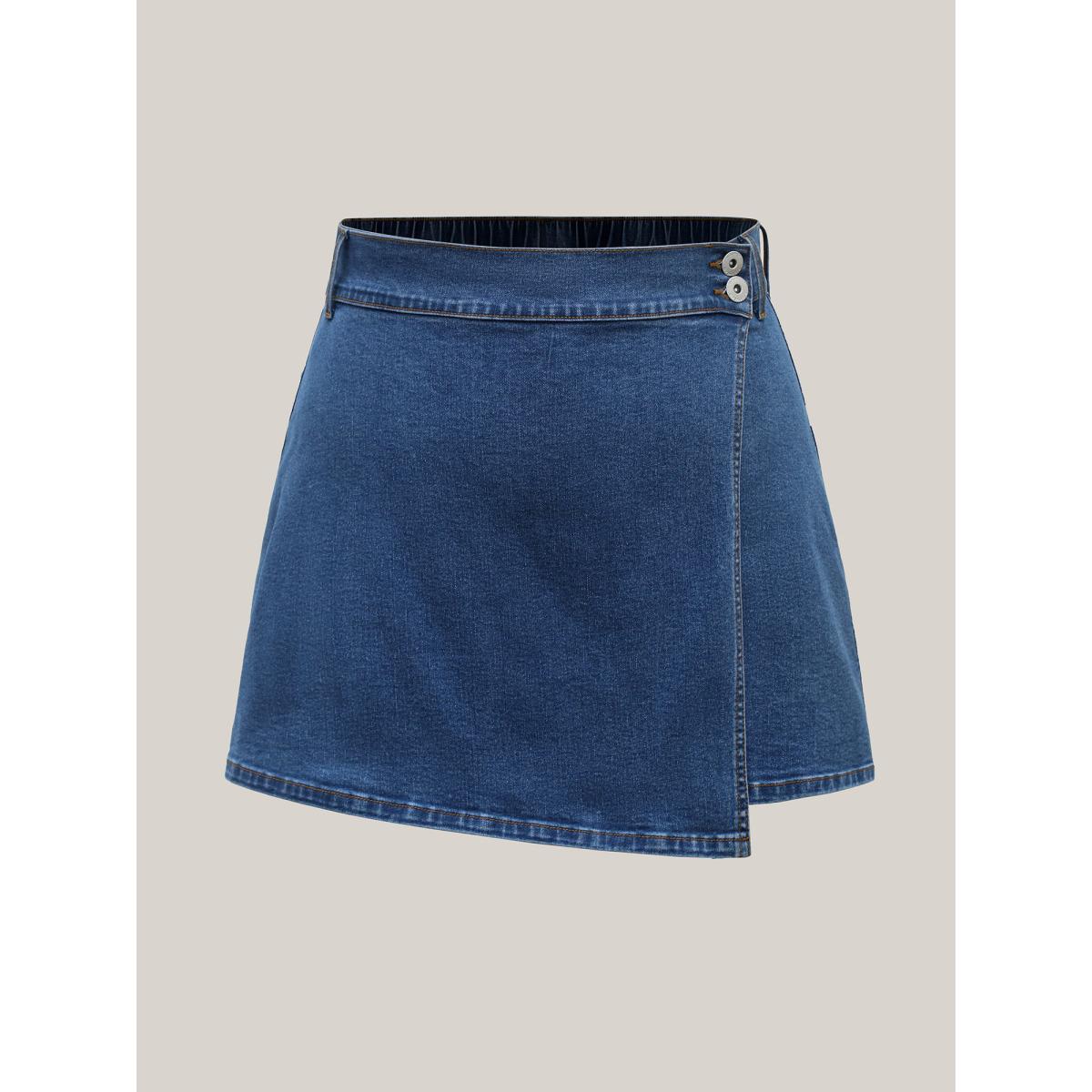 Plus Size Wrap Front Button Detail Denim Skort Women Midblue Overlapping Medium stretch Everyday-Casual Slanted pocket Denim Shorts BloomChic 18/2X