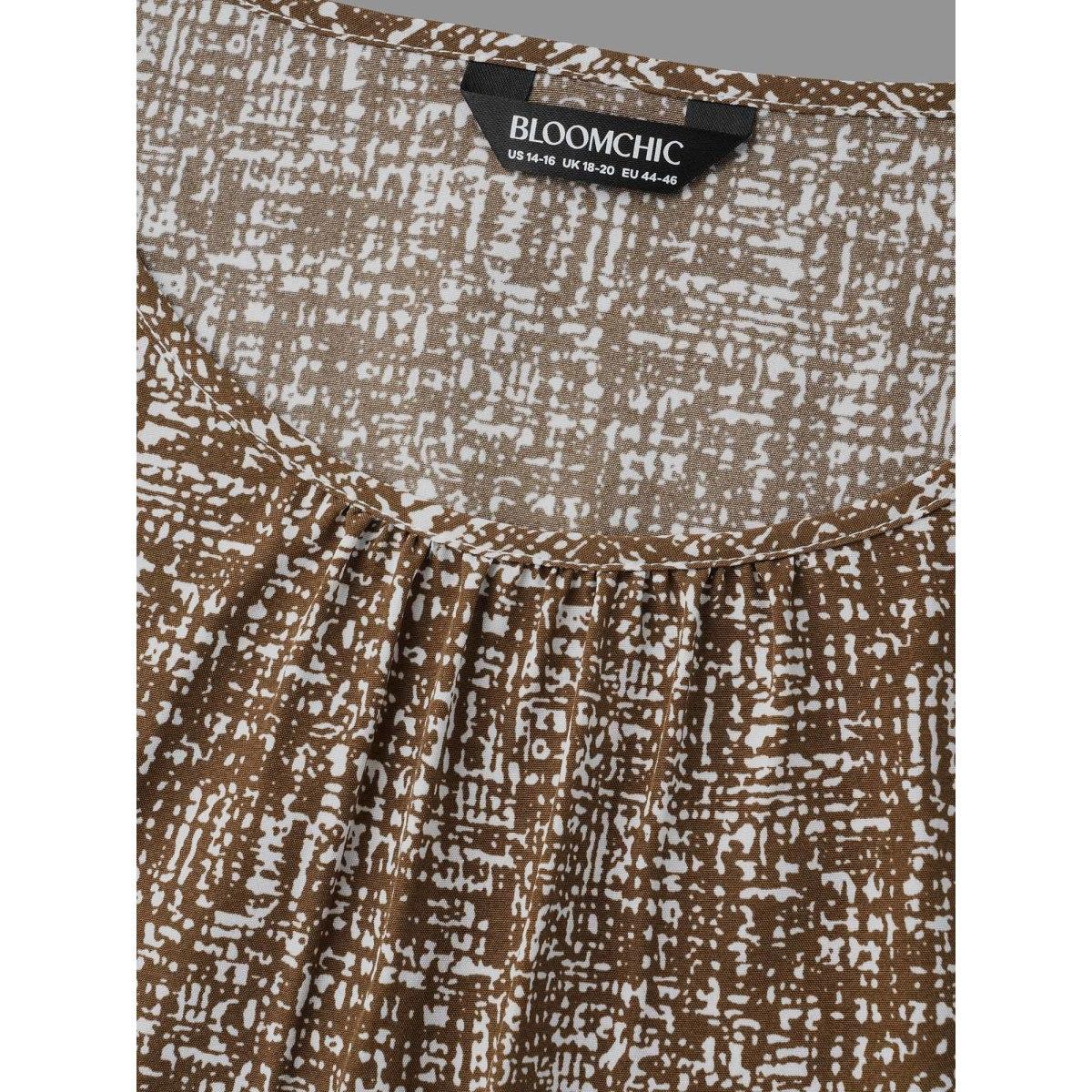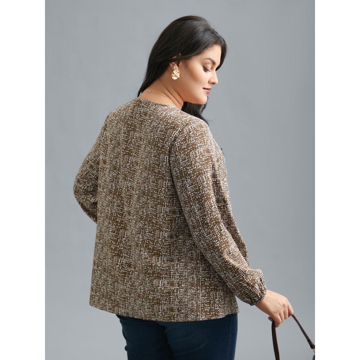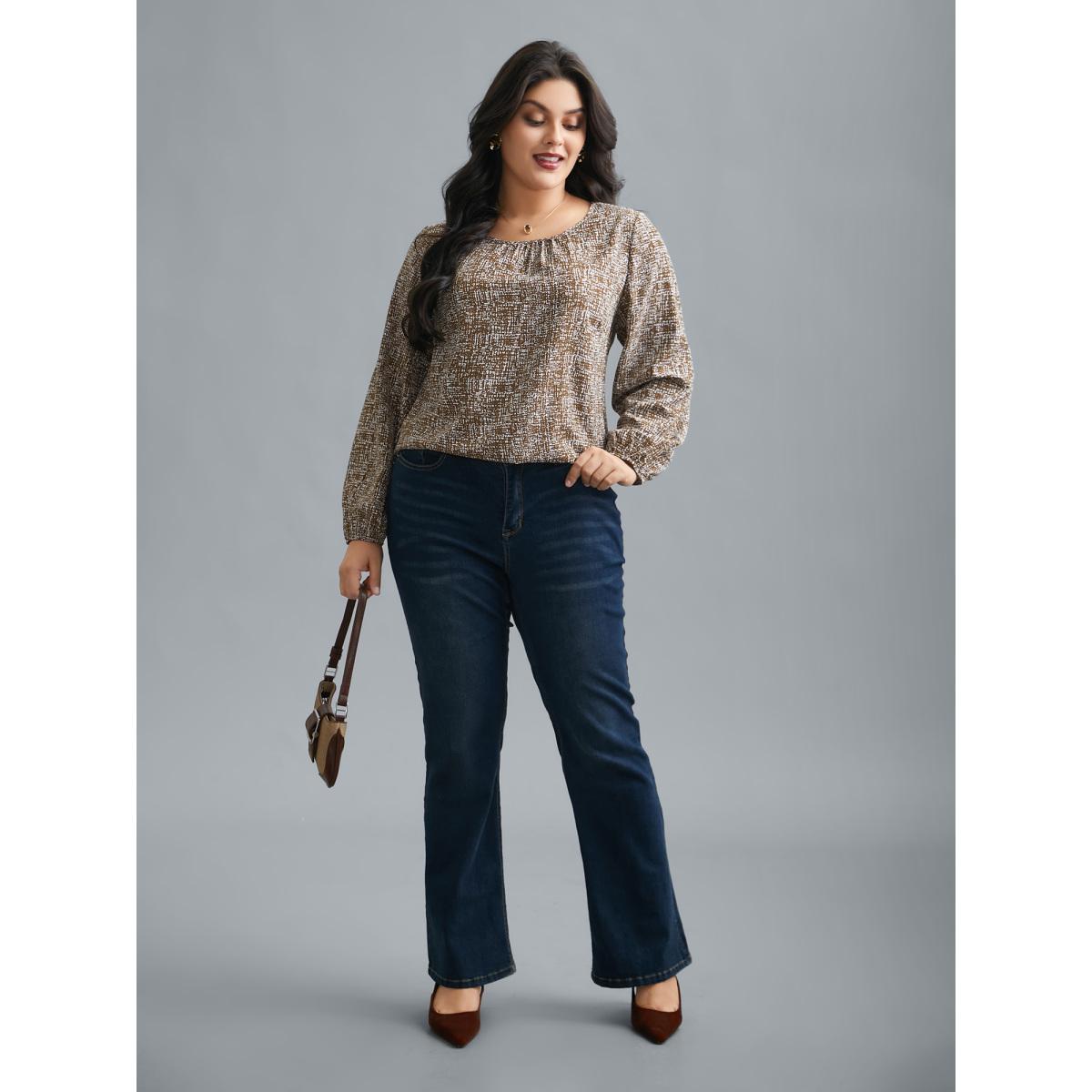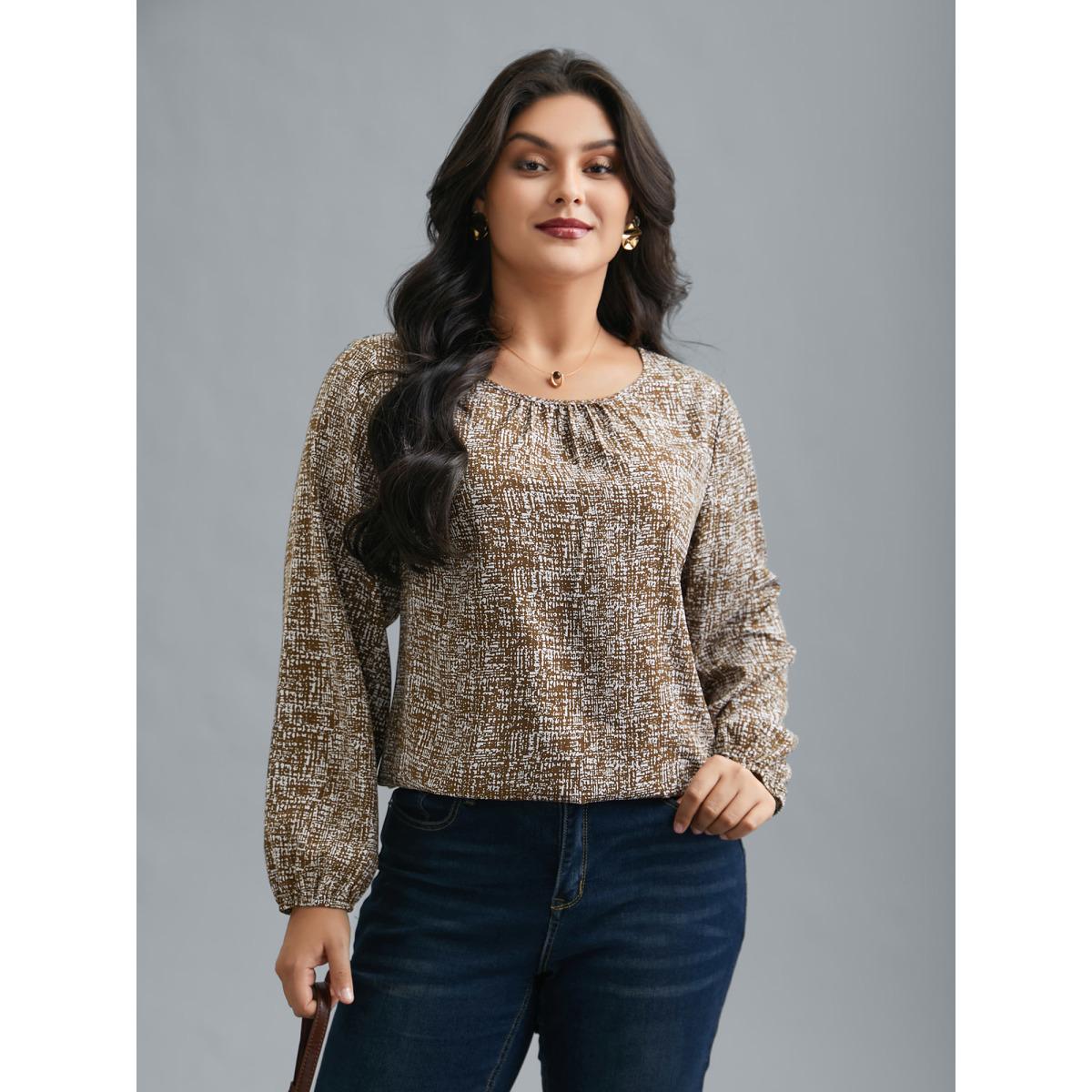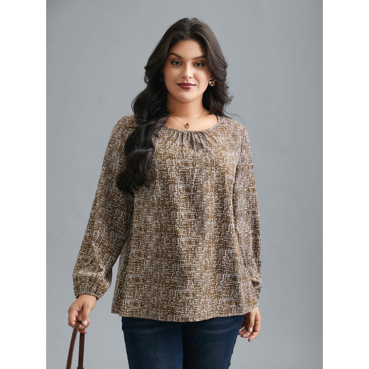 Plus Size Yellowishbrown Crew Neck Geometric Print Gathered Blouse Women At the Office Long Sleeve Round Neck Office Blouses BloomChic 14-16/1X